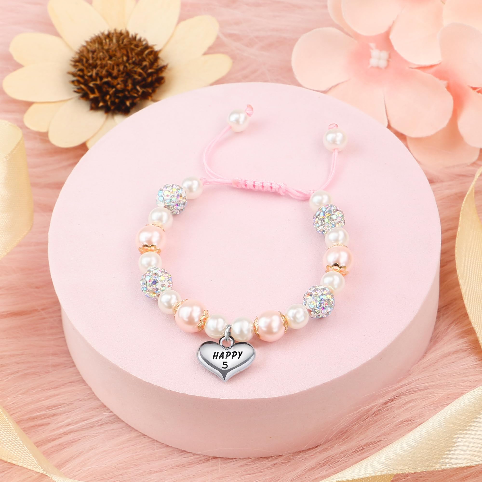 High-quality material: 5th birthday gifts for girls feature a drawstring design for adjustability (4.7-7.5 inches) making it fit most girls. The mirror polishing craft of the pendant enhances its durability and beauty, while the heart charm engraving adds sentimental value. Besides, sparkly rhinestone crystal balls, pink & white pearls may bring her good luck, and make all her wishes and dreams come true