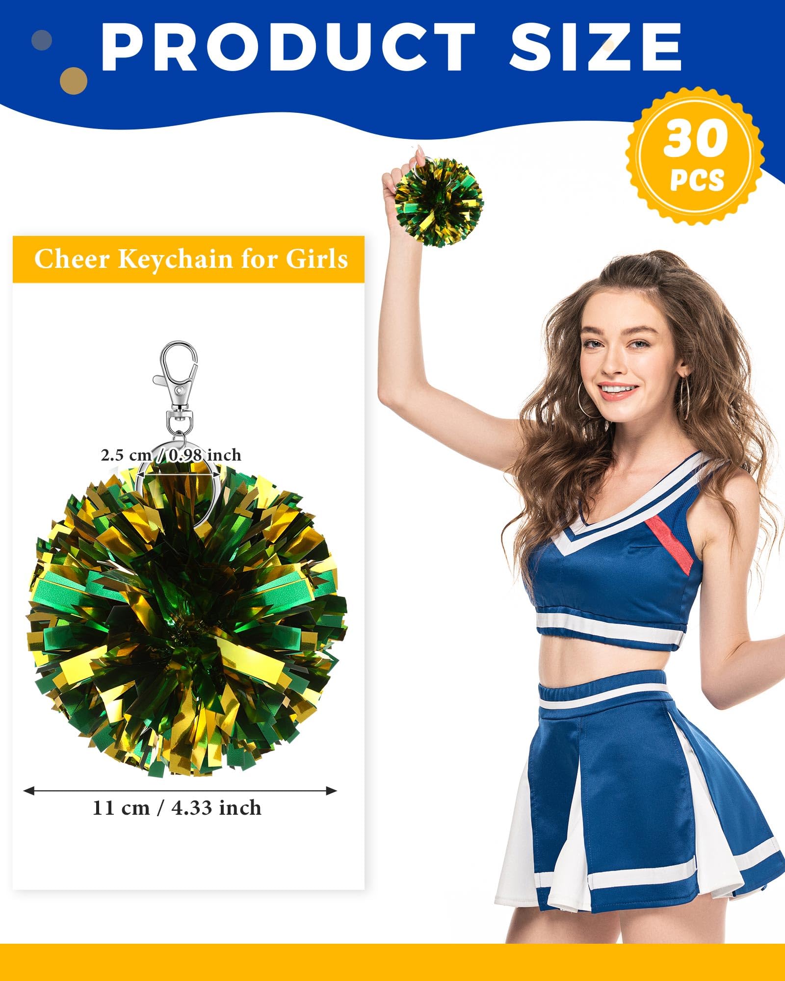 Sturdy Material and Vibrant Colors: these pom pom keychains are made of quality plastic and metal for durability, and feature nonfading, shimmering metallic green gold foil; They catch the eye, boost cheerleading spirit, and show your strong support for the team