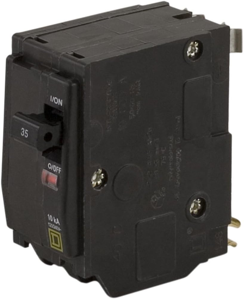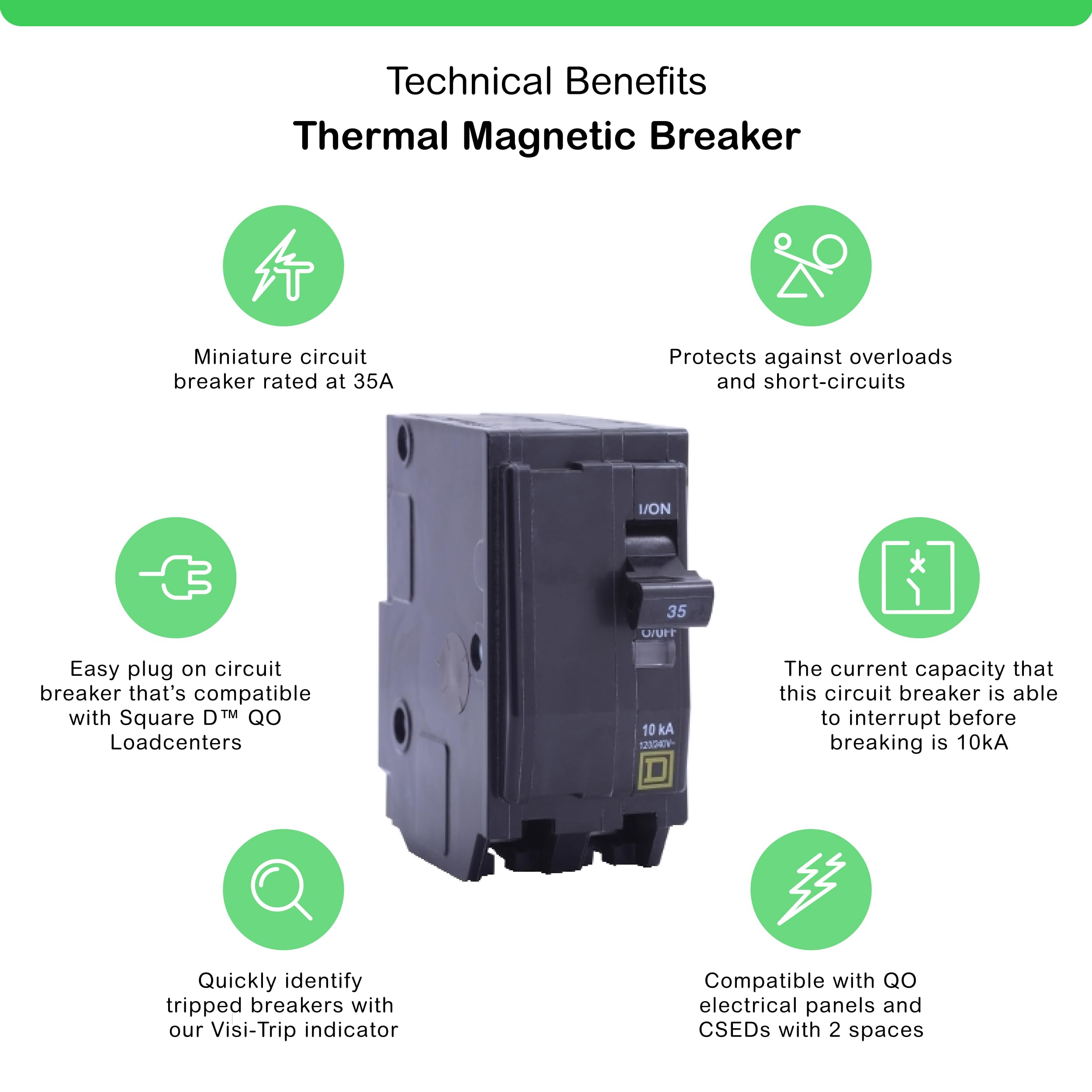The Square D by Schneider Electric QO 35 Amp Two-Pole Circuit Breaker is intended for overload and short-circuit protection of your electrical system. The ANSI-certified and UL-listed unit is rated for 120/240 VAC and 10,000 AIR. All QO circuit breakers are equipped with the exclusive Visi-Trip indicator. When a QO Visi-Trip circuit breaker trips, the handle snaps to a midpoint position between "OFF" and "ON" and a highly visible, red indicator easily identifies the tripped breaker. This enables you to easily distinguish which breaker has tripped in a load center that may contain up to 42 different circuit breakers. QO circuit breakers have features no other manufacturer can offer. They come in many different sizes and can meet the needs of virtually every function in your home or business. These types of quality, industry exclusive products keep the Square D brand ahead of the competition and are builders' and electrical contractors' first choice in electrical protection.
