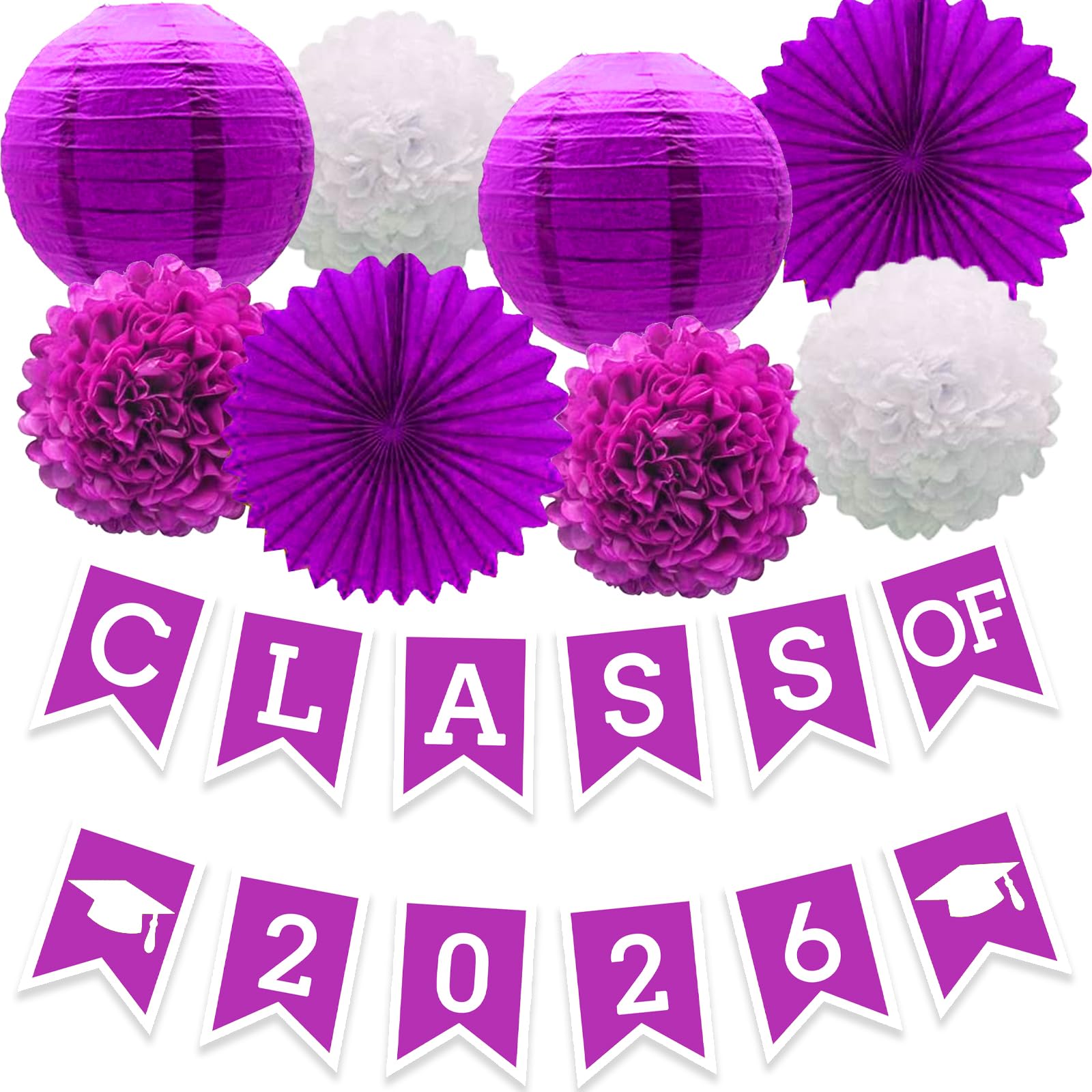 Quantity: 1 deep pink class of 2026 banner with 2 white grad caps, 2 hot pink pom poms flowers, 2 white pom poms flowers, 2 hot pink paper lanterns, 2 hot pink paper fan flowers