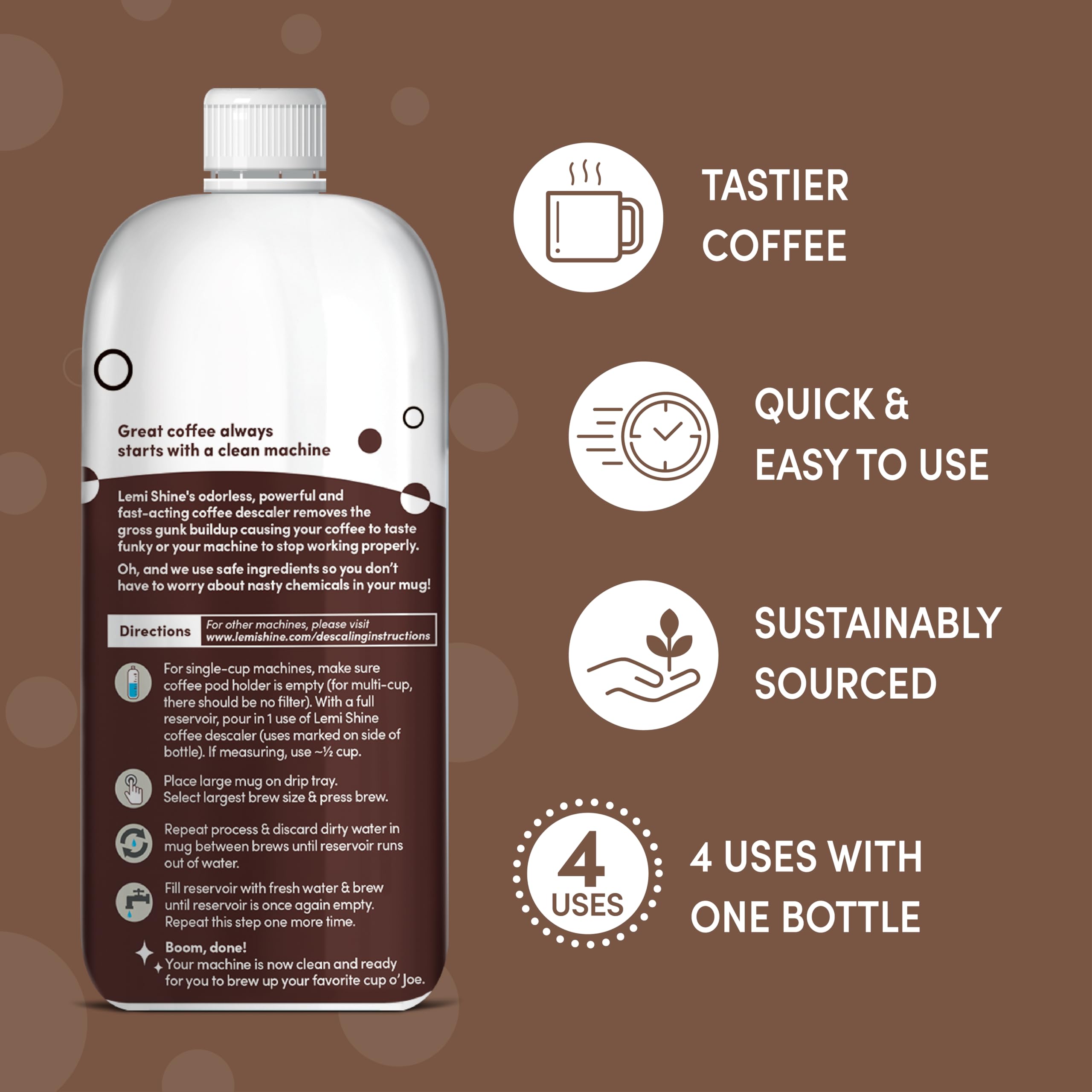 COFFEE AND ESPRESSO MACHINE DESCALER & CLEANER: Restore performance and fresh taste with our EPA Safer choice Certified formula; Effectively removes coffee oils, residue, and hard water buildupβwithout harsh chemicals; 4 uses per bottle for lasting value