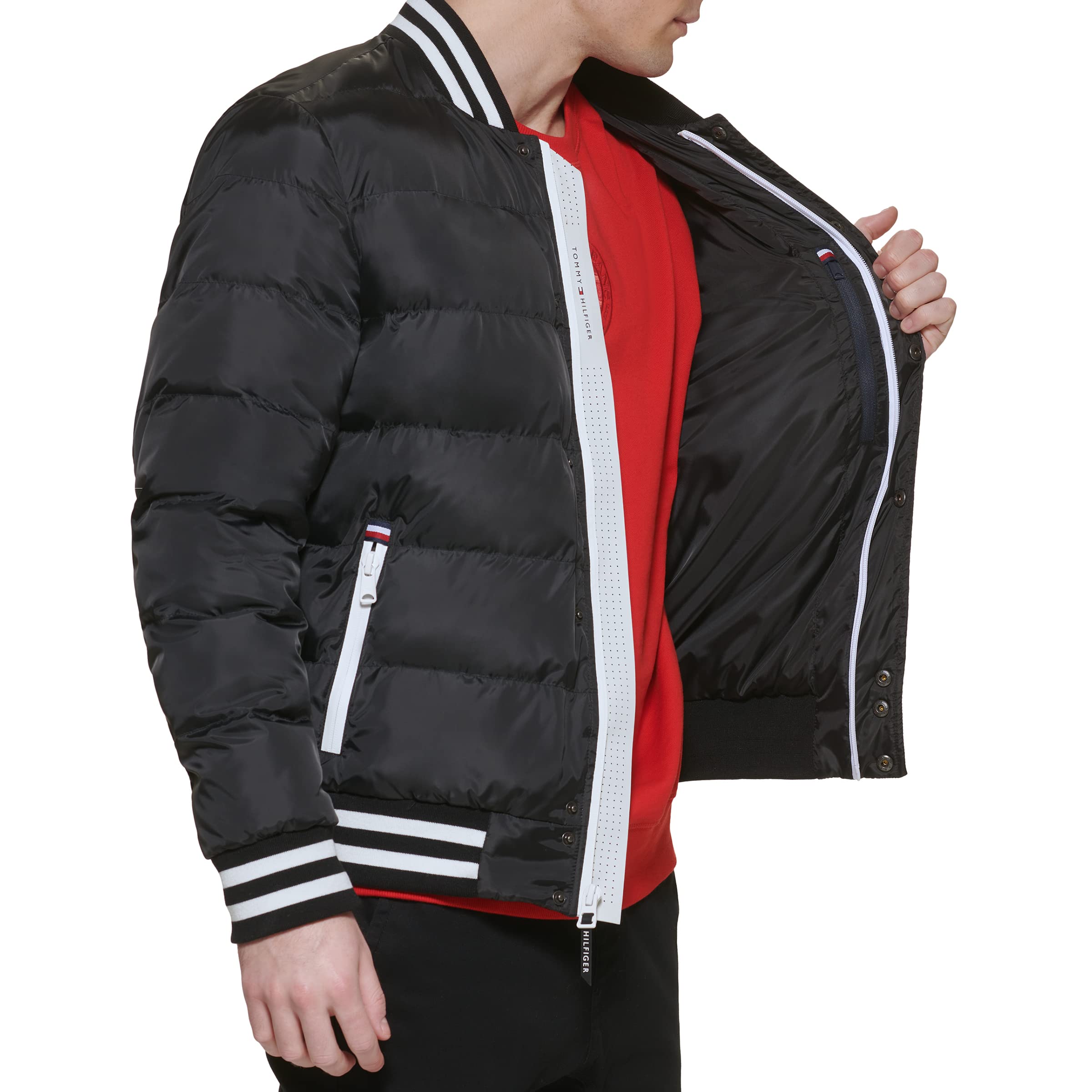 Description Go old-school with this retro-inspired nylon quilted bomber from Tommy Hilfiger. Featuring a plush all-over quilted design and soft rib knit cuffs, collar and hem, this jacket will feel comfortable all day long. Complete with two lower pockets with zippers for storage.