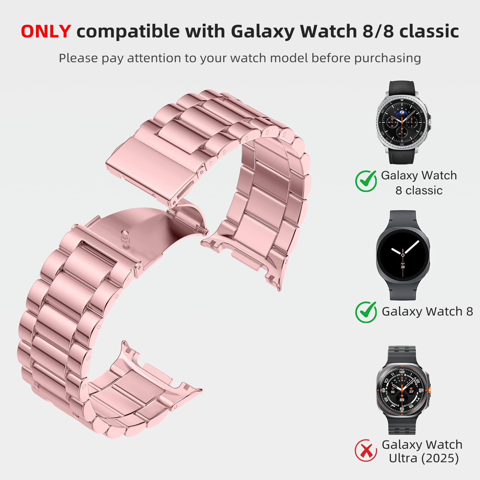 ✅【ONLY FOR Galaxy watch 8/8 Classic】Lerobo Metal Galaxy watch 8 band is ONLY compatible with galaxy samsung watch 8 40mm 44mm/8 classic 46mm(2025 new released). PLEASE NOTE: NOT compatible with other Samsung Galaxy Watch models, please carefully confirm your watch model before purchasing.
