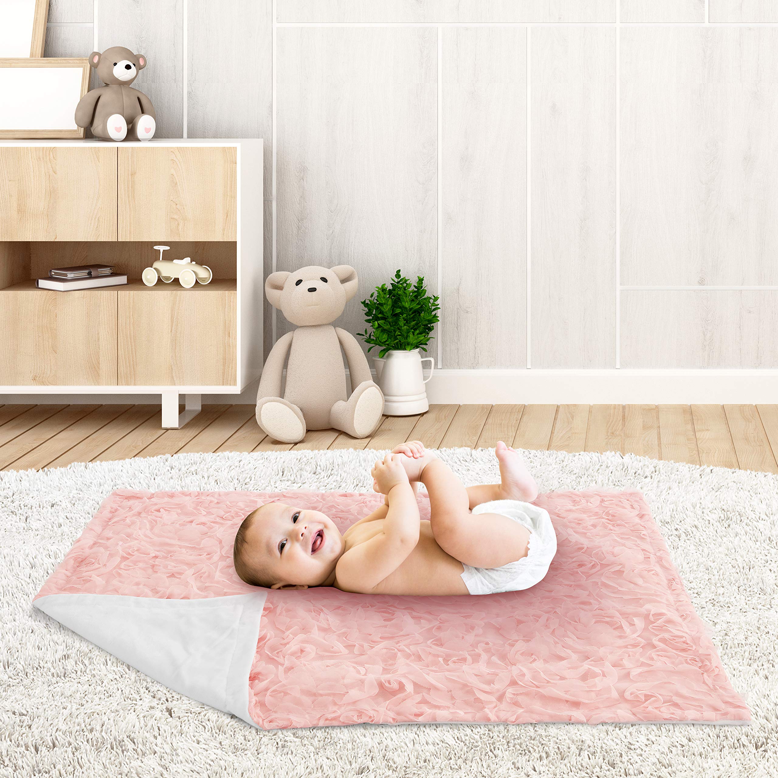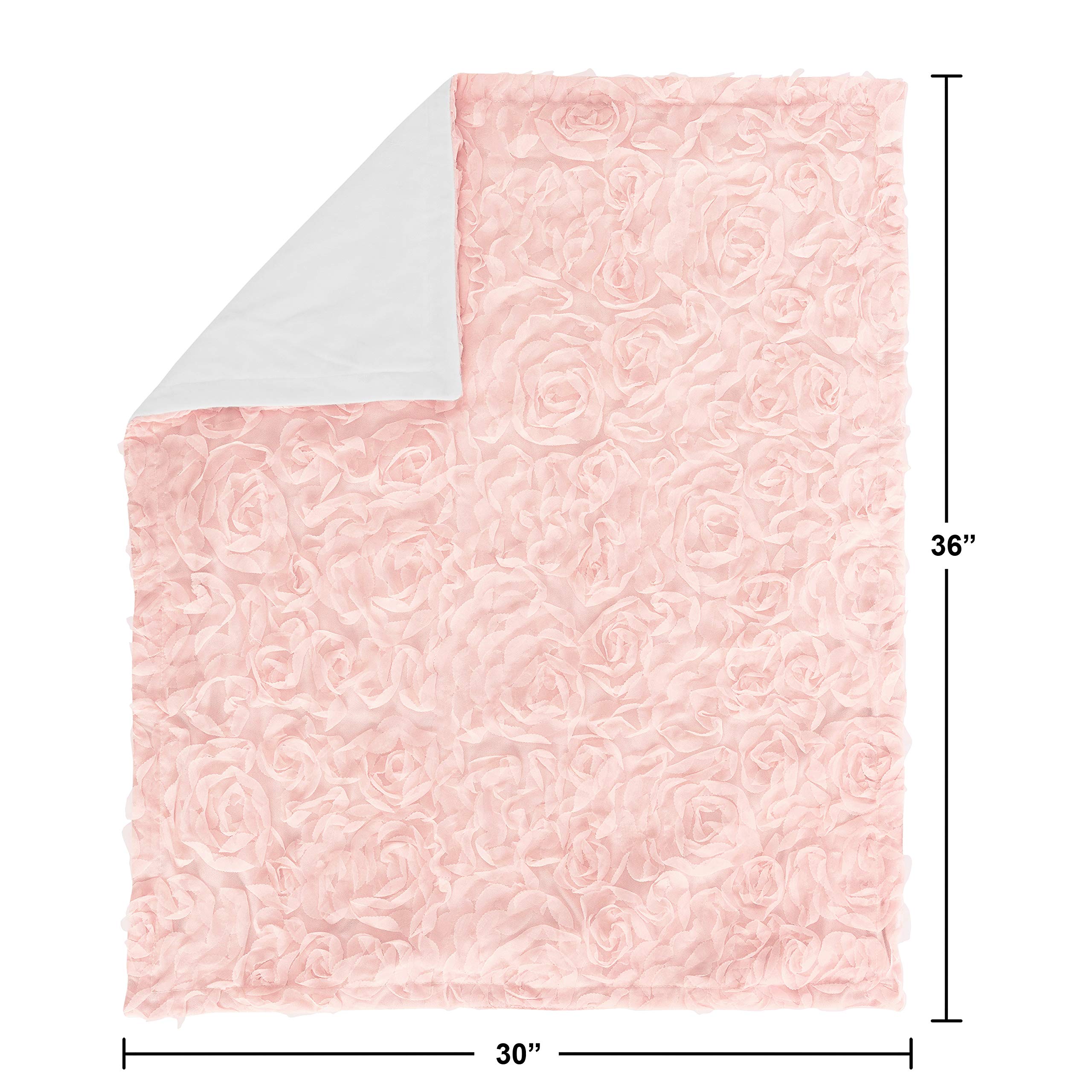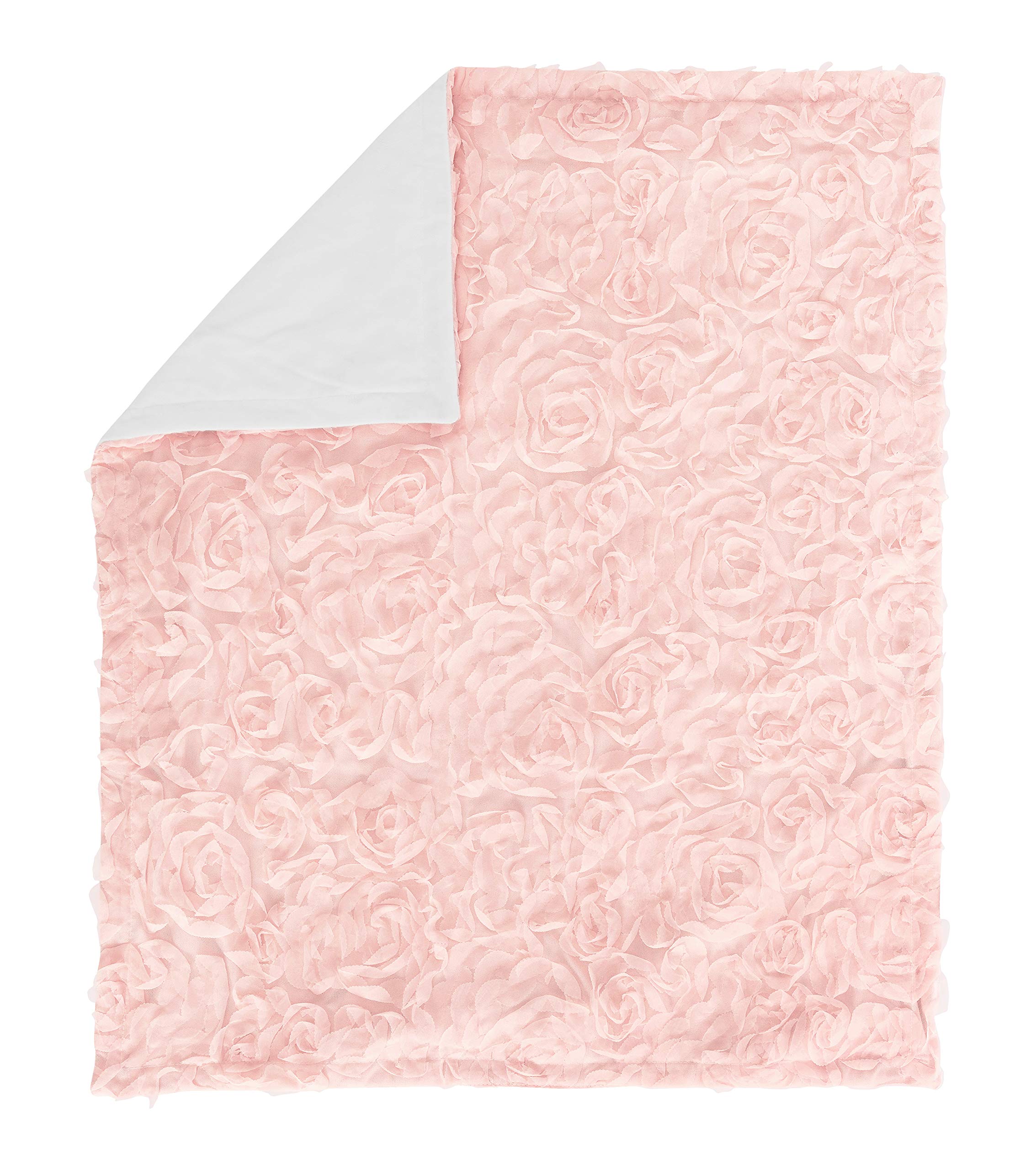 Blanket is designed using blush pink Chiffon Floral Rose and reverses to soft white minky