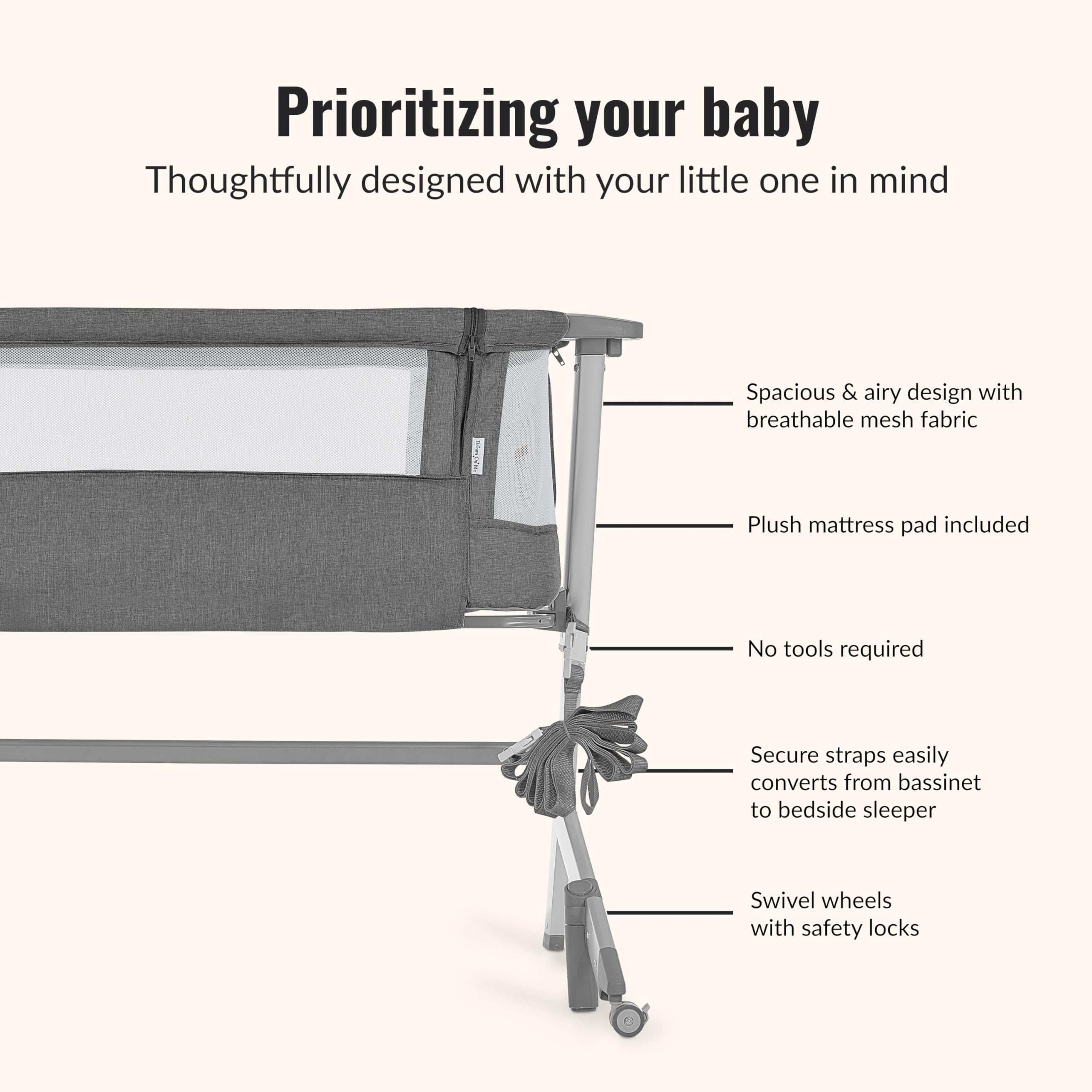 CONVENIENT FEATURES: Enjoy a quick tool-free assembly. The sturdy strap system allows you to easily secure the bassinet to your bed frame. Lightweight and mobile, enough to move from room to room for convenience