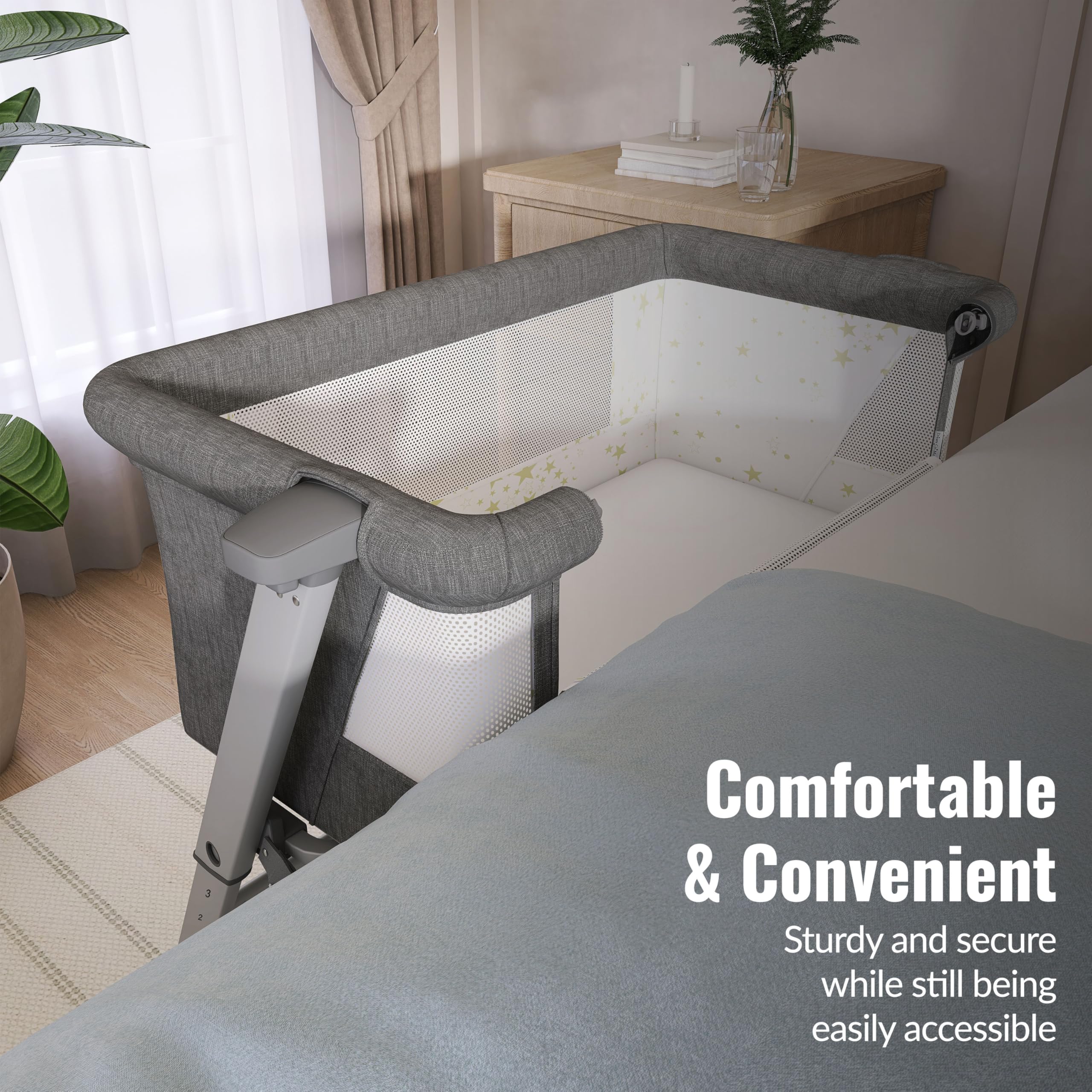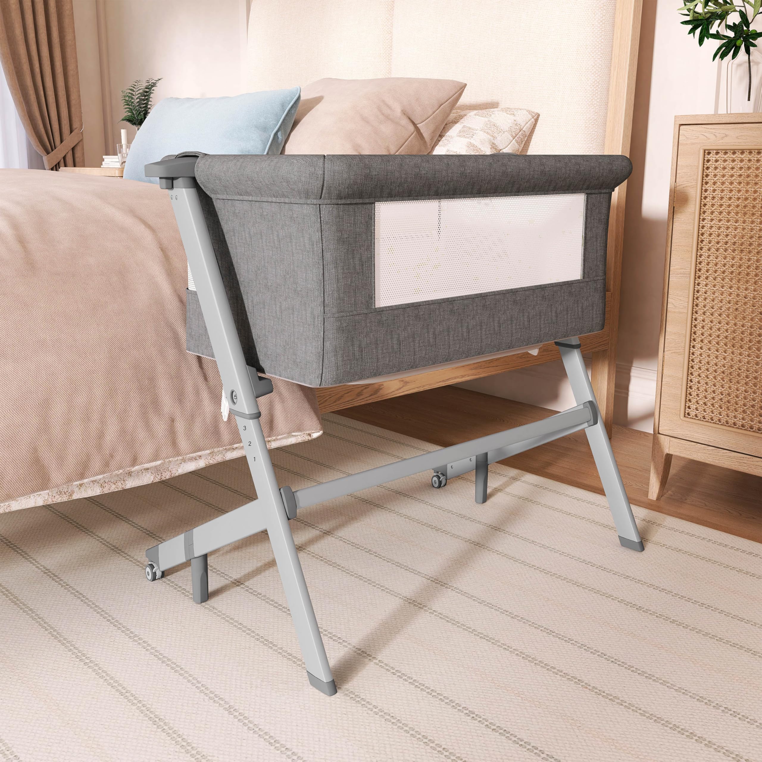DUAL USE: Unzip and roll down the mesh sides to convert the bassinet into a bedside sleeper. Lean in for breastfeeding or comforting your child Five adjustable heights (Adjusts from 26.5 > 27.5 > 28.5 > 29.5 > 30.5”) Able to be used with a queen mattress leaving no gaps and is also easy on your back