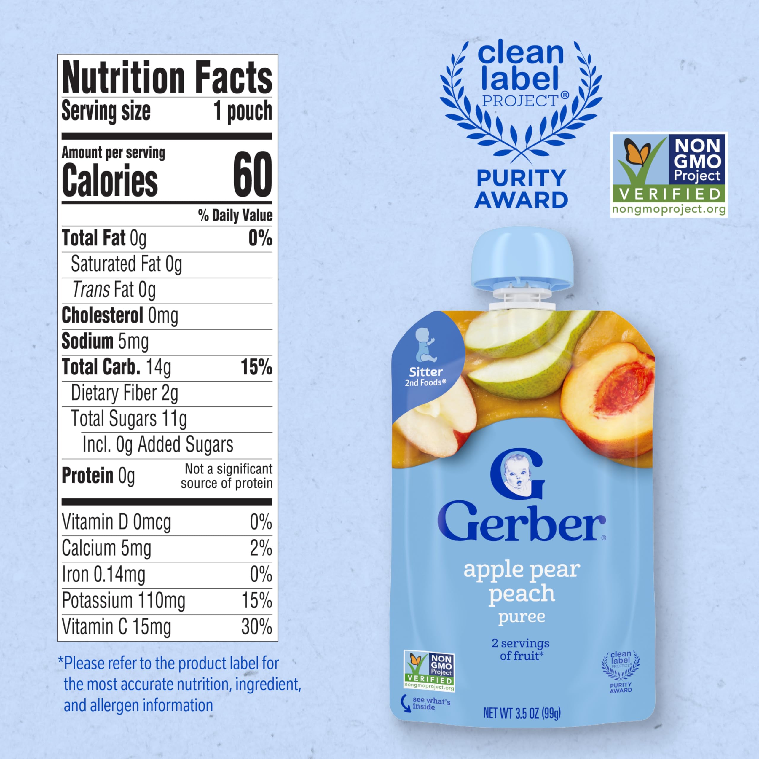 PUREED FRUIT: With your child in mind, our Gerber baby food offers a delightful blend of 1/3 apple, 1/4 pear and one tablespoon of peach in each pouch