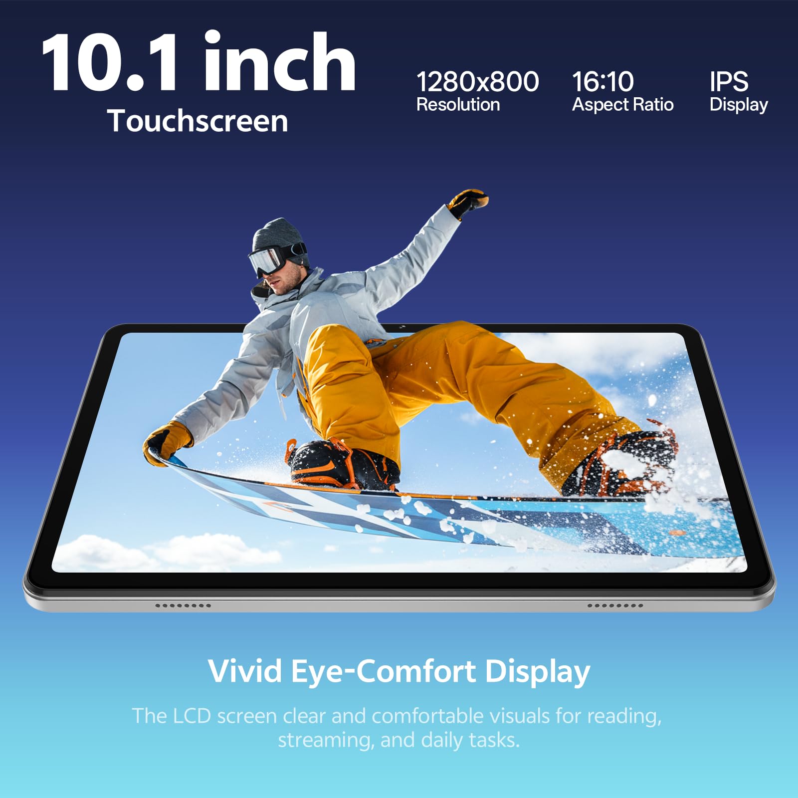 10'' HD IPS Touchscreen Tablet, 20GB (3GB + 17GB) RAM, 32GB Storage, Expandable Up to 1TB (MicroSD Card Sold Separately) – Ample storage and expandability with 20GB ram and 32GB internal storage, slot expandable up to 1TB via a microsd card, you can store all your apps, educational content, videos, and photos, learning work reading. 10.1 inch IPS display features a 1280 x 800 high resolution screen 16:10 aspect ratio with, 10.1" HD IPS display with wide viewing angles and vibrant colors—ideal for movies, gaming, or educational apps videos, web browsing reading