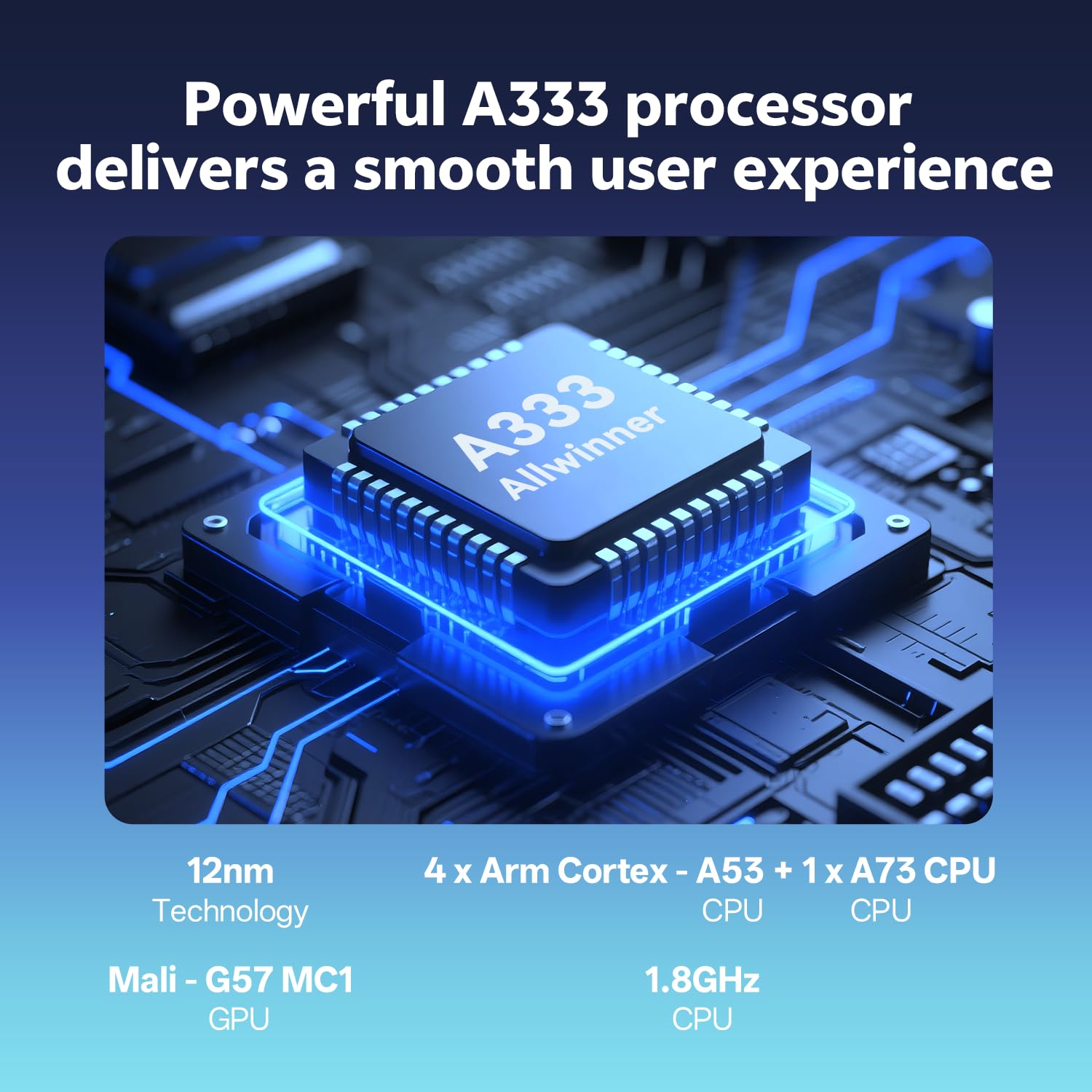Powerful Bluetooth 5.3, Penta-Core Processor, Dual-Band Wi-Fi,and Long-Lasting 6000mAh Battery – Equipped with the Allwinner A333 CPU, delivers smooth multitasking, wireless connectivity, supports 2.4/5 GHz wifi bands for stable connections; Bluetooth 5.3 enables seamless pairing with external devices like speakers, headphones, and accessories.Enjoy hours of uninterrupted use with the powerful 6000mAh long lasting battery—up to 8 hours of video playback or web browsing on a full charge