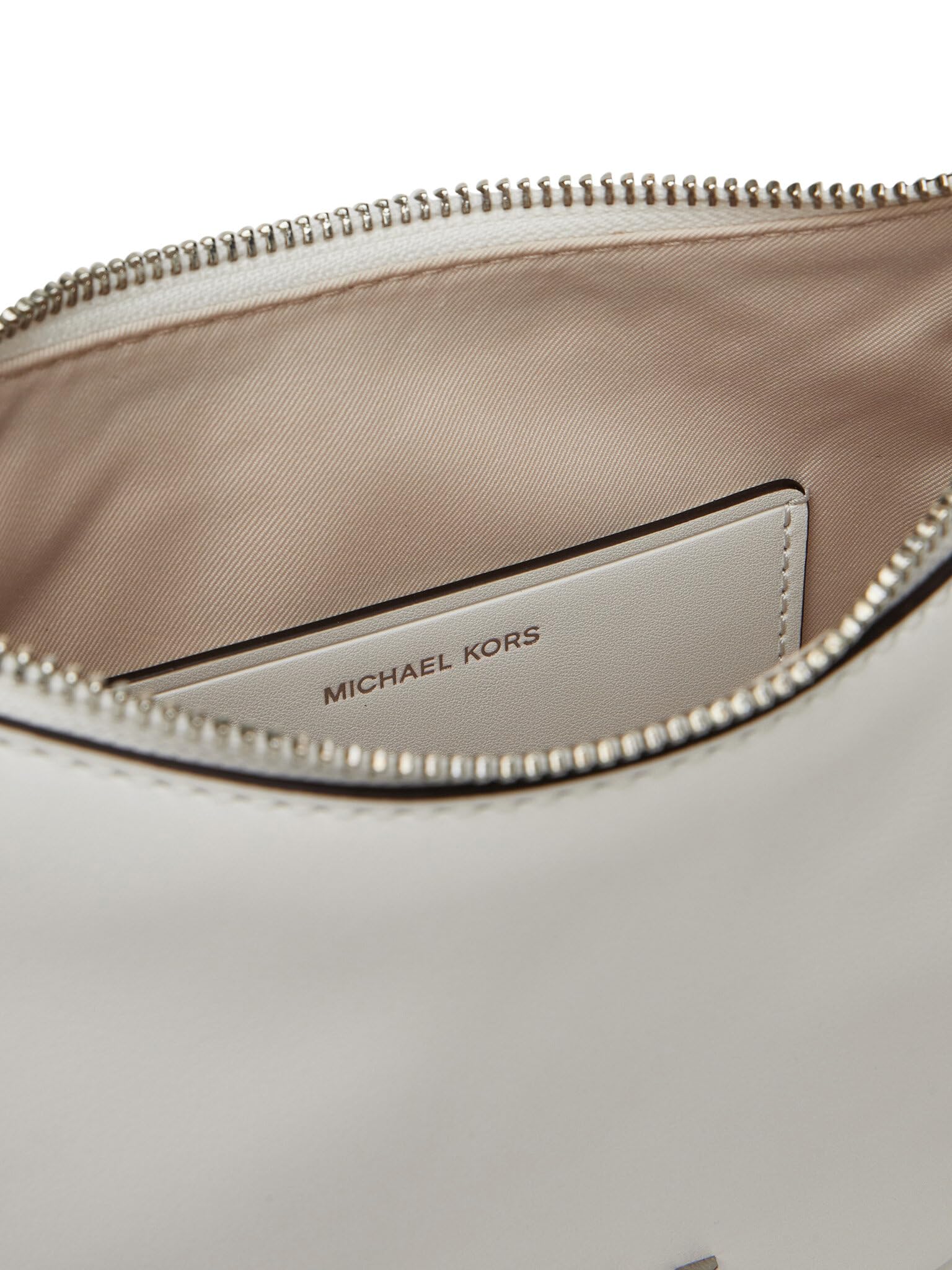 Description This chic half-moon Kyla pochette is made from on-trend denim and punctuated with silver-tone MK hardware. Slip the slim silhouette on your shoulder for a night out, and use the optional crossbody strap to keep your hands free for a day on the go. Either way, it’s sure to earn compliments.