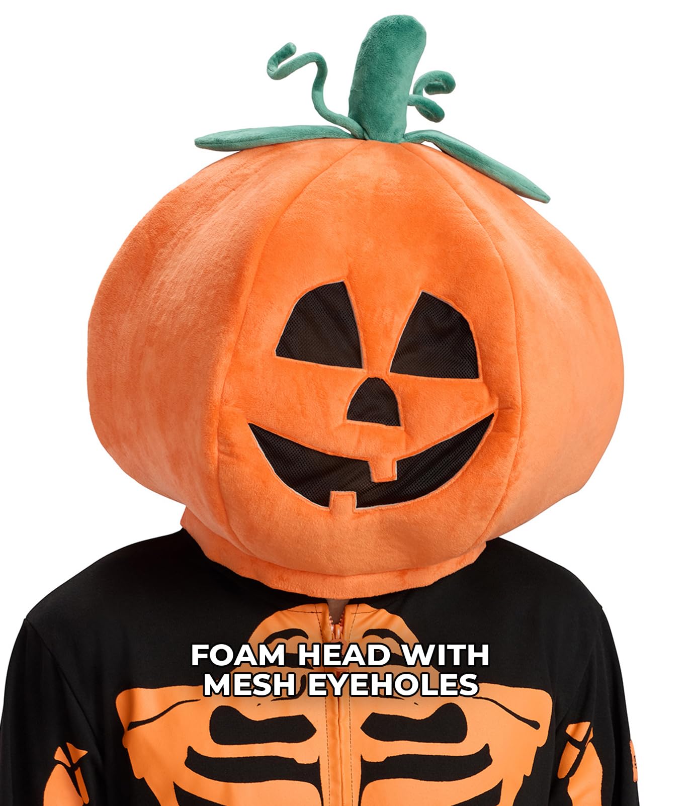 PUMPKIN HEAD TWIST This Tipsy Elves skeleton jumpsuit features bright orange bones and a plush jack-o'-lantern mask for a fun Halloween mash-up look.