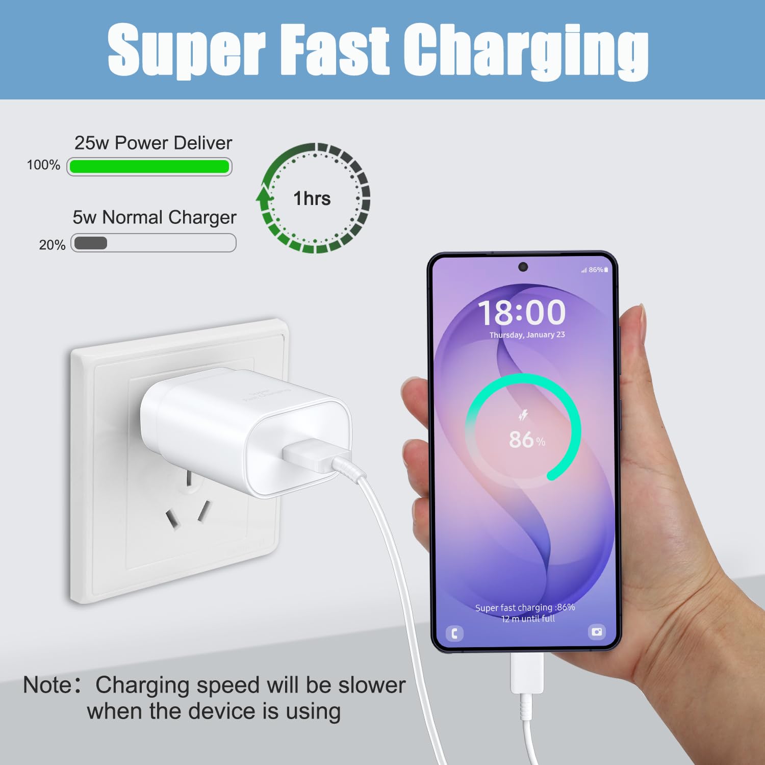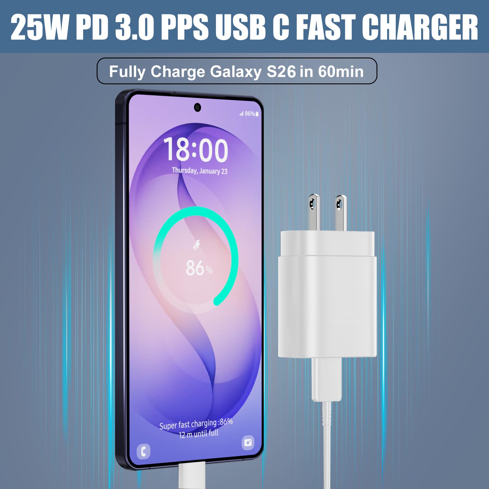 【Safety Super Fast Charger Type C】25W PD 3.0 Technology provides Max 25W output power for all Samsung Galaxy S26/S26 Ultra/S26+/S25/S25 Ultra/S25+/S24/S24 Ultra/S24 Plus/S23/S23 Ultra/S23 Plus/S22/S22 Ultra/S22+/S21/S21+/S21 Ultra/S20/S20+/S20 Ultra,this Samsung fast charger type c kit fast charge your battery from zero up to 100% in about 60 min,5 times as fast as Standard Charger Block,10 times as fast as PC USB port and saves you time