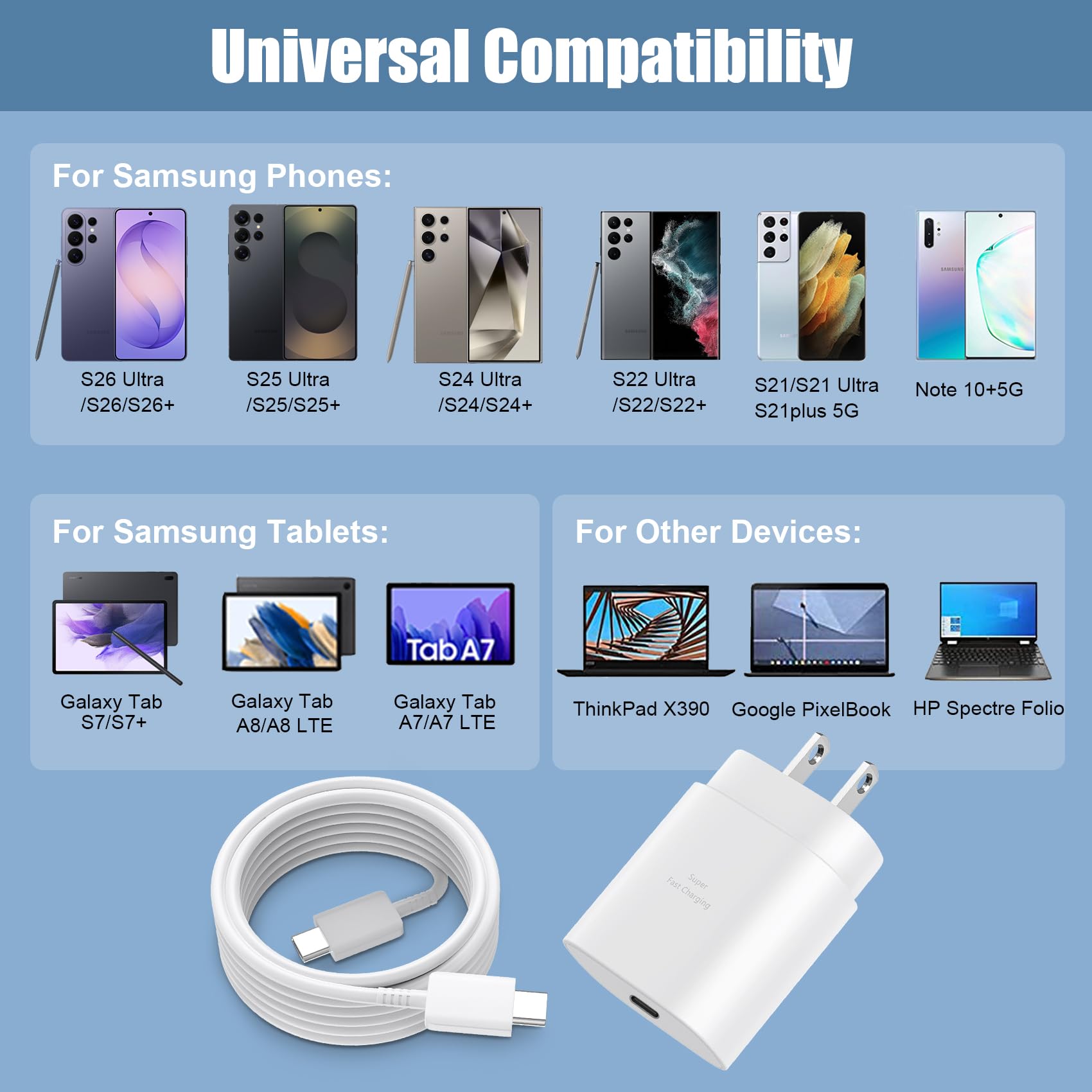【Samsung Super Fast Charger Compatibility】The USB C fast wall charger cable kit supports most of most of USB C devices, including Samsung Galaxy S26/S26 Ultra/S26+/S25/S25 Ultra/S25+/S24/S24 Ultra/S24 Plus/S23/S23 Ultra/S23+/ S21/ S21+/ S21 Ultra 5G/ S22/S22+/S22 Ultra/Note10/ 10+, Note 20/20 Ultra 5G, S20/S20+/S20 Ultra 5G/ S20 FE(Fan Edition) 5G, S10, S10+, Galaxy Z fold 3/ Galaxy Z Flip 3,S10e, S9, S9+ Plus, S8, S8+ Plus/Active