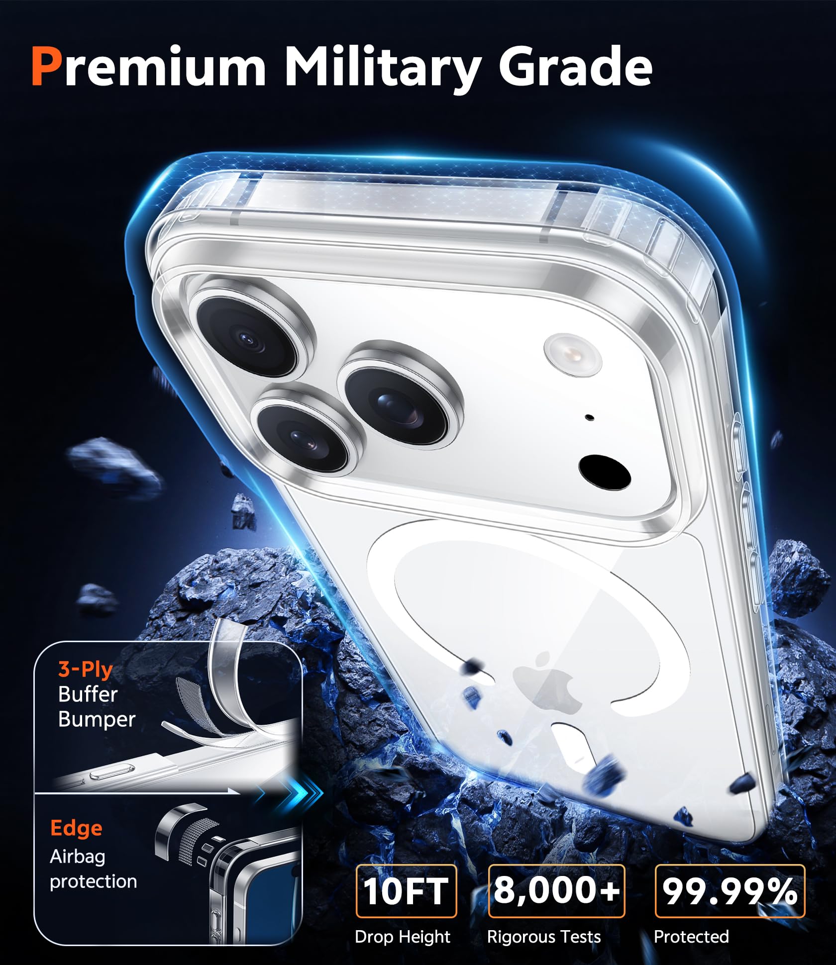 10FT Military Grade Protection: Passed Military Drop Tested up to 10 FT. This iPhone 17 Pro Max clear case backplane is made with rigid polycarbonate and flexible shockproof TPU bumpers around the edge and features 4 built-in corner Airbags to absorb impact
