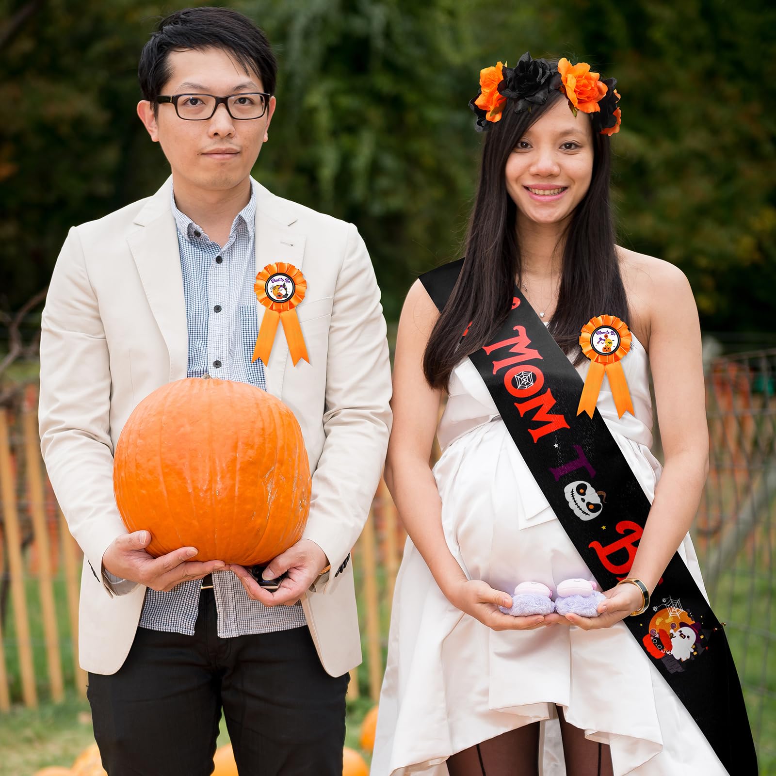 Spooky Halloween Design: the baby shower sash and button pin design with orange and black Halloween theme with pumpkin, ghost, bats element, printed with letter [mom to be] and [dad to be], and you can use these sash, pin and crown to set up the festive mood for fall baby shower party or gender reveal party