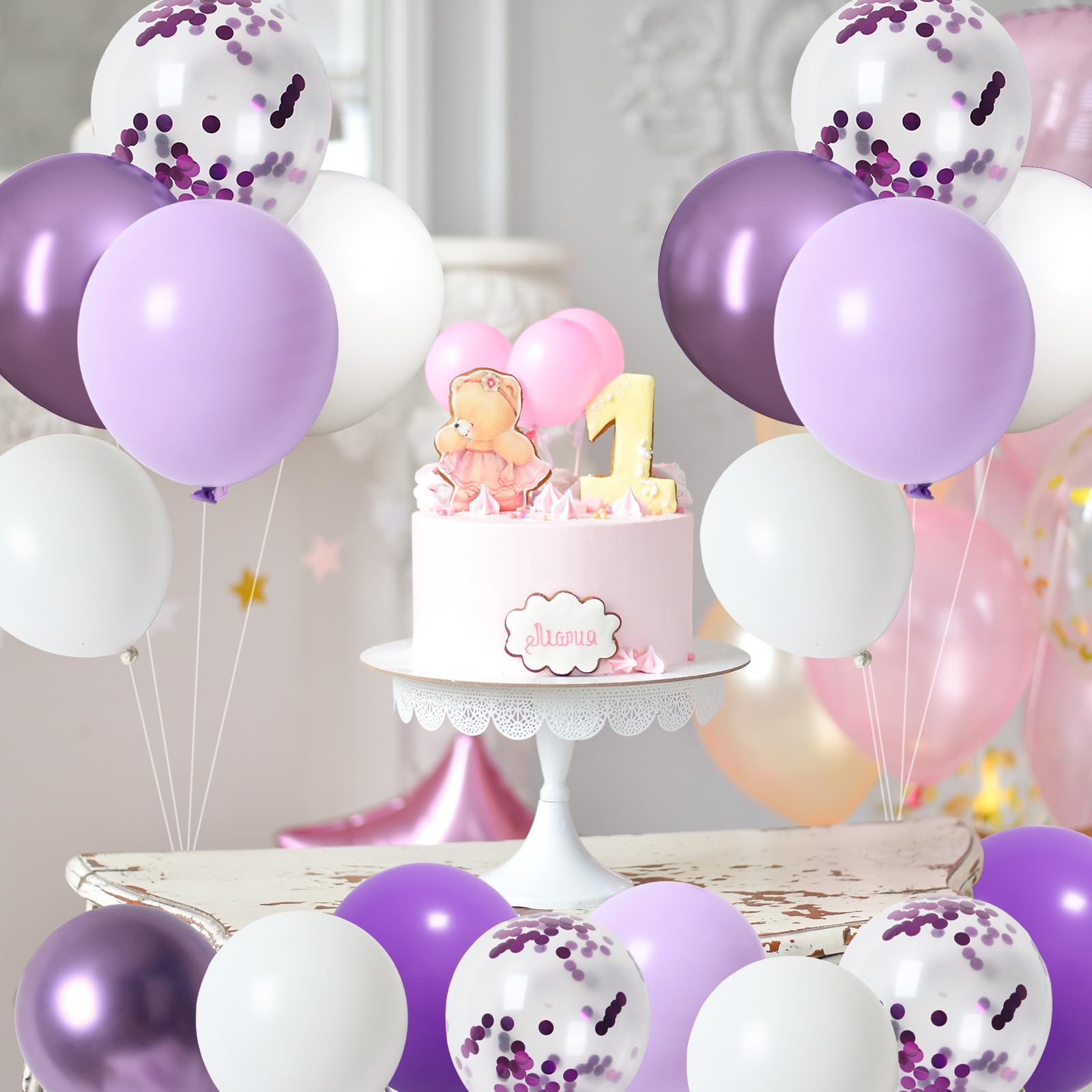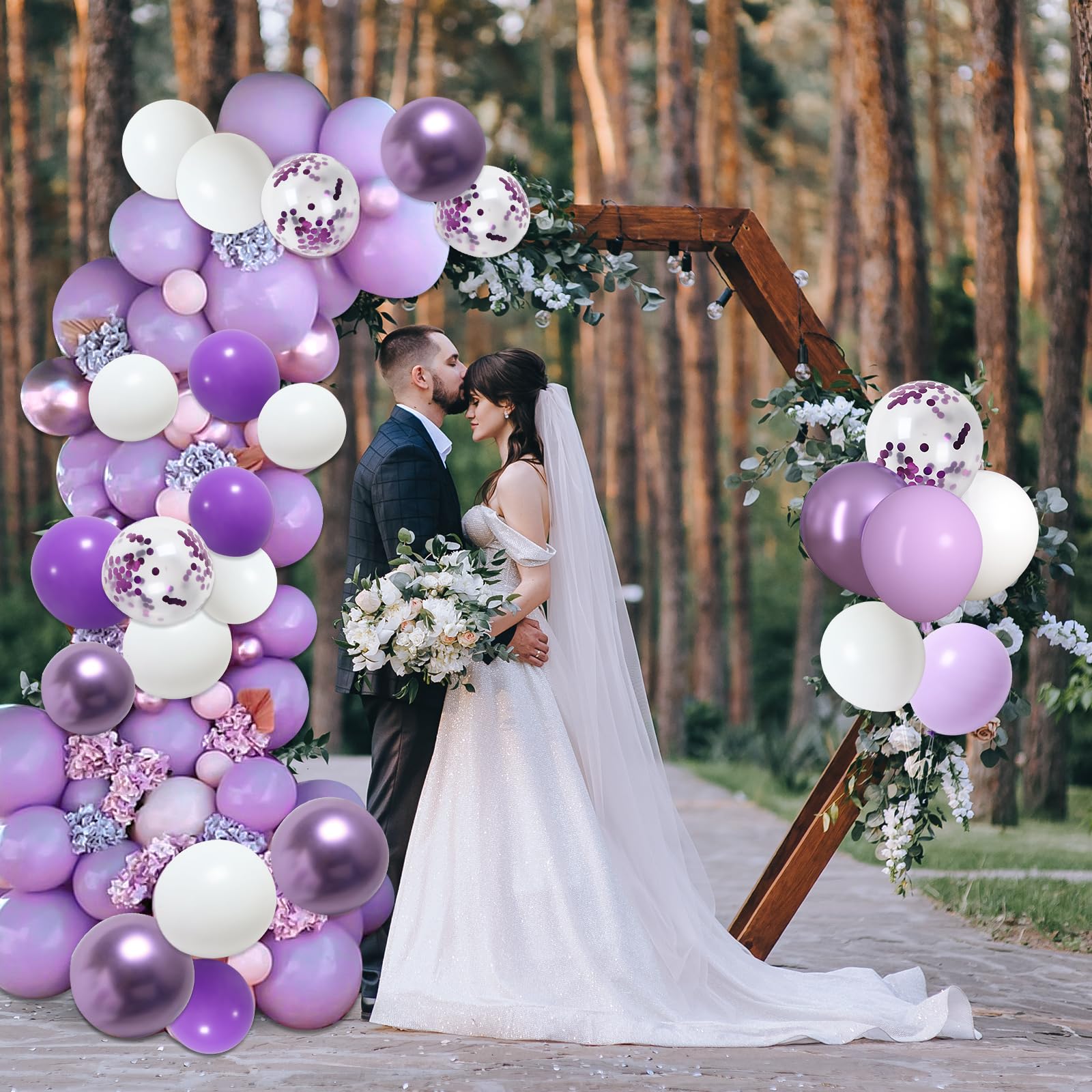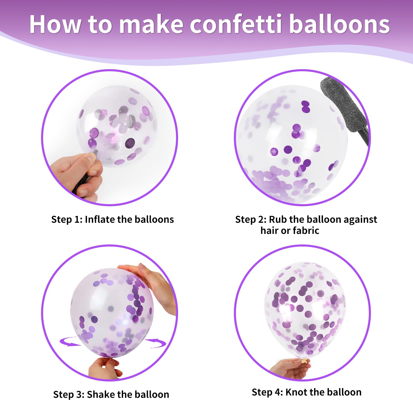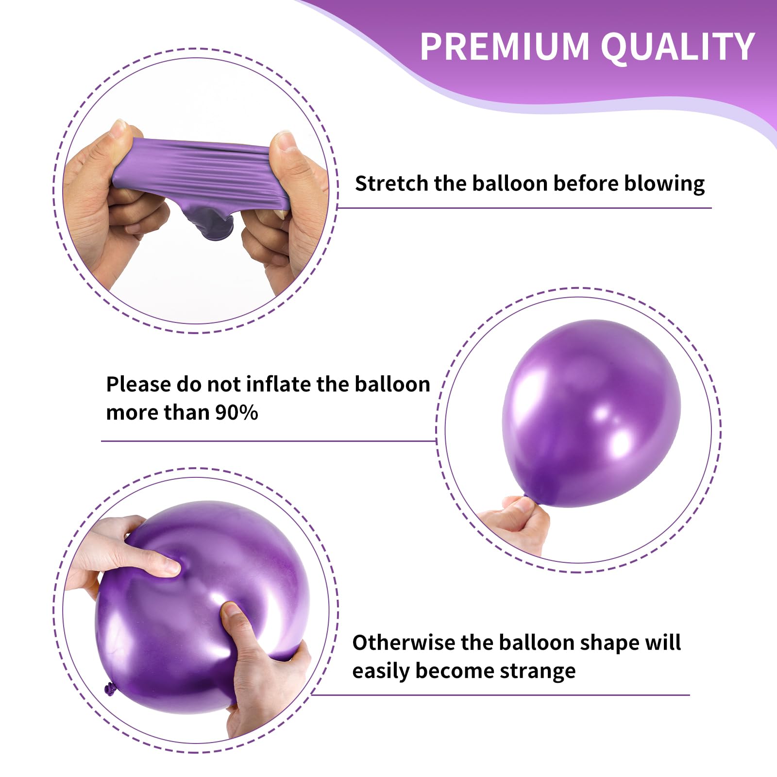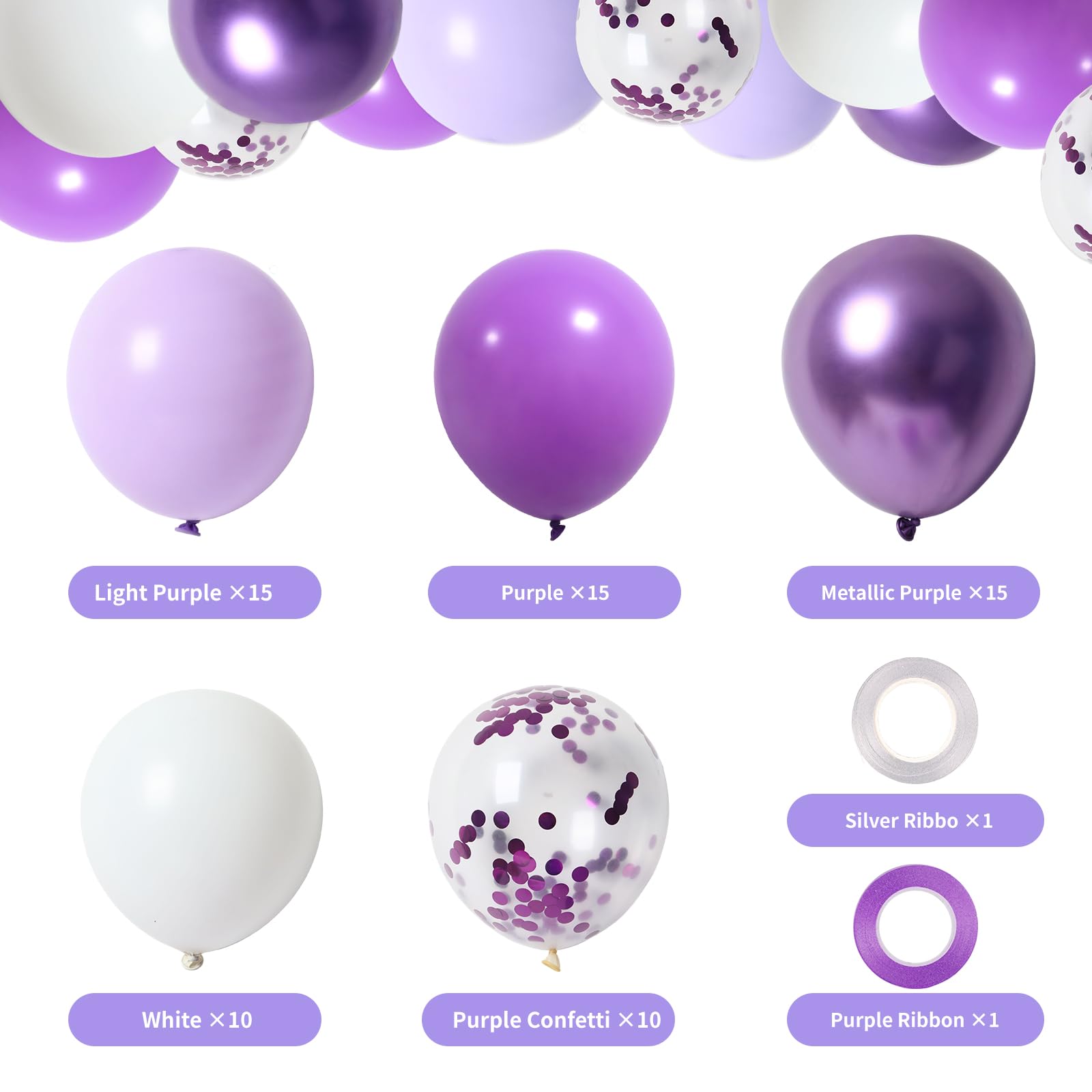 [All-in-One Kit] This balloon kit includes everything you need to create a stunning decoration, 15 macaron violet balloons, 15 violet balloons, 15 metallic violet balloons, 10 white balloons, 10 confetti balloons, 1 roll of silver ribbon and 1 roll of Violet ribbon.The size of the balloon is about 12 inches after inflation.