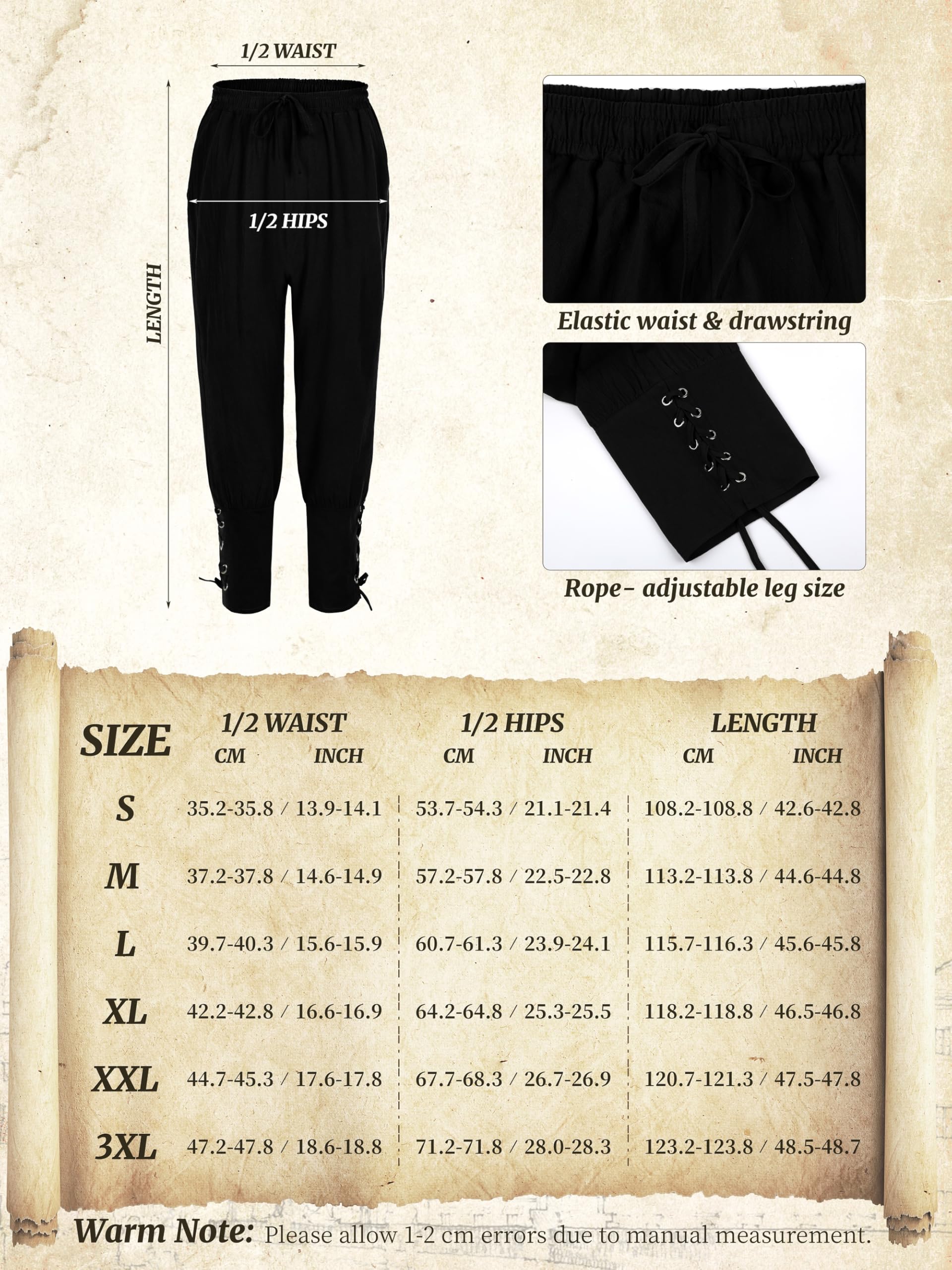Effortless Fit and Style: The pair of men's ankle banded pants creates the ideal pirate costume men, with an elasticated drawstring waist for a nice fit and adjustable lace up ankles for easy sizing