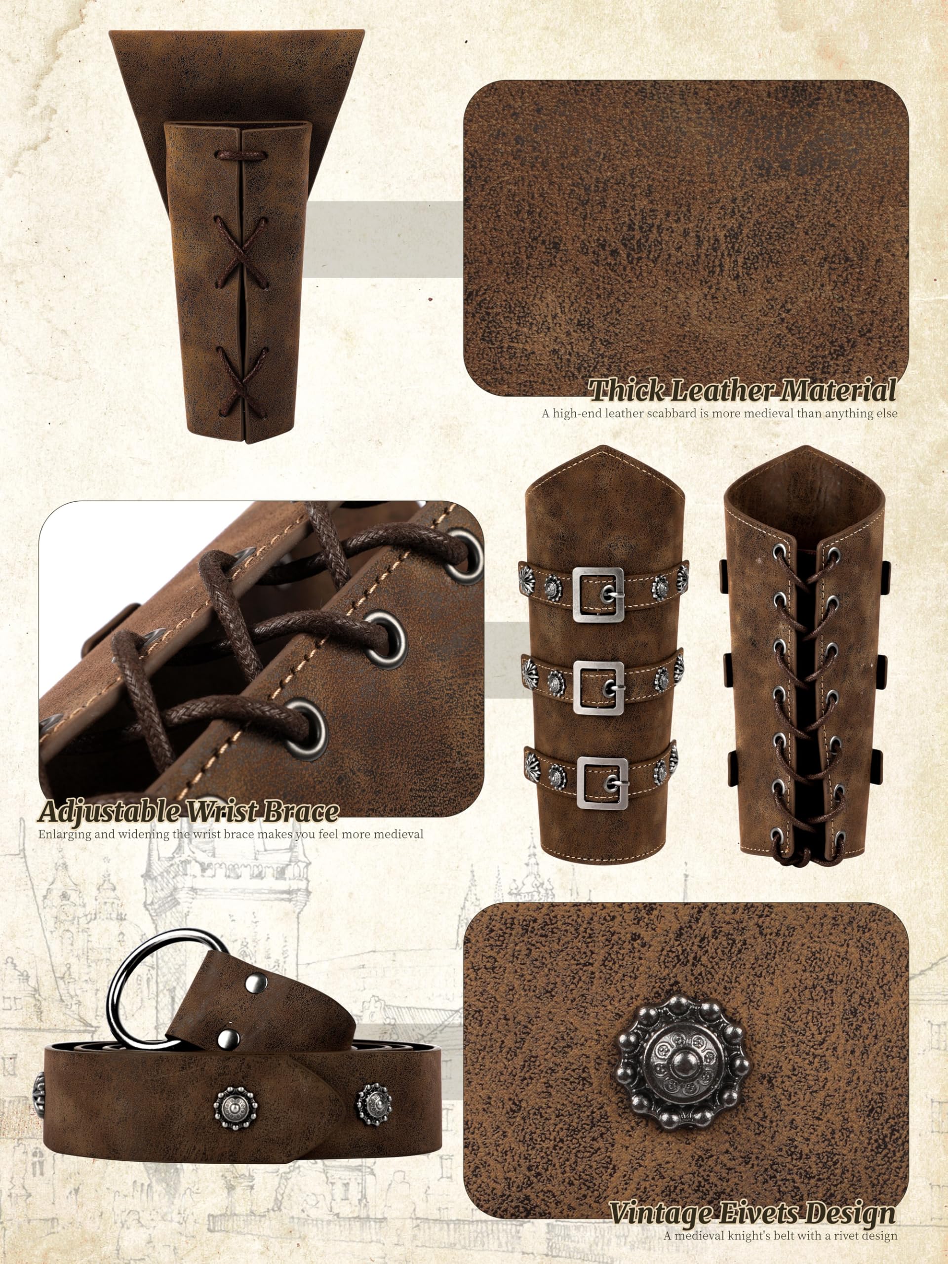 Premium Leather Accessories: Our medieval costume men such as belt, wrist guard and arrow holder is made of leather. These viking costume men accessories are durable and reliable