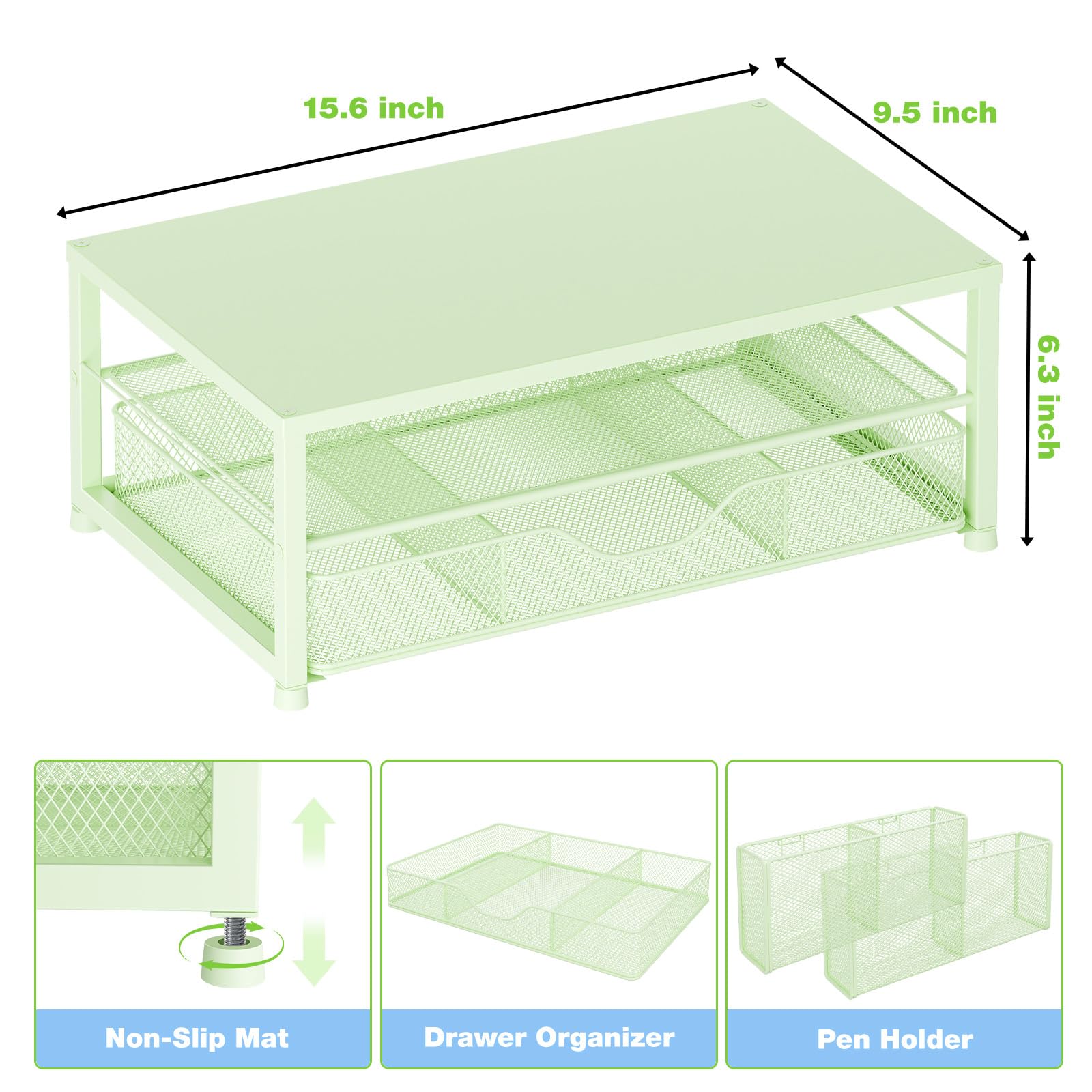 【Save Space】:This 2-Tier monitor stand with drawer and 2 hanging pen holders provides ample storage space to keep your office supplies and office desk accessories neatly organized and easily accessible, keeping your workspace tidy and improving your sense of well-being