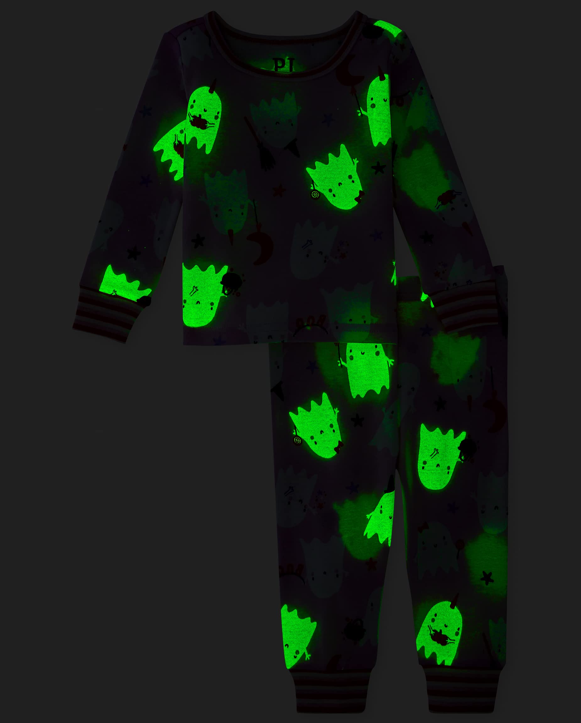 PAJAMA TOP — Features long sleeves, rib-knit crew neck and sleeve cuffs and allover ghost print glows in the dark. For best glow effect, expose to light before wearing