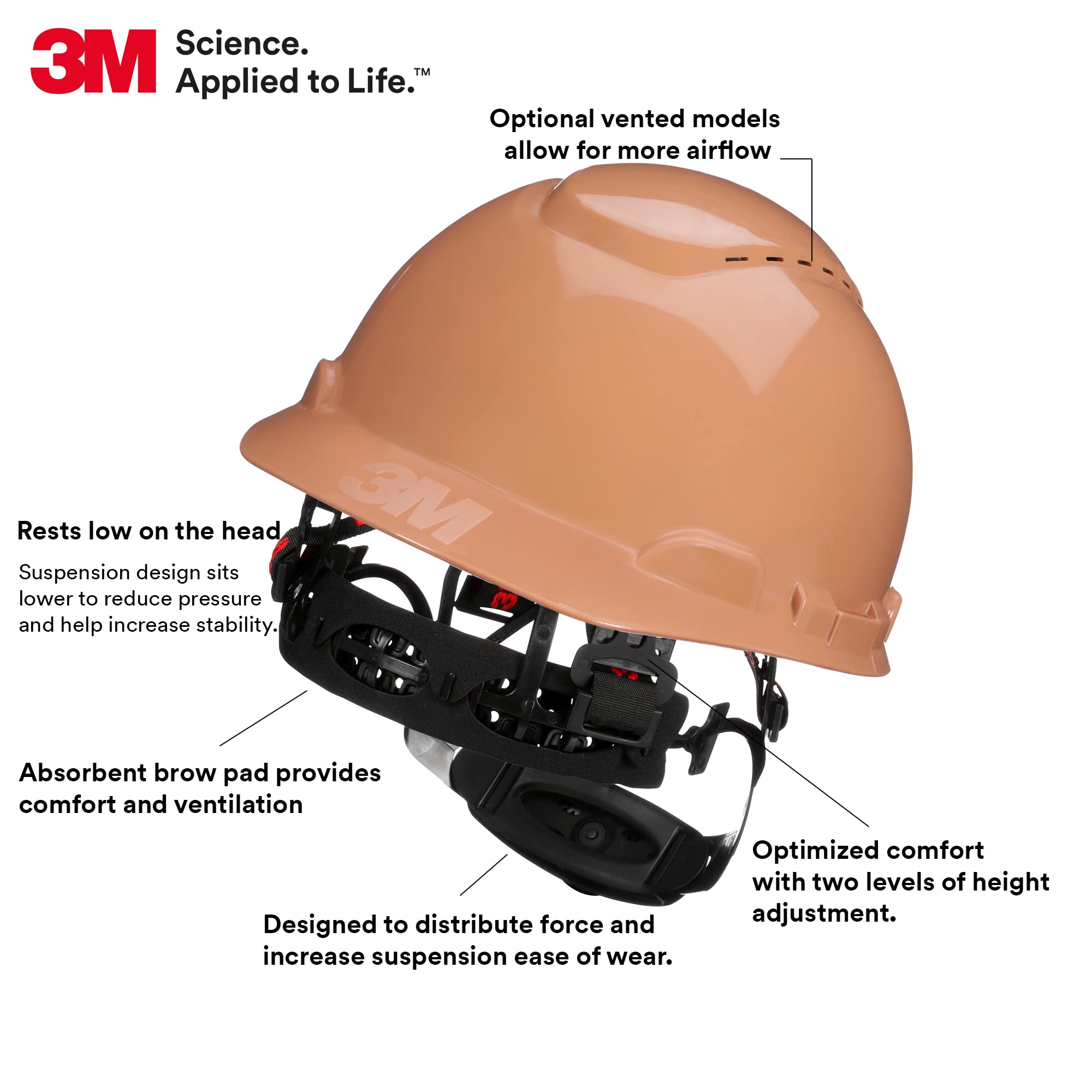 The 3M SecureFit H-Series Hard Hats with Pressure Diffusion Technology are designed to self-adjust to the wearer as the ratchet is tightened. This helps create a personalized fit and reduces the pressure on the forehead up to 30% compared to current 3M H-series hard hat suspensions. The smooth, easy turning ratchet suspension sits lows on the head to increase security and reduce pressure, helping to make the SecureFit H-Series a comfortable and stable hard hat option. Help give your workers an excellent blend of comfort, style and safety with 3M SecureFit Hard Hat Series. Available in cap style or full brim models, the suspension system incorporates patented Pressure Diffusion Technology and sits low on the head for greater comfort and security. Select models feature a proprietary indicator that lets wearer know when to replace helmet due to UV exposure. All models meet ANSI Z89.1 Safety Compliance Standards. Non-vented hard hats meet ANSI/ISEA Z89.1 and CSA Z94.1. Vented hard hats meet ANSI/ISEA Z89.1 Type 1, Class C requirements, CSA Z94.1