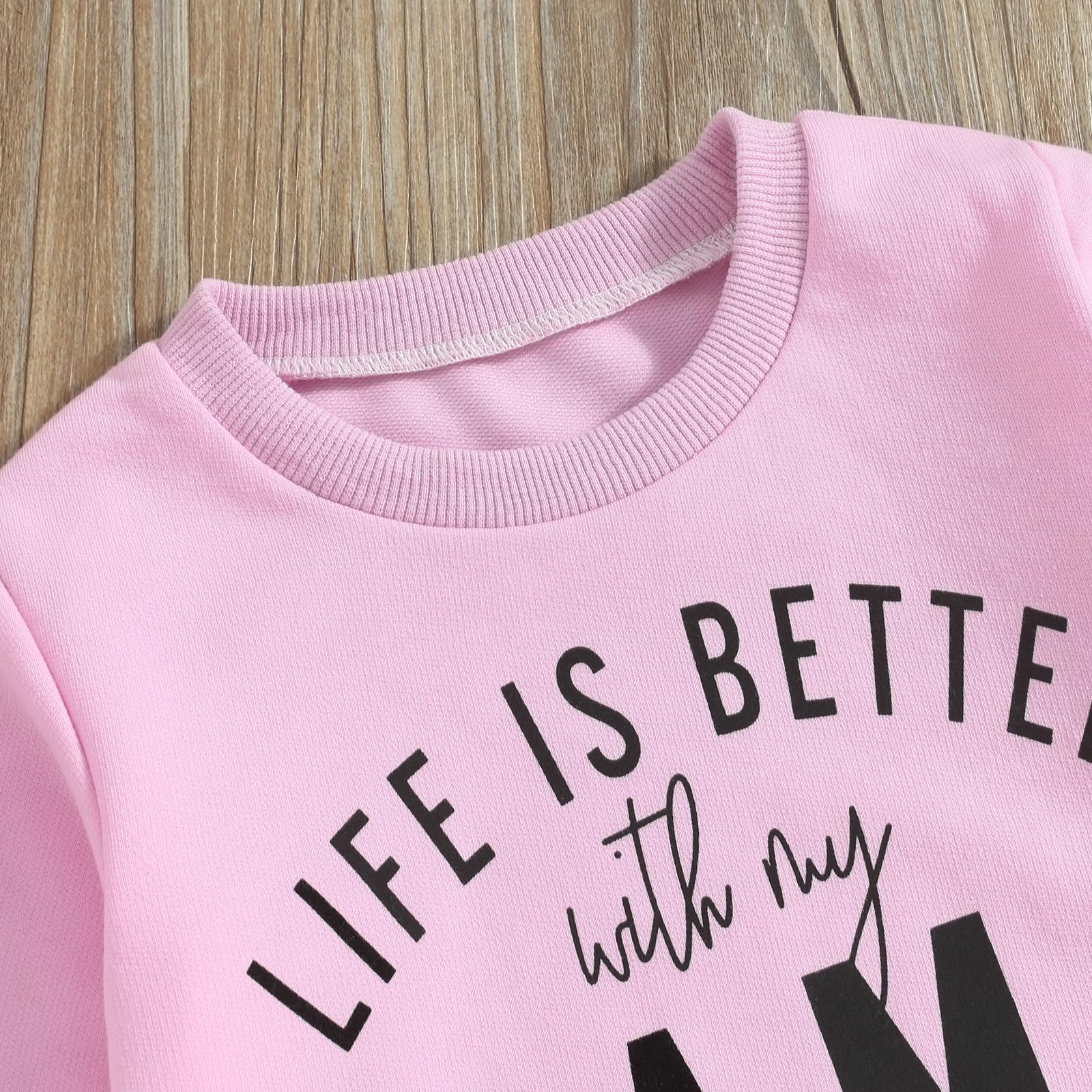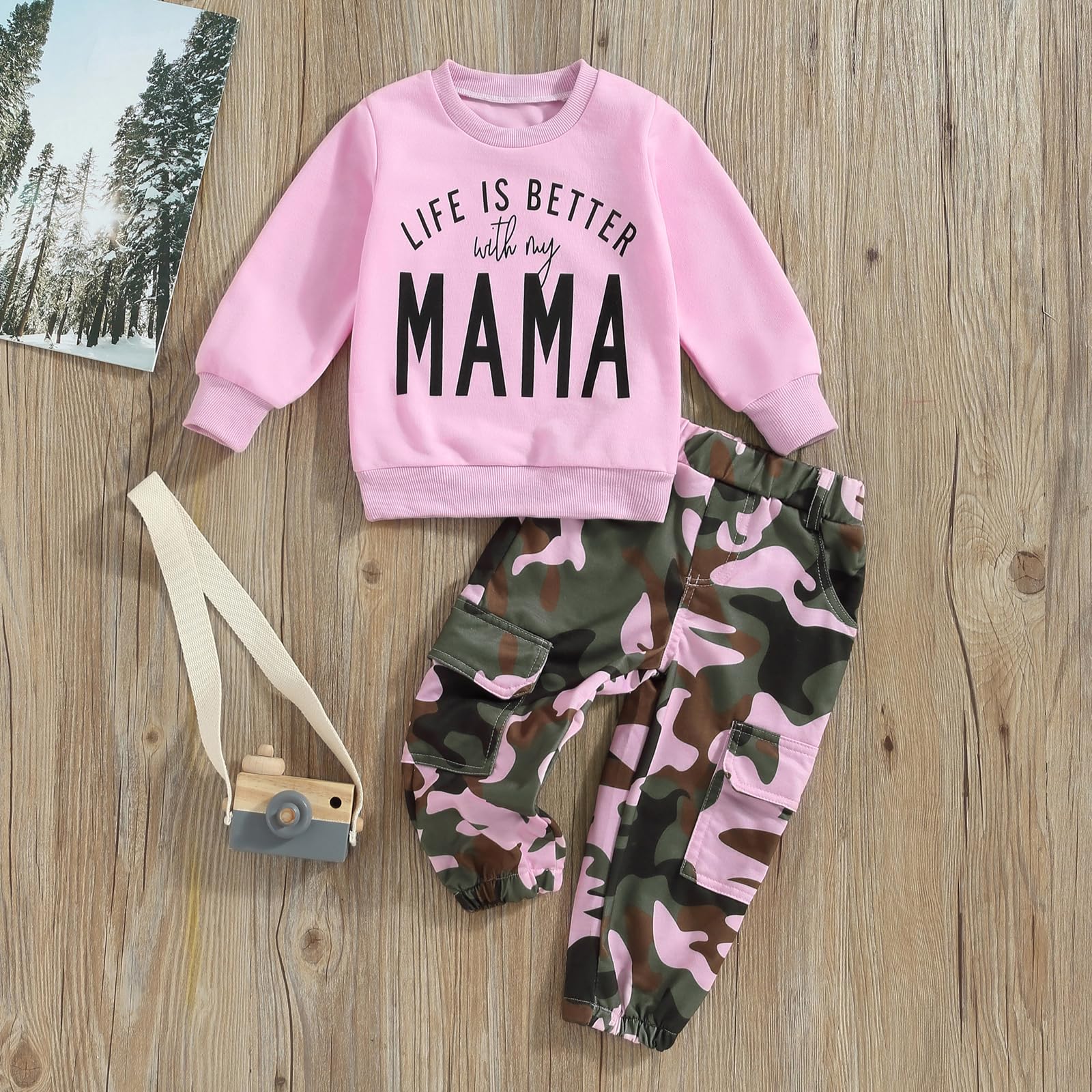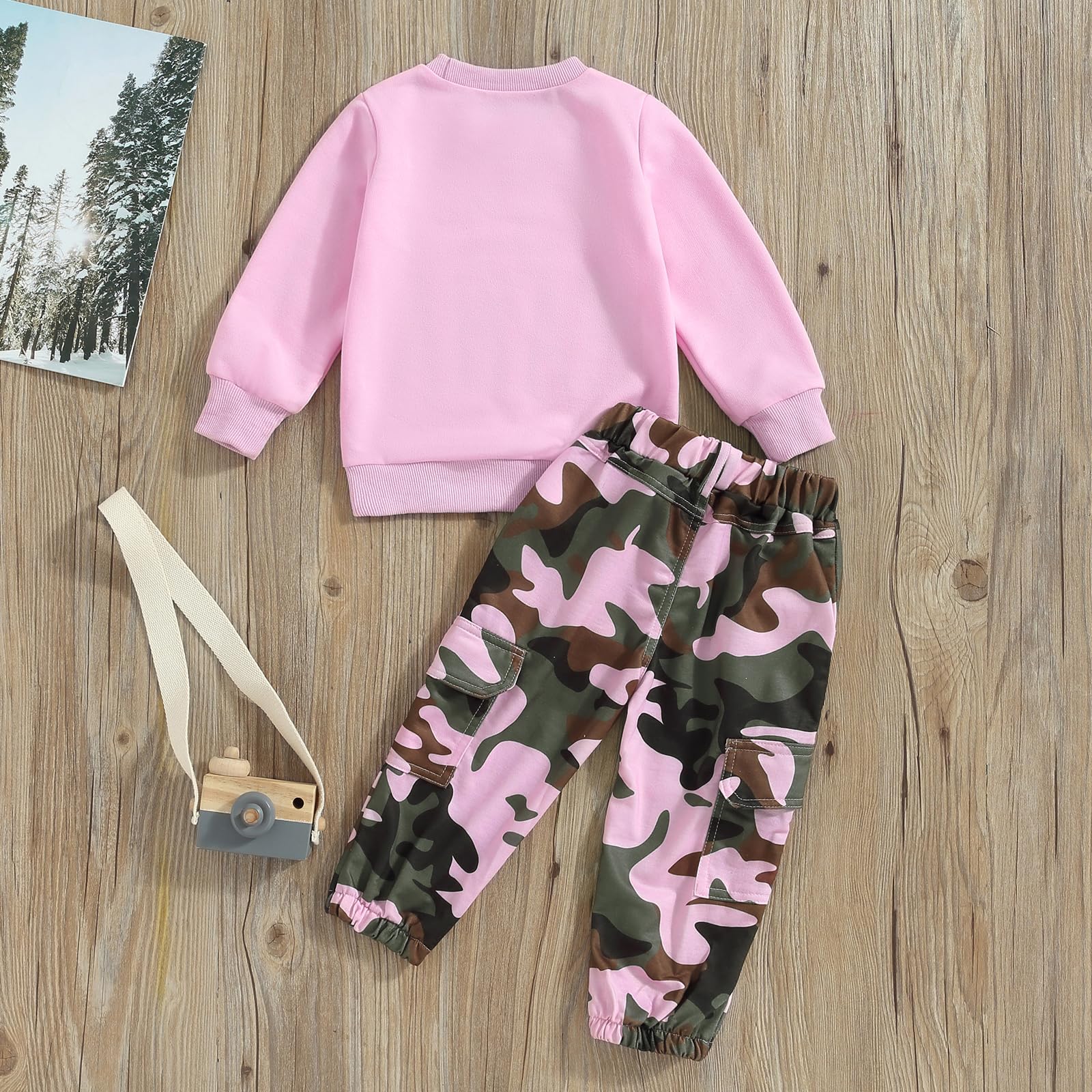 ♥Design: Baby girl fall outfits, pullover sweatshirt features letter print, long sleeves and a round neck. Trousers feature camouflage print and pockets.