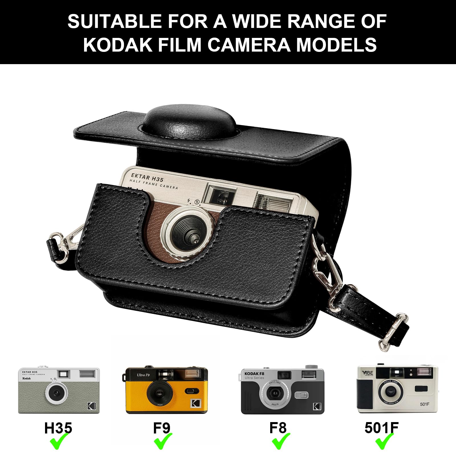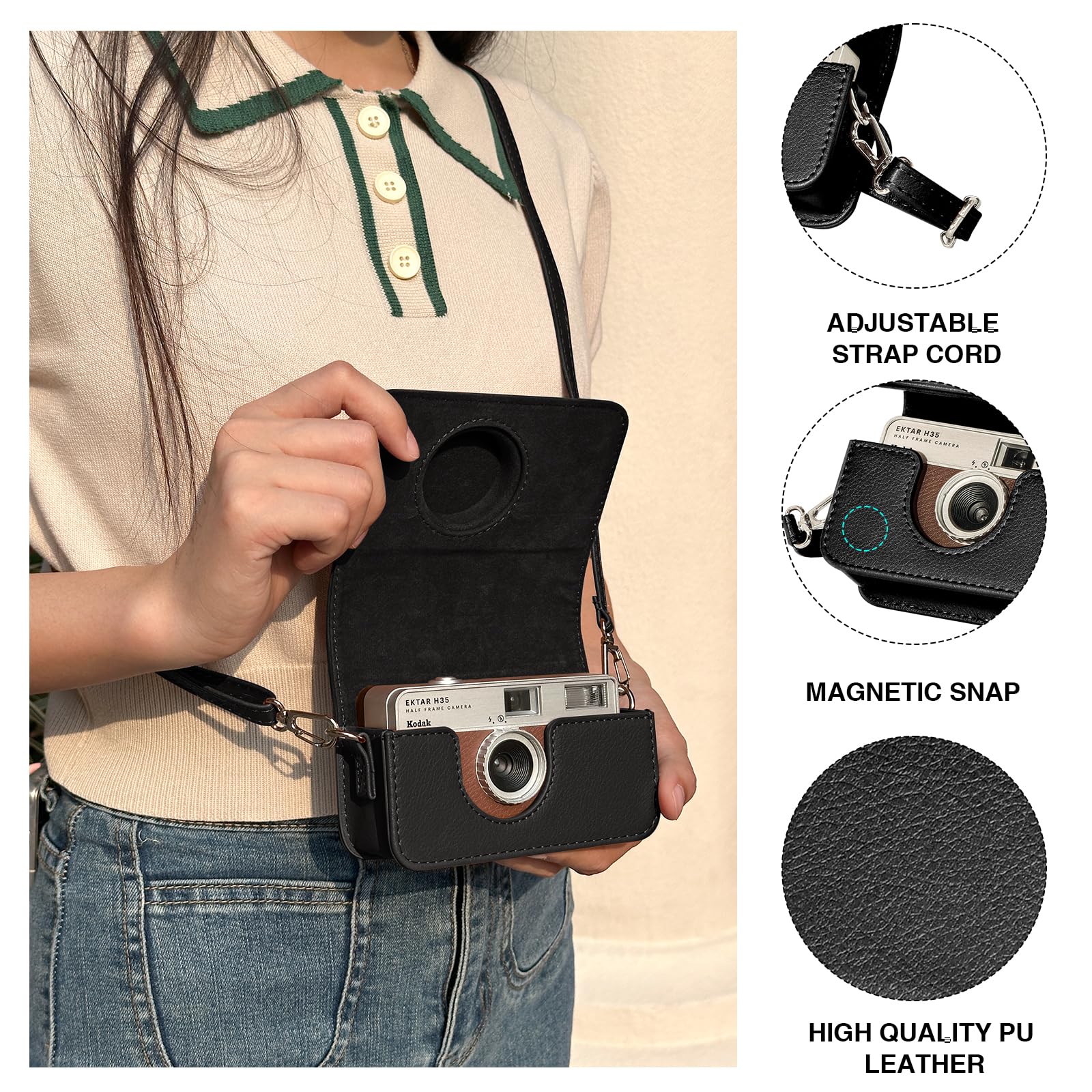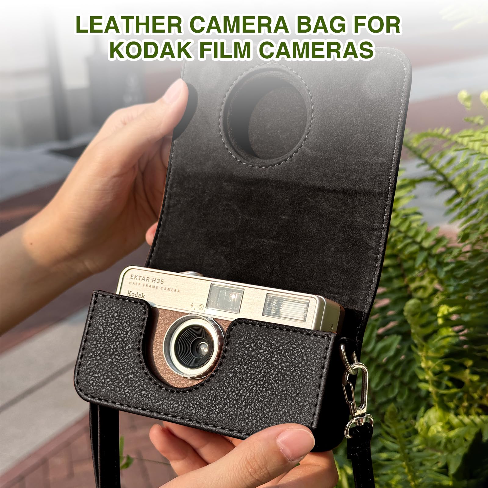 Description Specifications: CAIYOULE, bring color and joy to your happy life! This film camera case specially designed for KODAK EKTAR H35 H35N/F8/F9/VIBE 501F half frame film camera. It is made of high quality PU leather fabric and scratch-resistant microfiber, which is waterproof, prevents the camera from being impacted and scratched by external forces Features: *High-quality PU leather fabric and scratch-resistant microfiber, waterproof, prevent the camera from external impact and scratches! *The magnetic fastening design makes it very convenient to open and close the camera bag. *Adjustable, removable shoulder strap rope, length adjustment as needed. Compatibility: for KODAK EKTAR H35 H35N/F8/F9/VIBE 501F Product List: universal camera case for Kodak x 1 adjustable shoulder strap x 1 Note: Only the camera bag for Kodak, no camera included!