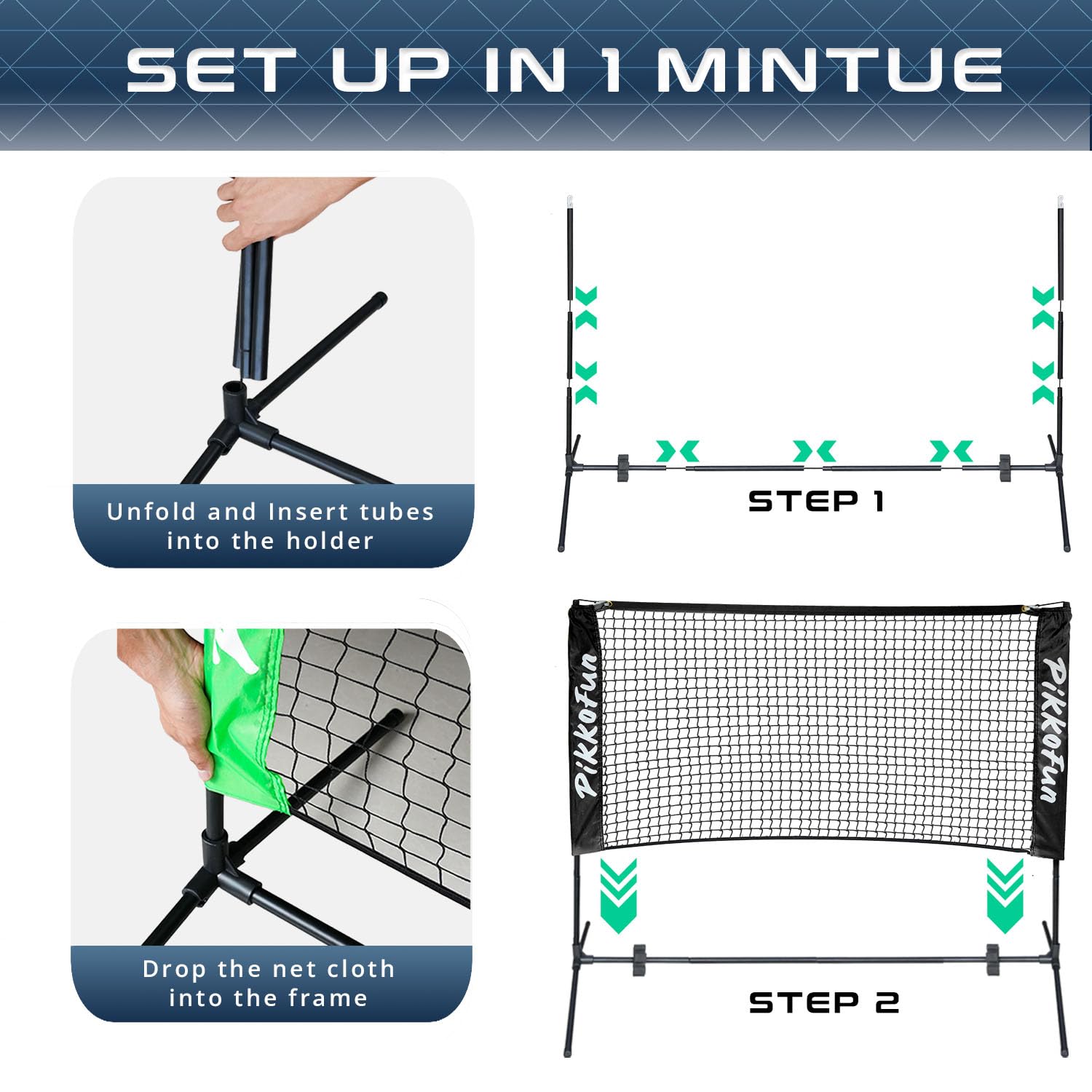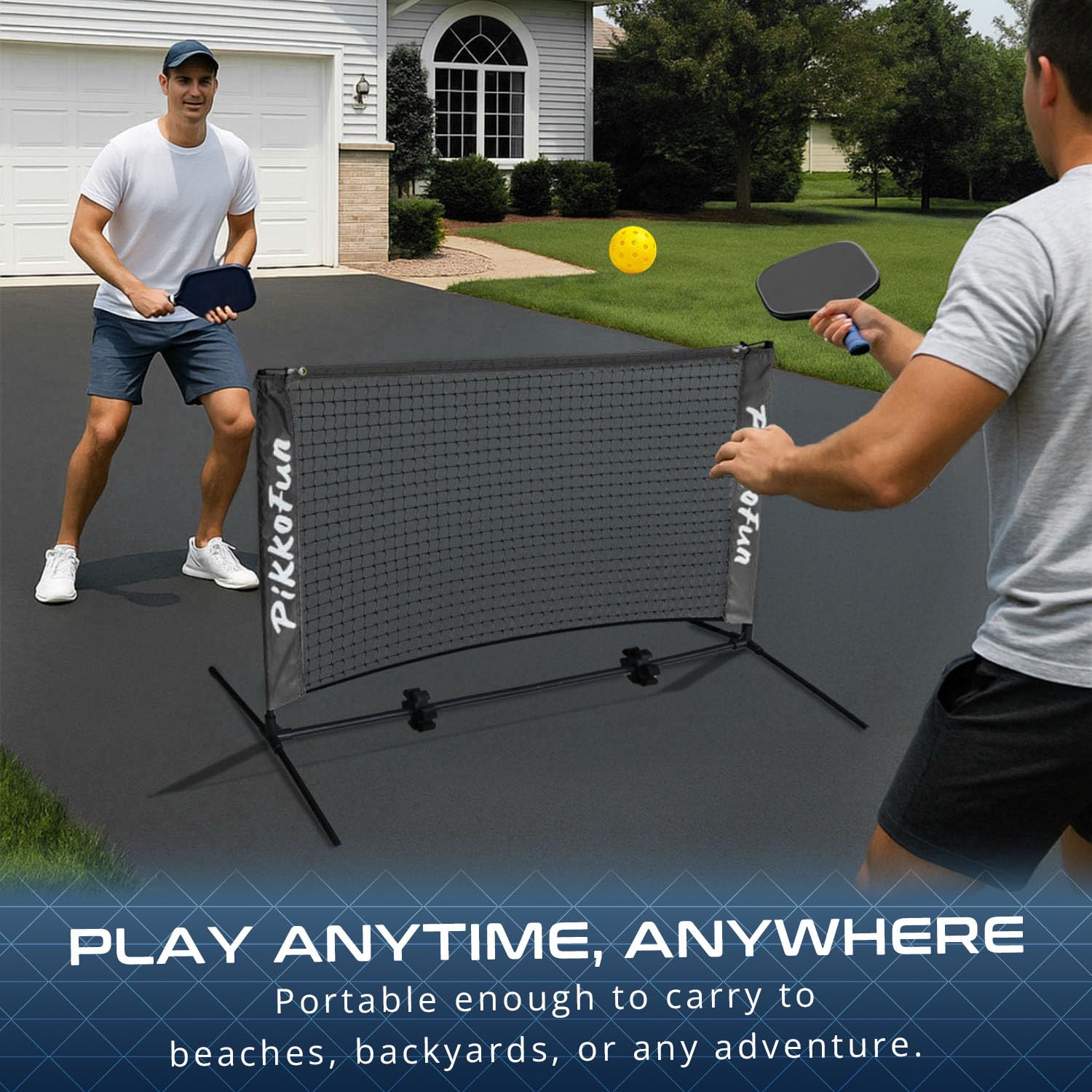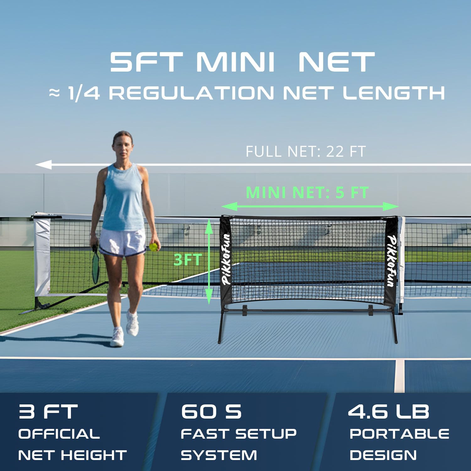 【5 FT (W) x 3 FT (H) MINI NET】The Pikkofun Mini Pickleball Net is a 5FT WIDE small net (NOT a full-size net). It is 1/4 the width of a standard net but maintains the regulation 3ft height (34" center, 36" poles), perfect for dink drills, control practice, or casual family play.