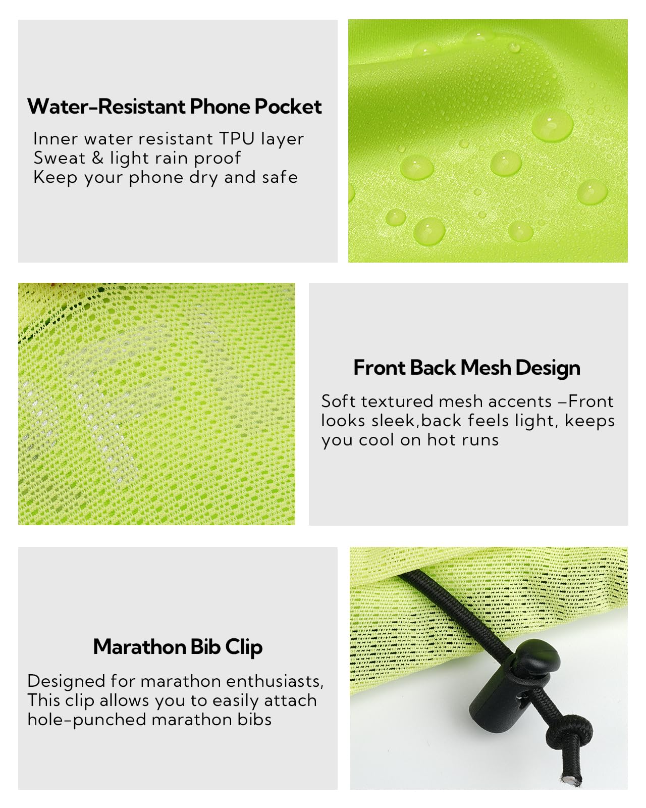 Multiple Pockets for Easy Organization: With 3 pockets, this running bag helps you store items orderly. Water resistant phone pocket fits phones up to 7". Two side zippered mesh pockets securely hold earphones, energy gels, tissues, and keys. Never lose your essentials again!