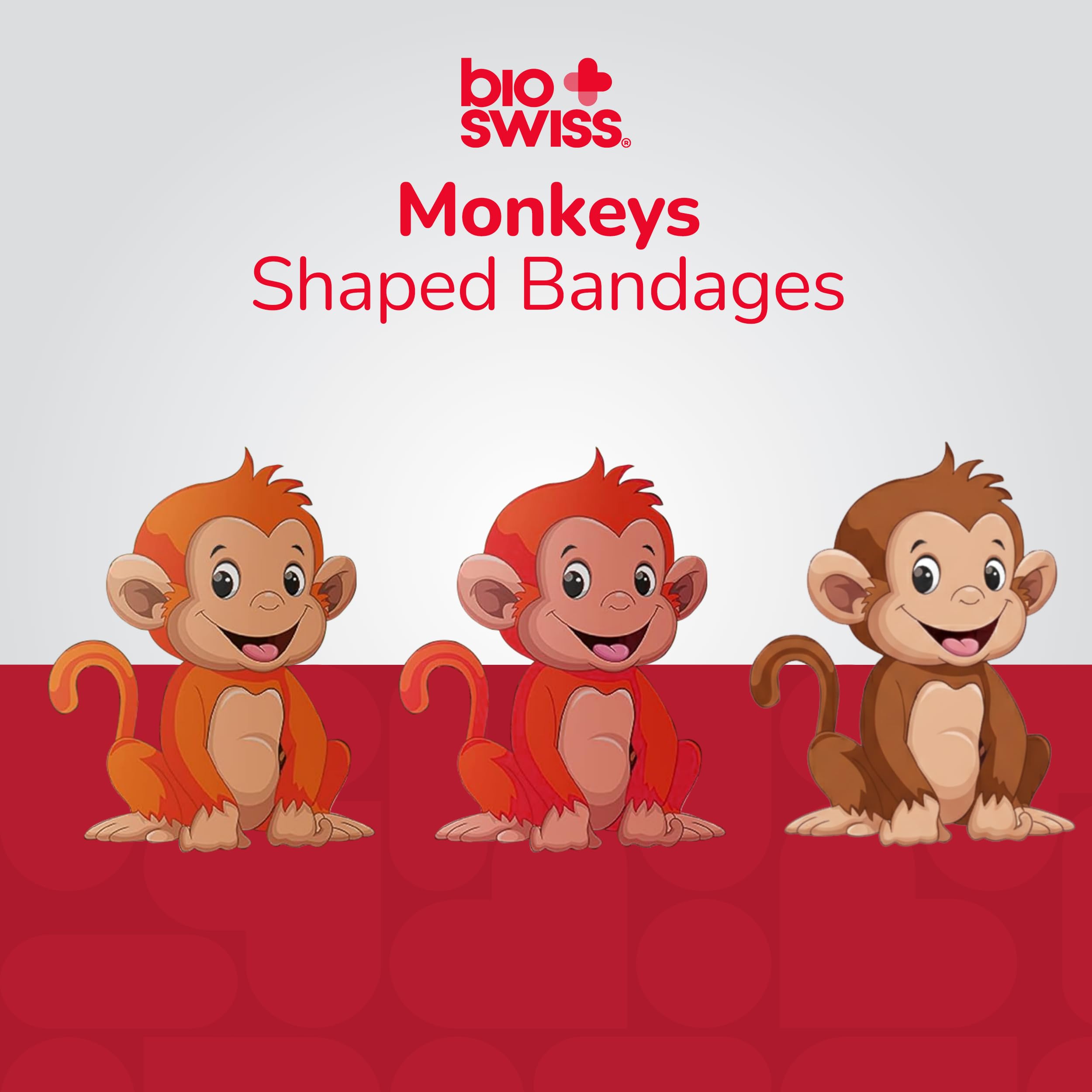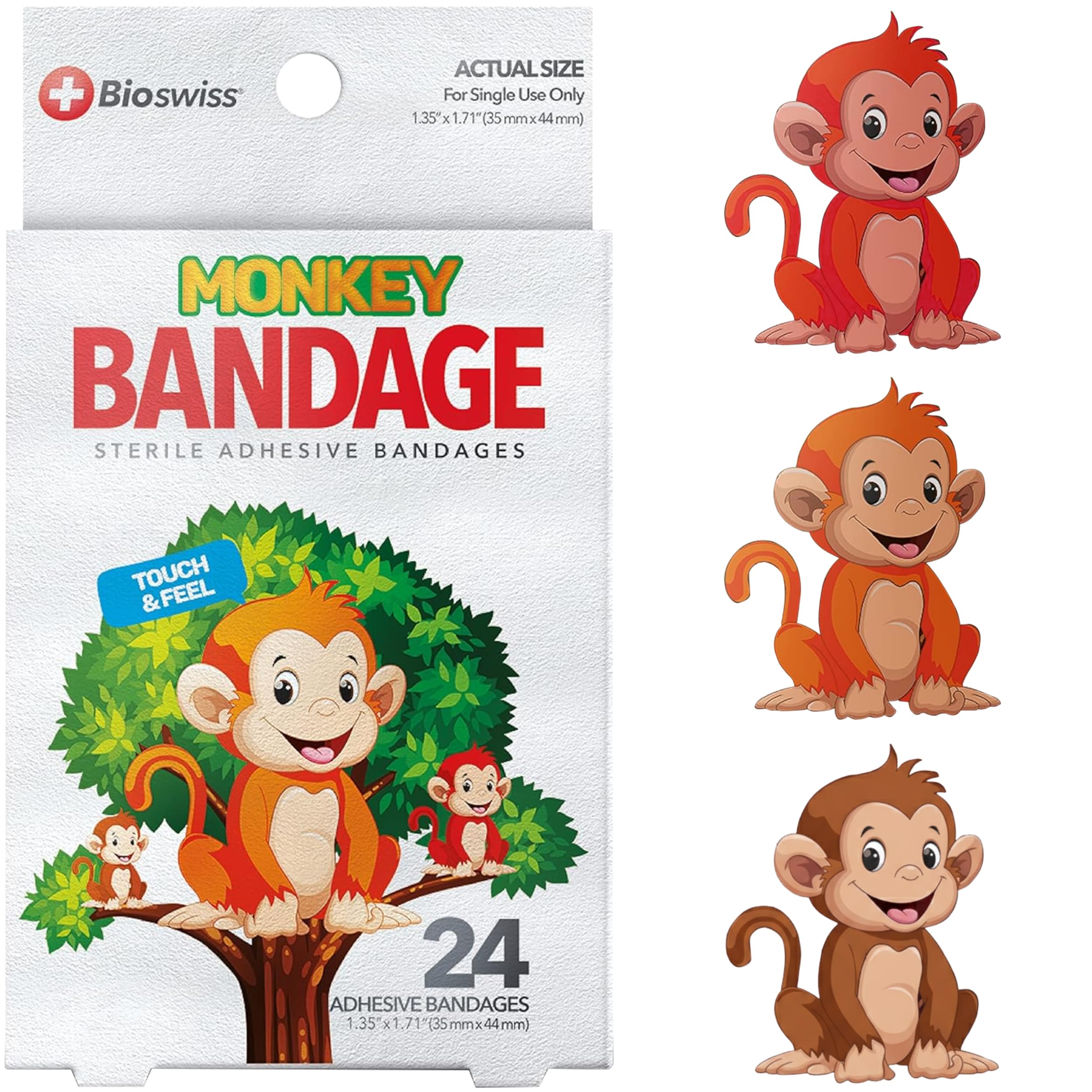 24 MONKEY KIDS BANDAGES: Fun monkey-shaped adhesive bandages pack helps protect cuts, scrapes, and minor wounds while making healing less stressful for children; bandages come in 3 assorted styles