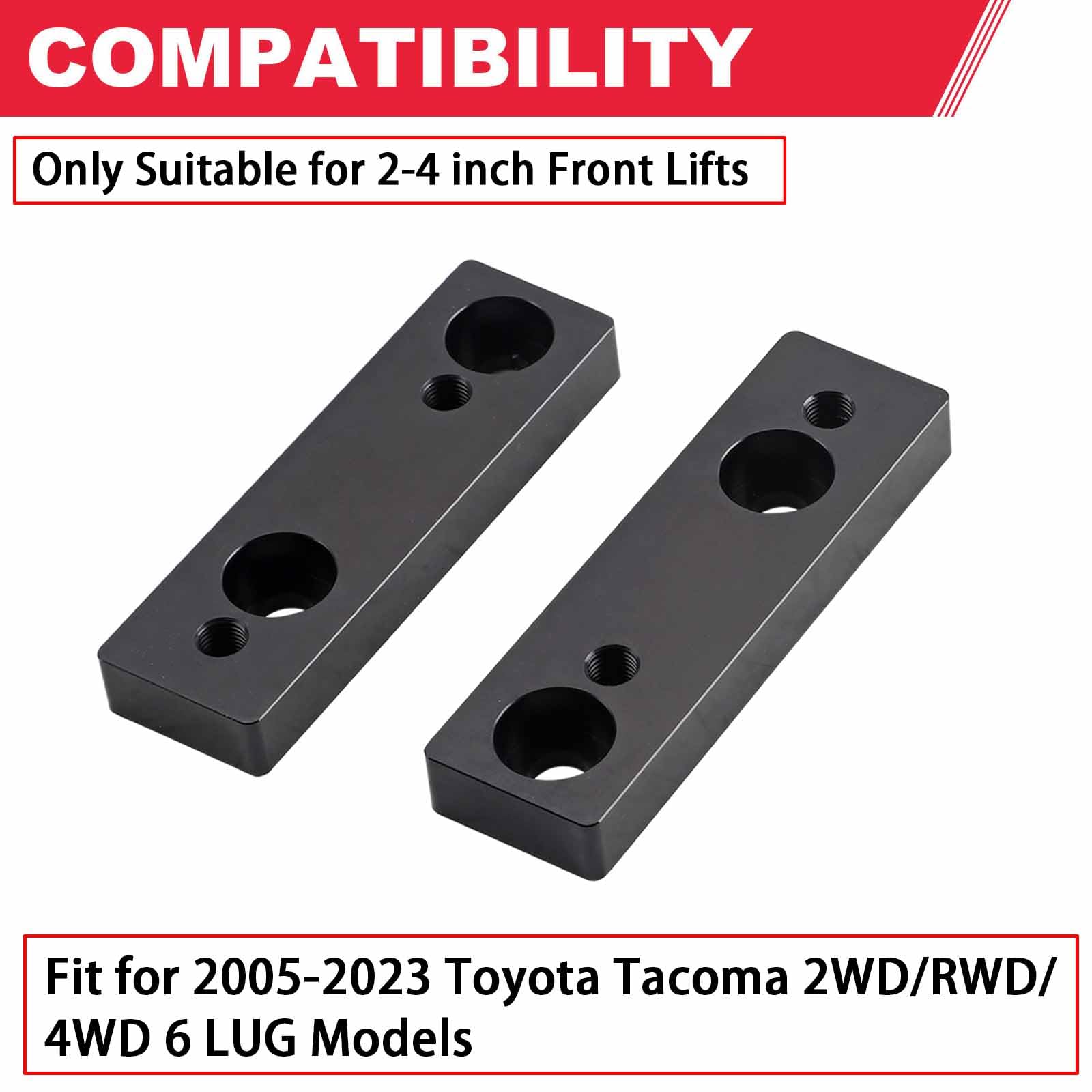Advantage: Tested & Certified to Meet or Exceed OEM Quality Standards. 100% Tested Before Leaving the Factory. Made of High Quality Material. Notice : This Sway Bar Drop Bracket Kit is Only Suitable for 2-4 Inch Front Lifts.Please Confirm Your Model Before Purchasing! Compatible : 2005-2023 Toyota Tacoma Warranty: The Sway Bar Drop Bracket Kit come with 12 Months Warranty. Hassle-Free Return and Refund Policy. Please Buy it with Your Confidence.