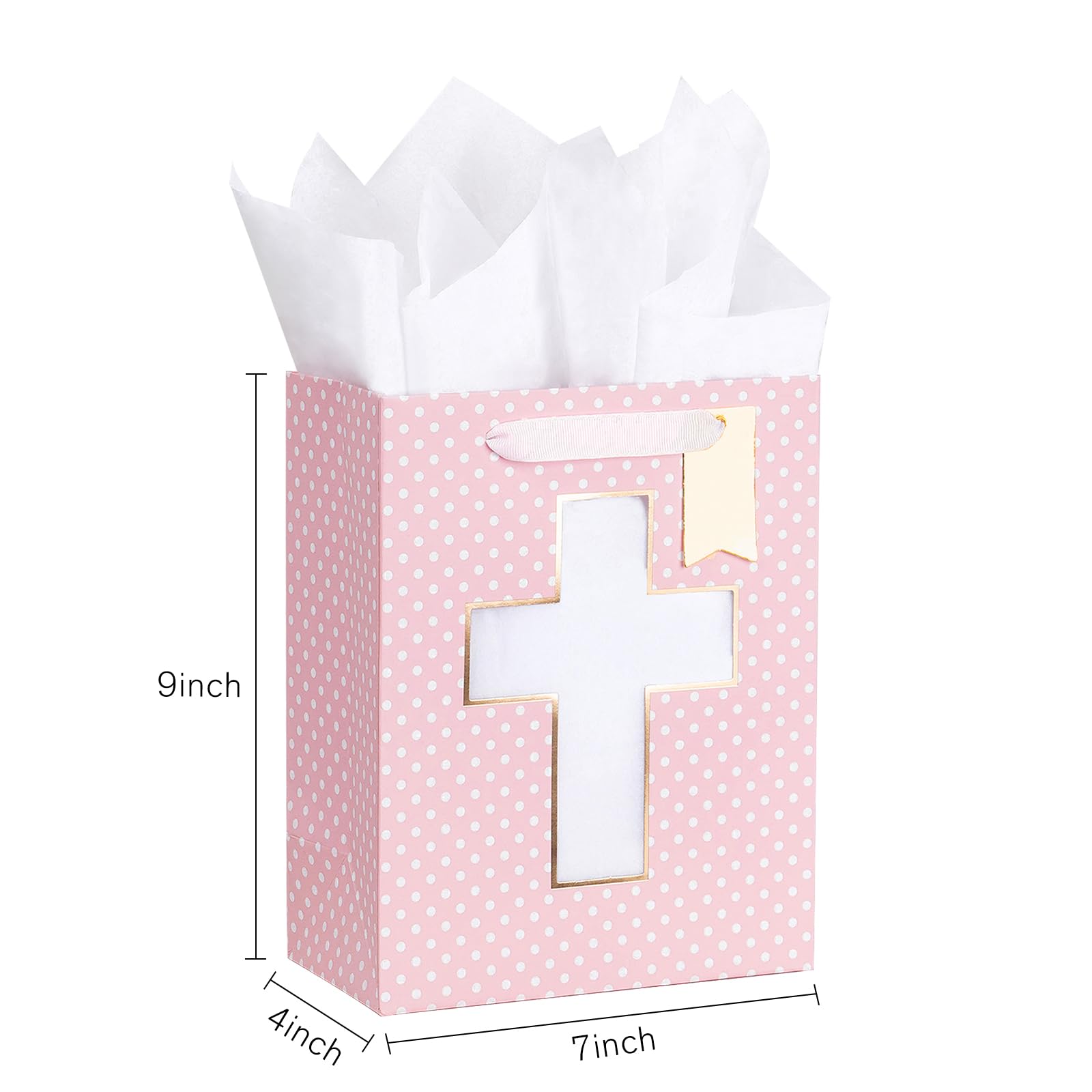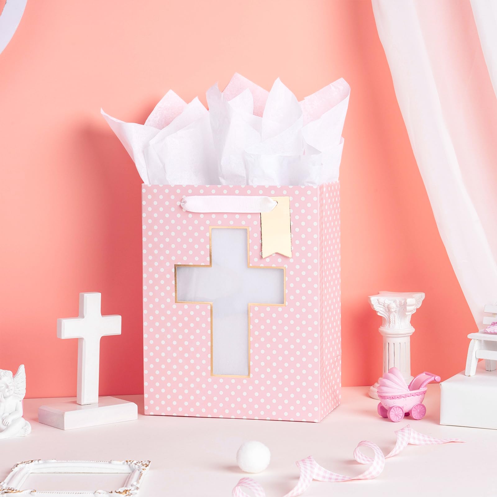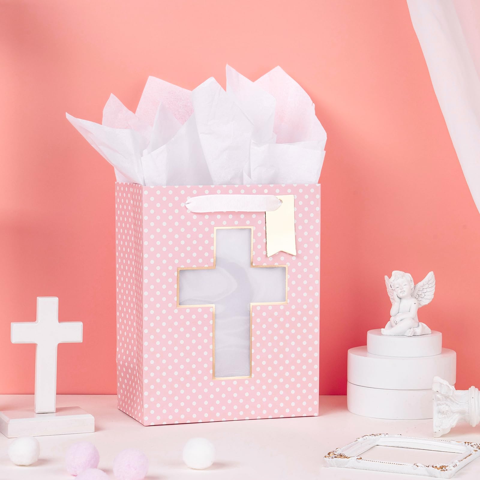 Celebrate your baby girl's most meaningful milestones with the pink gift bag. Featuring a soft pink background with playful white polka dots and a gold foil cross centerpiece, this beautiful design combines elegance with a message of faith and love. The set comes complete with matching pink tissue paper and a coordinating gift tag, so you can wrap and present your gift effortlessly. Made from durable paper with strong ribbon handles, this bag is sized at 7" x 4" x 9", making it perfect for small to medium gifts such as clothing, toys, books or cherished keepsakes. Whether it's for a baptism, christening, first communion, confirmation, Easter or baby shower, this religious gift bag is a thoughtful and convenient way to present your heartfelt blessings.