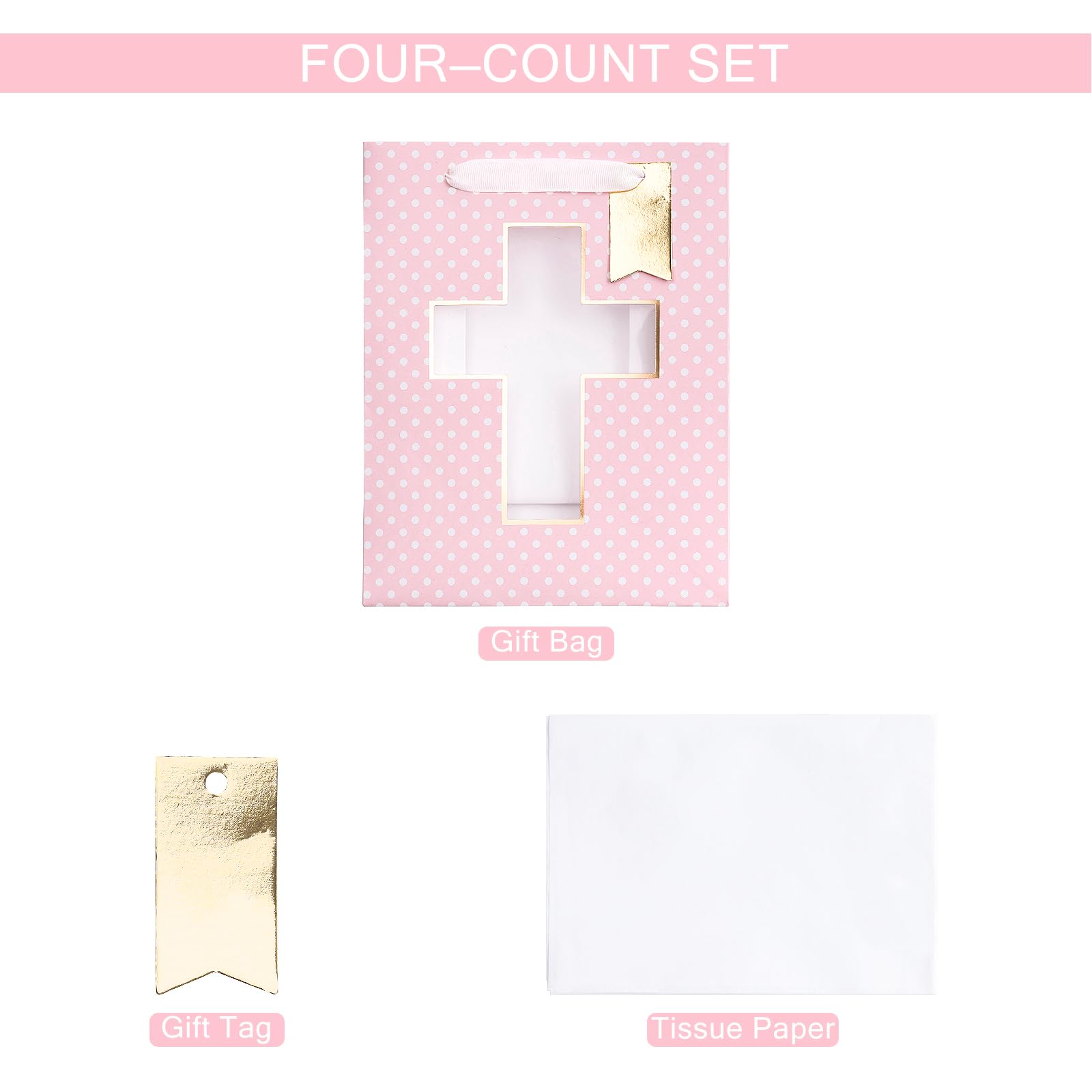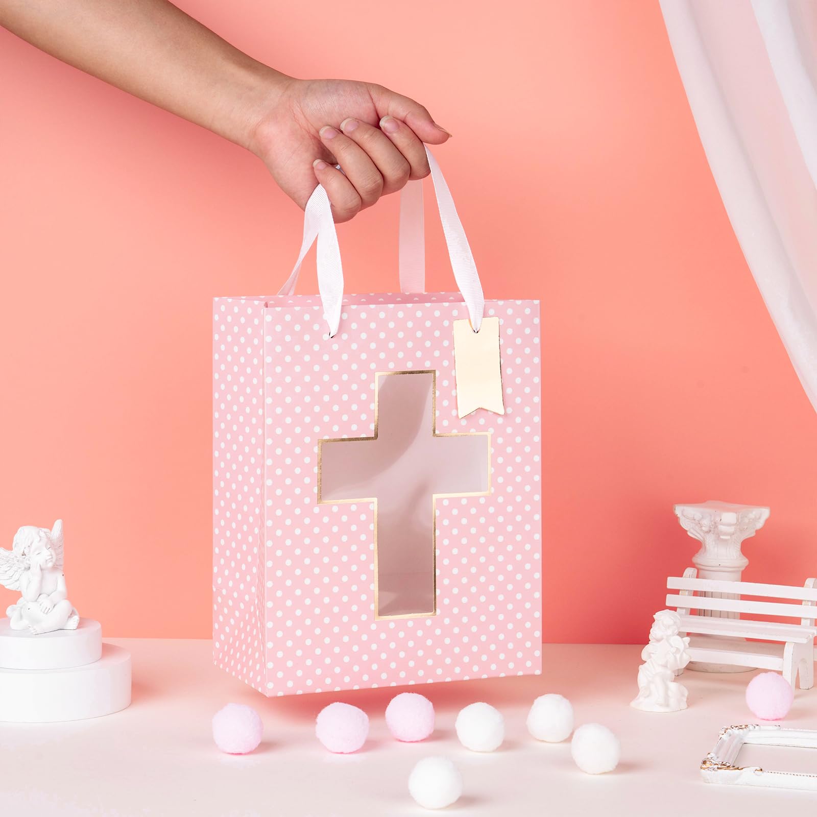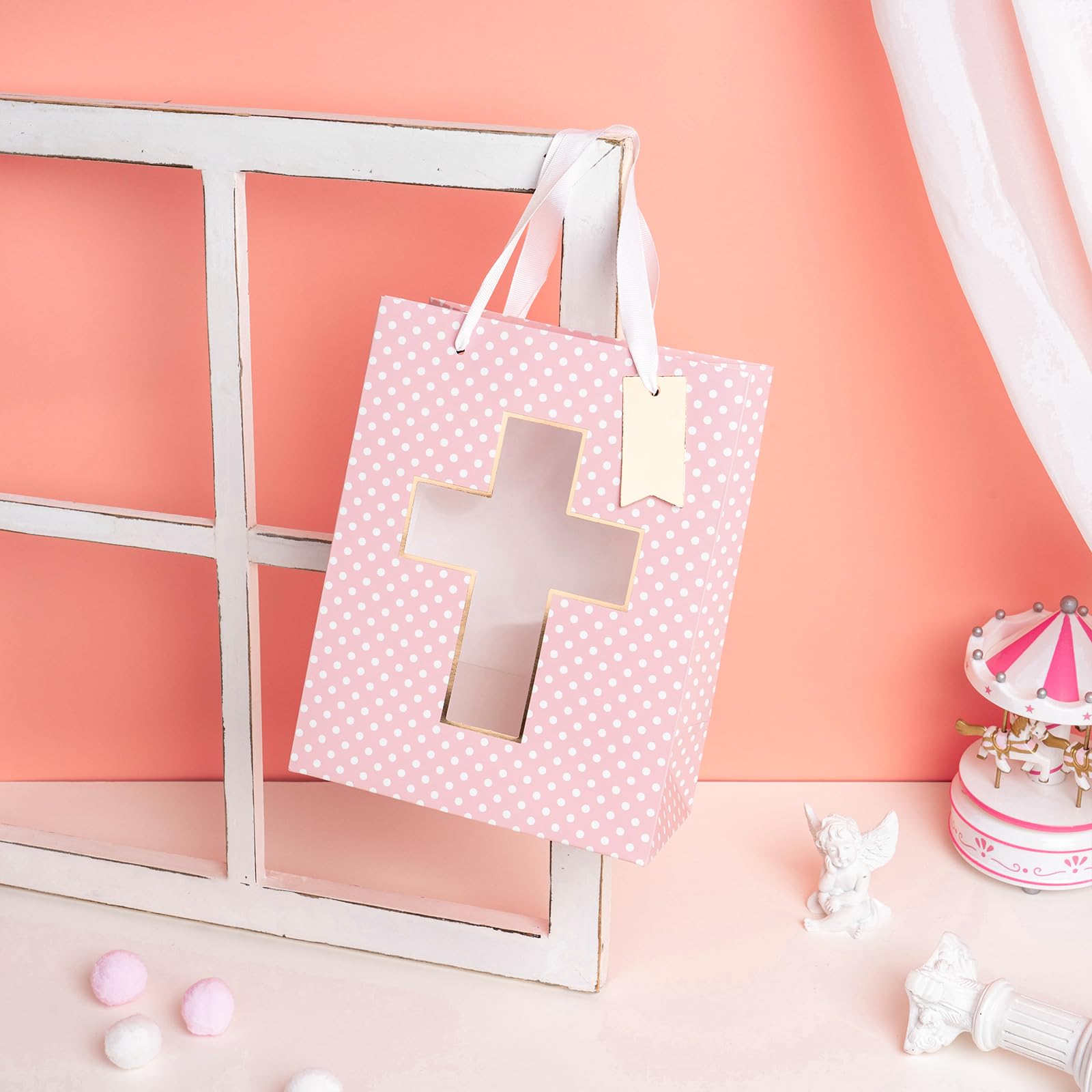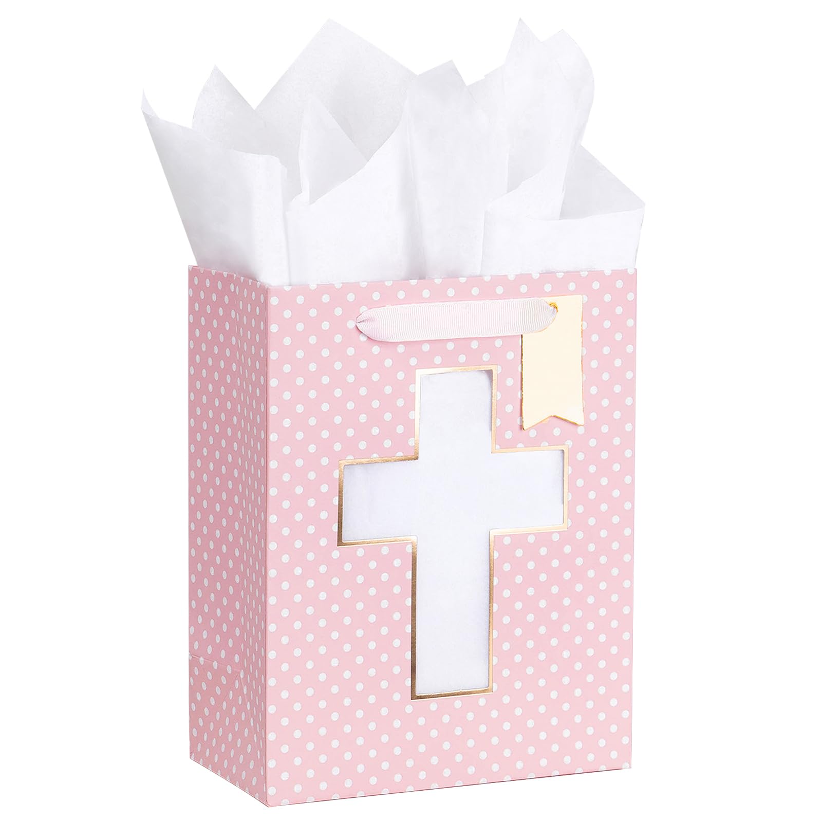 Celebrate your baby girl's most meaningful milestones with the pink gift bag. Featuring a soft pink background with playful white polka dots and a gold foil cross centerpiece, this beautiful design combines elegance with a message of faith and love. The set comes complete with matching pink tissue paper and a coordinating gift tag, so you can wrap and present your gift effortlessly. Made from durable paper with strong ribbon handles, this bag is sized at 7" x 4" x 9", making it perfect for small to medium gifts such as clothing, toys, books or cherished keepsakes. Whether it's for a baptism, christening, first communion, confirmation, Easter or baby shower, this religious gift bag is a thoughtful and convenient way to present your heartfelt blessings.