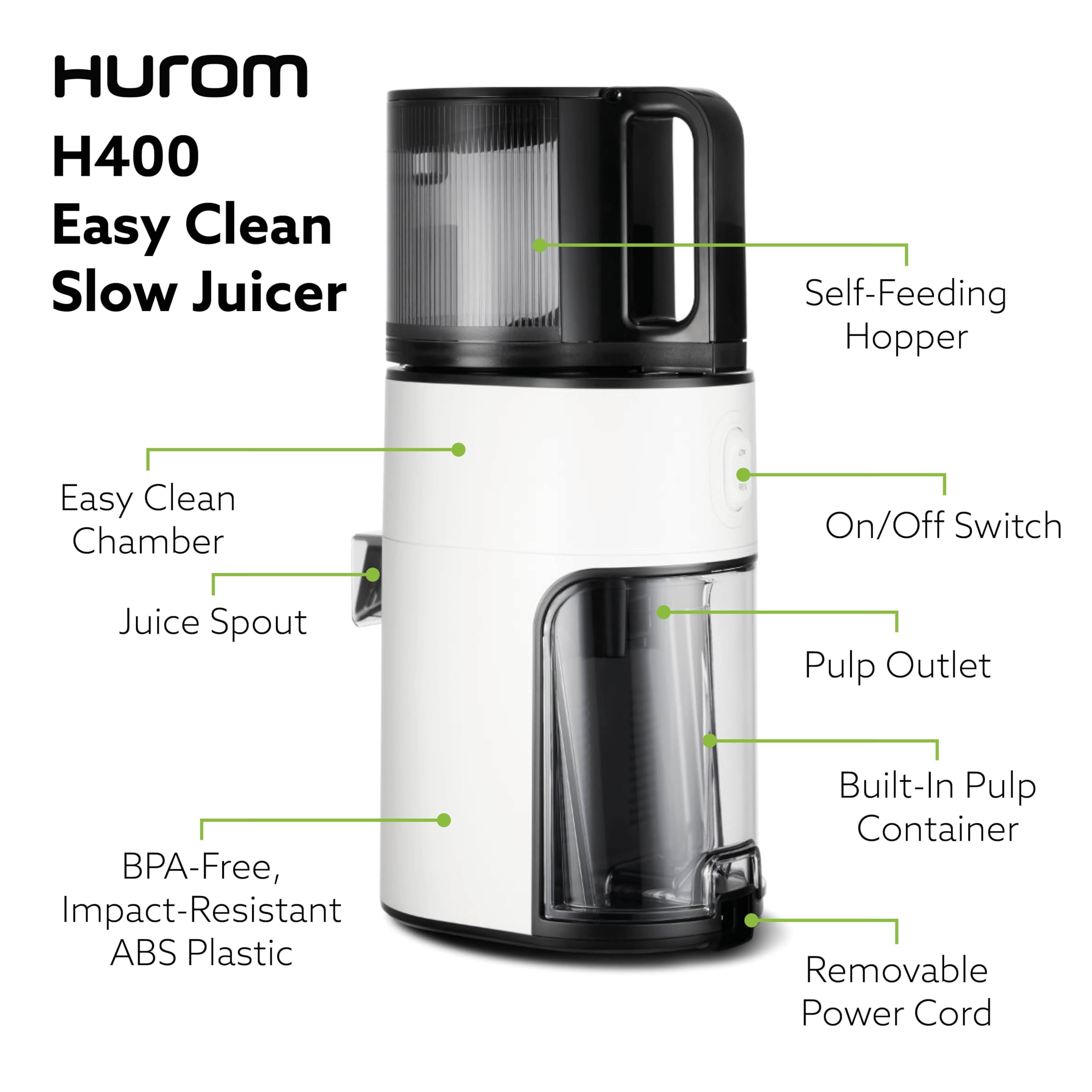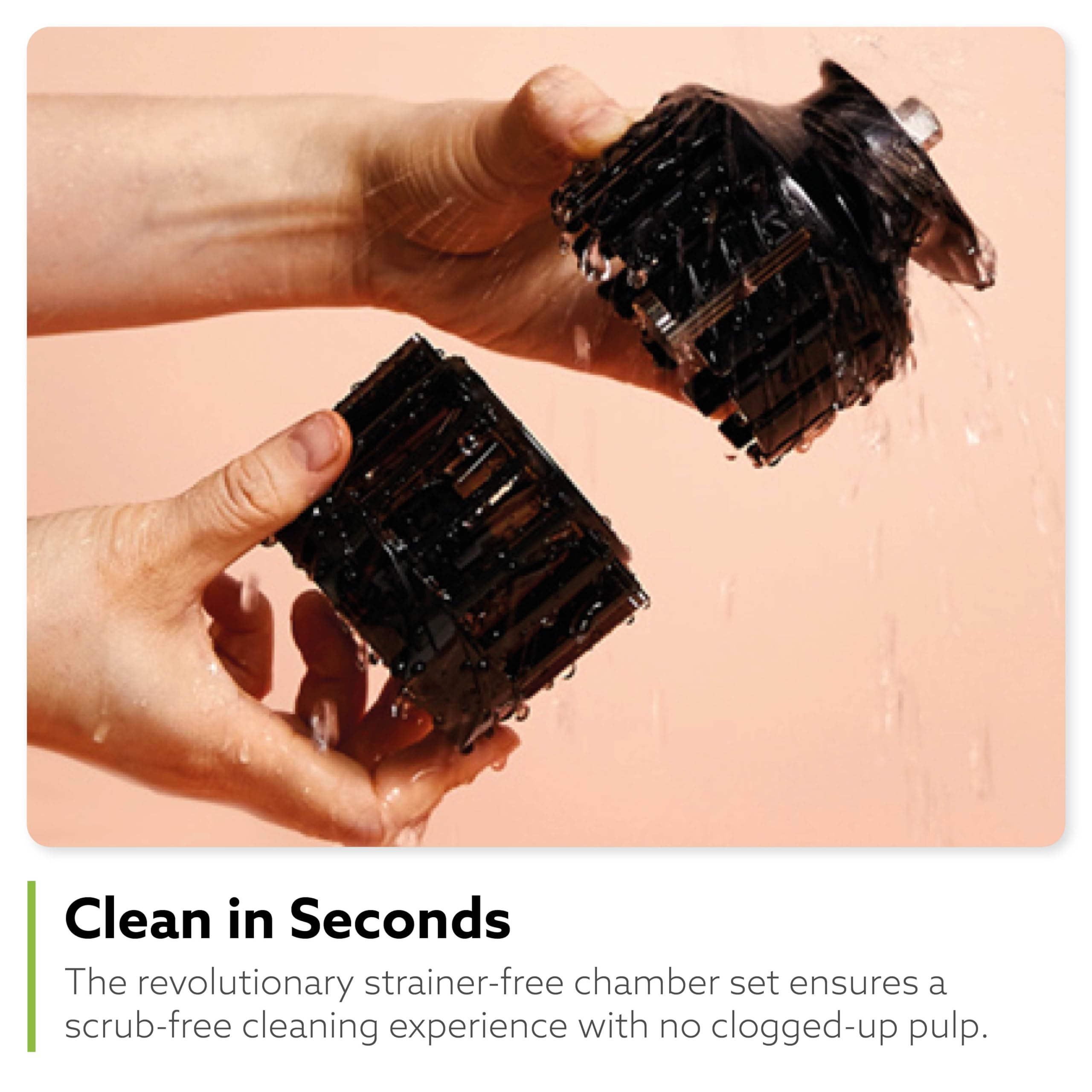 EASY TO CLEAN: Traditional juicers require a strainer which collects minerals and needs extensive scrubbing. The H400 features a revolutionary strainer-free chamber set that ensures a scrub-free cleaning experience with no clogged up pulp.