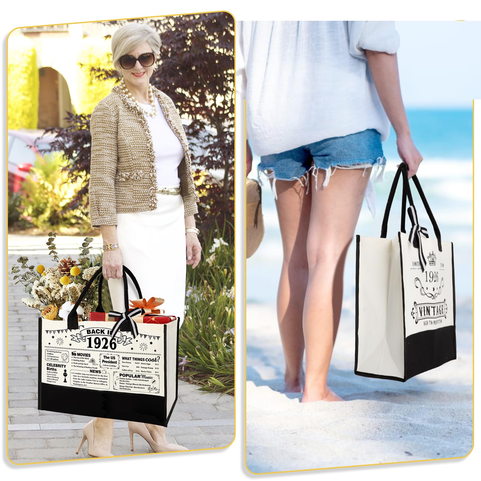 Great Gift for Her 100th Birthday: This gifts set for 100th birthday women contains: 1 X 1926 beach bag, 1 X cosmetic bag, 1 X back in 1926 poster, 1 X greeting card. Unique canvas tote bag gifts set will be a adorable gift for women's 100th birthday. This birthday 100 gifts themed idea makes the perfect choice for putting a smile on her face on their special day.