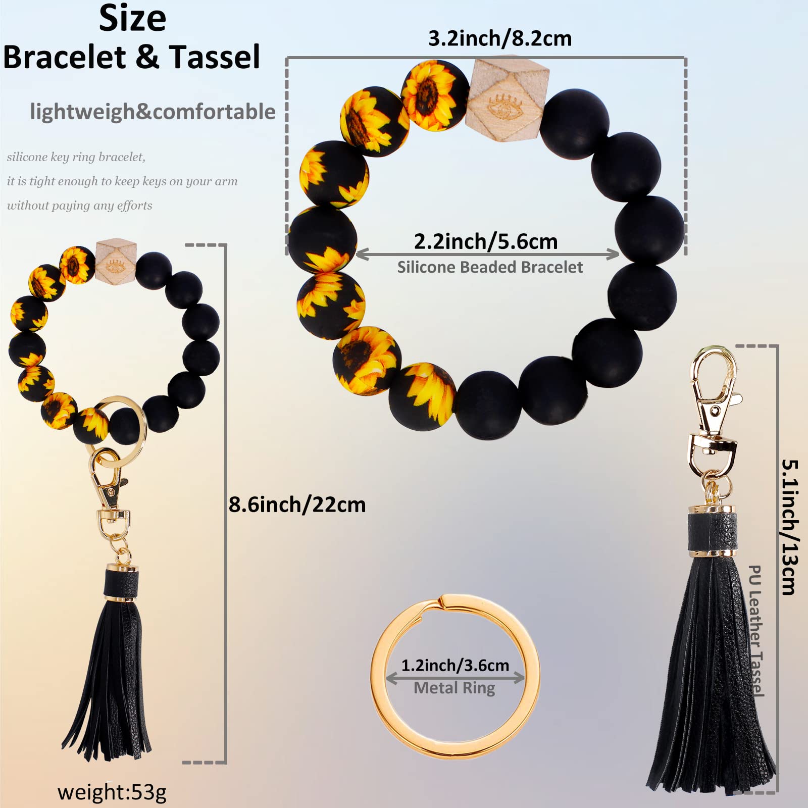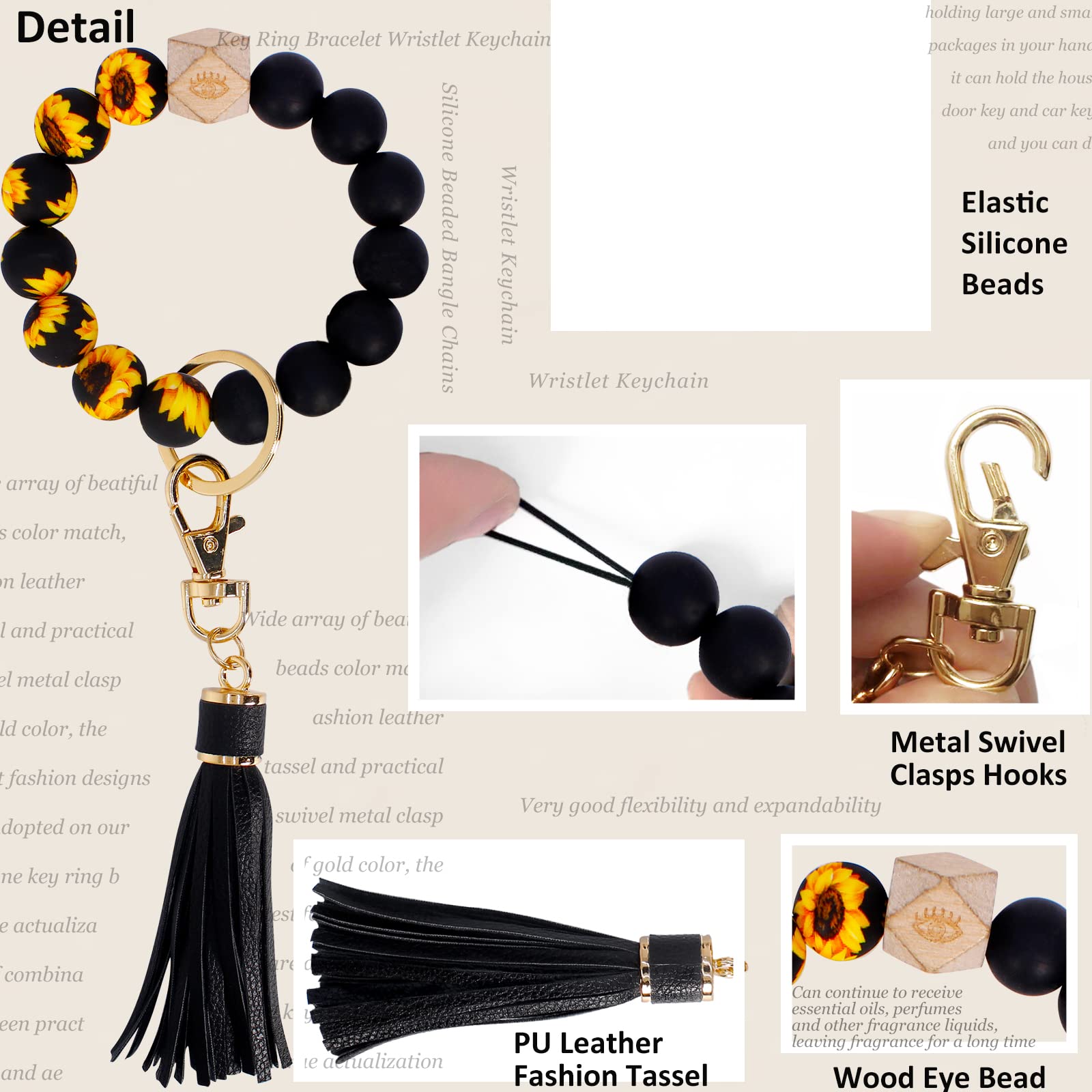 Elastic Closure: this beaded keychain bracelet is lightweight, bracelet is composed of 14 silicone beads, 1 wooden bead and 1 PU leather tassel with a metal swivel clasp hook(easy to open and close). The silicone bead is smooth and elastic, and all the beads are threaded together with a double-stranded line.