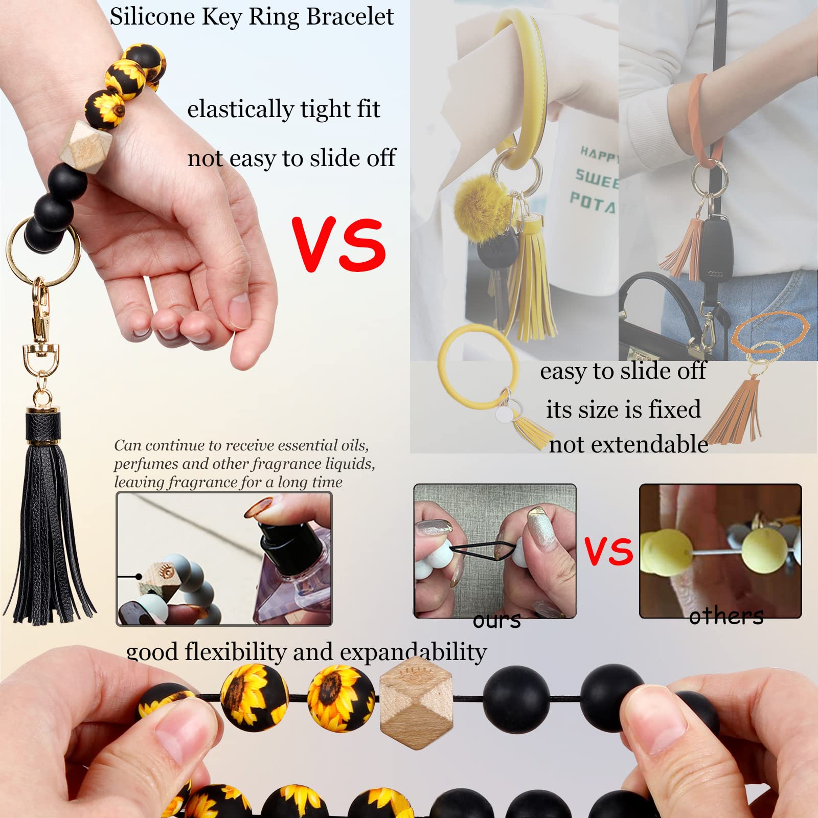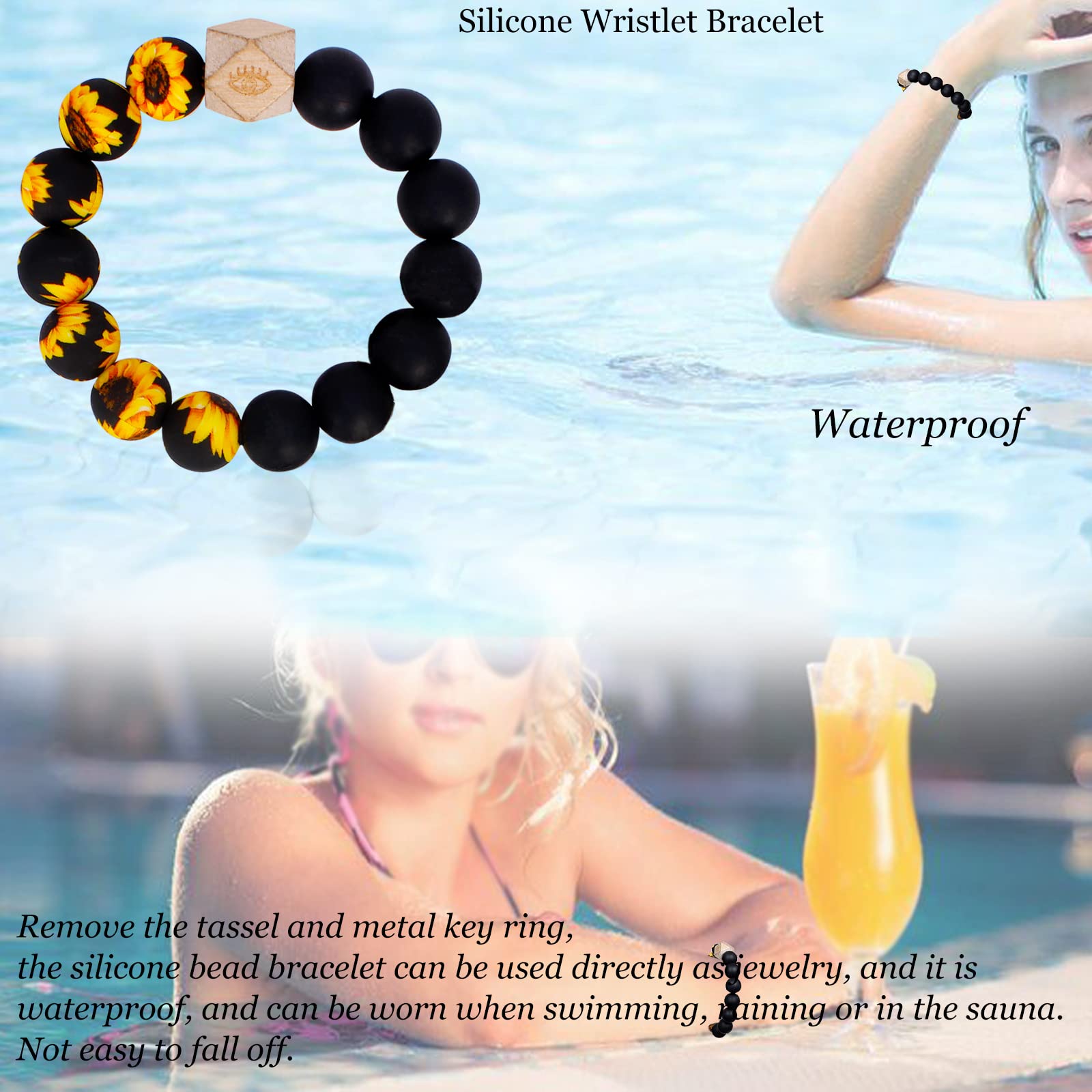 Comfortable to wear and Waterproof silicone beads:The smooth surface of the beads rolls smoothly on your wrist. The natural wooden bead can be continued to receive essential oils, perfumes and other fragrance liquids, leaving fragrance for a long time. This silicone beaded bracelet keychain tassel is not fall off as other wristlet band as picture show.Note only silicone beads is waterproof, not other parts.