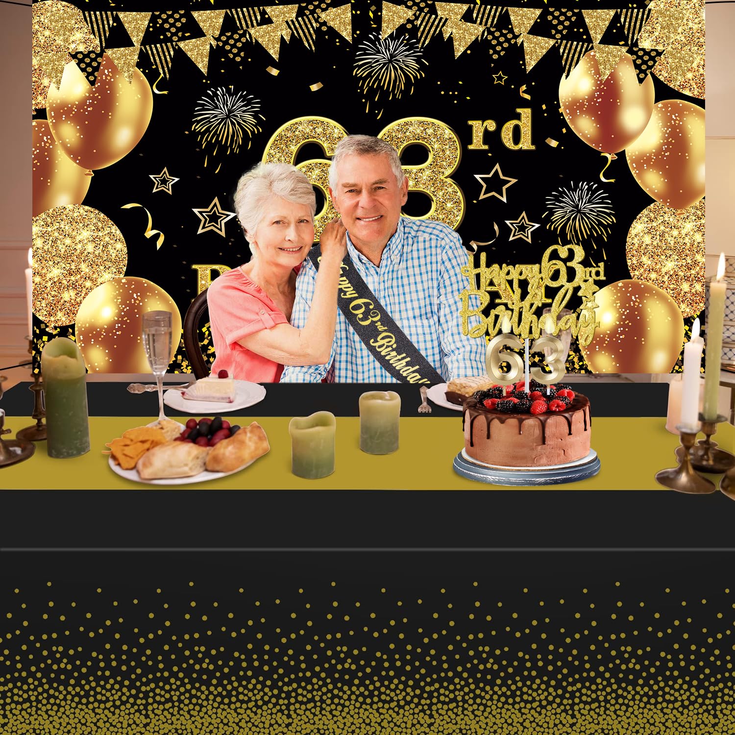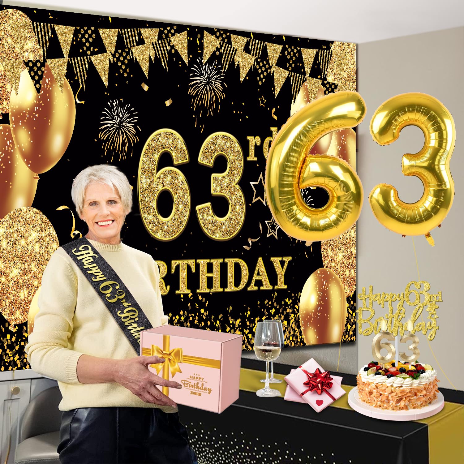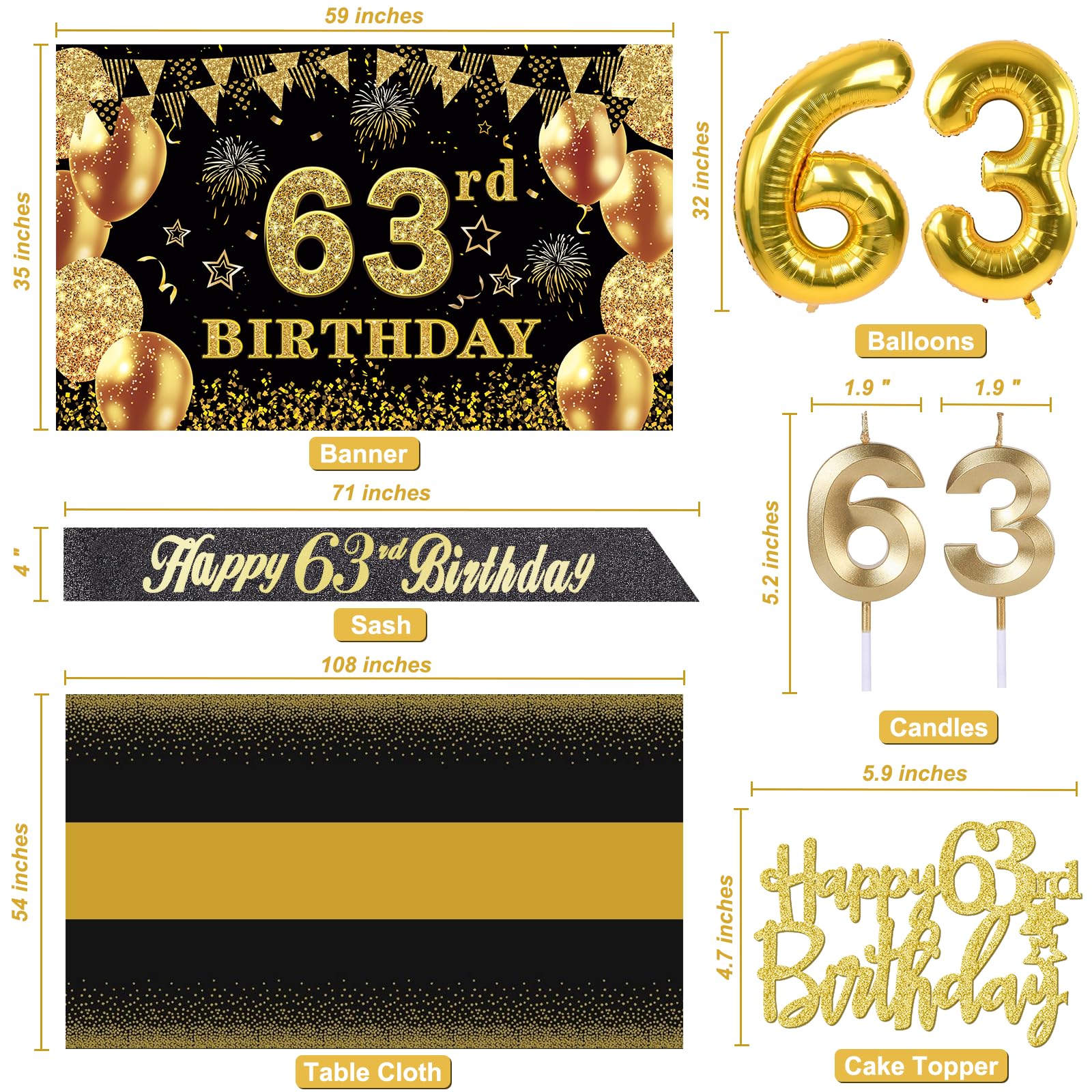 63rd Birthday Decorations Kit: Packing coming with Large 63rd Birthday Banner x 1pc, Big Gold 63rd Birthday Balloons x 1set, Black and Gold Table Cloth x 1pc, Black Glittery with Gold Foil Words Happy 63rd Birthday Sash x 1pc, Happy 63rd Birthday Cake Topper x 1pc, Gold Number 63 Candles x 1set. This Value Black and Gold Party Decorations Set Meet Your Every Needs and Expects in 63rd Birthday Milestone