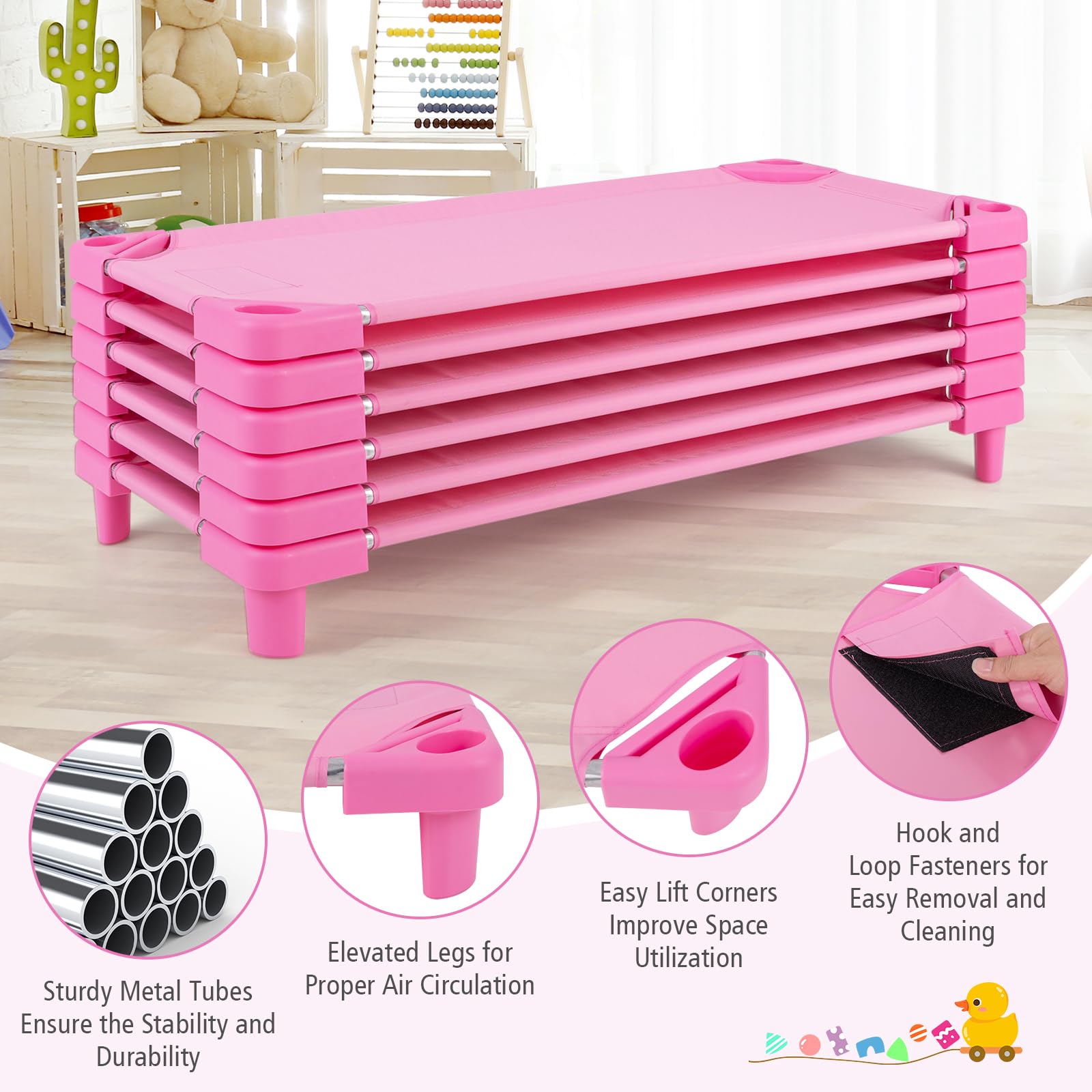 KOTEK Stackable Sleeping Daycare Cots for Kids, Portable Toddler Nap Cots, 52" L x 23" W, Ready-to-Assemble, Space-Saving Children Naptime Cot for Classroom Preschool (Set of 6, Pink)