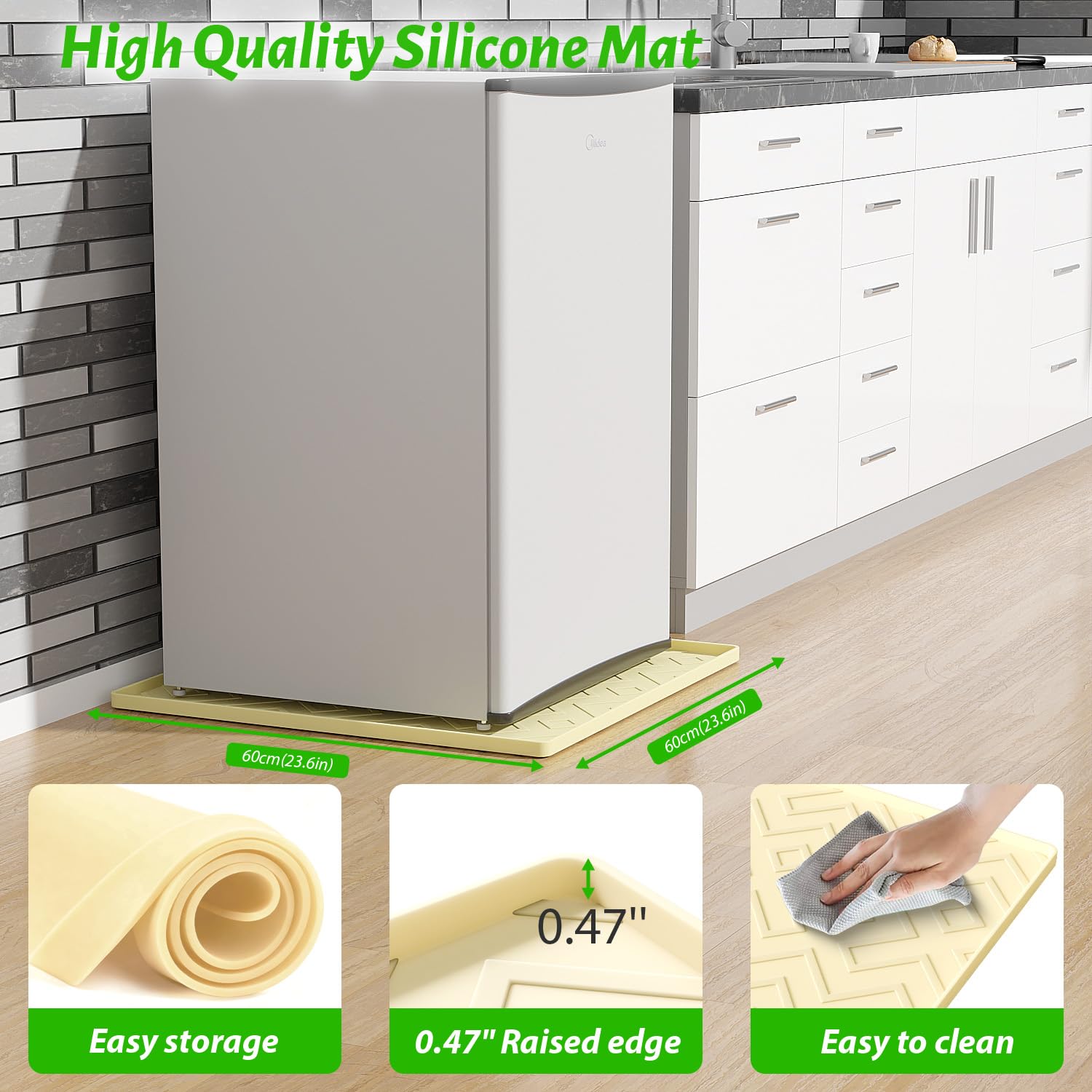 EWX Mini Fridge Silicone Mat 23.6"x23.6"x0.4" - Non-Slip, Spill-Proof, Drip Prevention Protect your home and appliances with the EWX Mini Fridge Silicone Mat. This versatile, high-quality mat keeps your floors clean and dry, making it ideal for mini fridges, washing machines, dryers, wine coolers, and dishwashers. Key Features: Non-Slip Design Our silicone mat features a robust non-slip surface that keeps your appliances securely in place, whether on tiles, hardwood floors, or floors. Spill-Proof and Drip Prevention Expertly designed to catch and contain leaks or spills, this mat keeps your floors clean and dry, protecting your surfaces from water damage. Easy to Clean Simply wipe it down with a damp cloth or rinse under running water. The durable silicone material resists stains and odors. Perfect Size With dimensions of 23.6"x23.6"x0.4", this mat provides ample coverage for most household appliances, offering reliable protection for a wide range of uses. Multi-Functional Use Ideal for mini fridges, washing machines, dryers, wine coolers, and dishwashers. Its versatility means you can use it wherever extra protection is needed. High-Quality Construction Made from premium, food-grade silicone, this mat withstands daily wear and tear, offering a long-lasting solution for your appliance needs. Why Choose EWX? At EWX, we are committed to providing high-quality, reliable products that meet your needs. Our silicone mat offers superior performance and protection for your home appliances. Product Specifications: Dimensions: 23.6"x23.6"x0.4" Material: Food-grade silicone Color: Gray Weight: Lightweight yet durable Package Includes: 1 x EWX Mini Fridge Silicone Mat Enhance the longevity of your appliances and maintain a clean, dry home environment with the EWX Mini Fridge Silicone Mat. Order yours today and experience the difference in quality and performance.