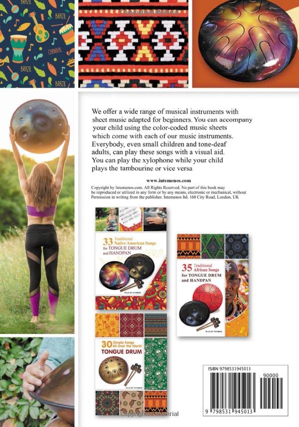 The steel tongue drum (aka tong drum, tank drum, gluck-o-phone, hapi drum, mandala, or lotus drum) and the handpan (aka hank drum, UFO drum, zen drum) are percussion musical instruments designed to help you focus on your feelings, sensations, and body. You don't need classical music training or knowledge of music theory to play them. The main purpose is relaxation, meditation, and traveling through your inner world. Playing traditional music notes is difficult for people who have no musical knowledge. You need to know the rhythmic value of each note, its place on the staff, note duration, and its combination with other notes. To be aware of all this simultaneously demands music experience and advanced skills. Nevertheless, even if you have never studied music, you can begin to play complicated melodies, and also experiment with your tongue drum in a meditative way. No previous training or skills are necessary to enjoy these fascinating instruments. It is impossible to play them incorrectly. Anyone can play them: those who want to develop a good sense of rhythm and an ear for music, those who are seeking relaxation after a hard day at work, those who have always had an interest in learning how to play a musical instrument, and those who want to introduce something unusual into their lives and explore their inner selves. All songs in this book have been written without using the classic music score system because it is for absolute beginners who cannot read sheet music. We collect very simple and well-known songs and melodies with easy rhythms. You can begin to play just now using circles that contain either a number, without having to consider note duration, key, or time signatures. These numbers correspond to those on the keys of your tongue drum. So you just need to follow the numbers. We use circles with numbers because most modern tongue drums have numbers engraved or painted on their keys. We do not show the note duration - we just group the circles closer to each other to show the rhythms. You can experiment with a duration on your own. Because most tongue drums include and are tuned to involve the notes of the main octave, all songs from this book are possible to play in one octave. This book includes very simple, popular children's and folk songs, but even well-known children's songs played on the drum will create an unusual magical sound. Attention: Songs have been transposed for a DIATONIC range. Some melodies might be changed and simplified. Contents Alphabet Song A Hunting We Will Go A Sailor Went to Sea Acka Backa Are You Sleeping? Baa Baa Black Sheep Baby Bumble Bee Bell Horses Bim Bum Biddy Bobby Shafto Brahms Lullaby Chumbara Cobbler, Mend My Shoe Cock-a-Doodle Doo Ding Dong DiggiDiggiDong Do You Know the Muffin Man? Doggie Doggie Fiddle-Dee-Dee Five Little Ducks Five Little Monkeys Frog in the Meadow Happy Birthday Hot Cross Buns Humpty Dumpty I Like to Eat Apples and Bananas I Love Little Kitty It's Raining Itsy Bitsy Spider Jack and Jill Jingle Bells Jolly Old Saint Nicholas Kookaburra La Cucaracha Little Jack Horner London Bridge Mary Had a Little Lamb Miss Mary Mack My Hat Ninety-Nine Bottles Ode to Joy Oh Susannah Oh We Can Play on the Big Bass Drum Old Bald Eagle Old Blue Old McDonald Old Mother Hubbard One, Two, Three, Four Rain, Rain, Go Away Ring Around the Rosie Row Row Your Boat Rub-a-Dub-Dub See-Saw Margery Daw Ten in the Bed The Bee and the Pup The Big Sheep The Mulberry Bush The Wheels on the Bus This Old Man Tinga Layo To Market, To Market Twinkle, Twinkle Little Star We Wish You a Merry Christmas