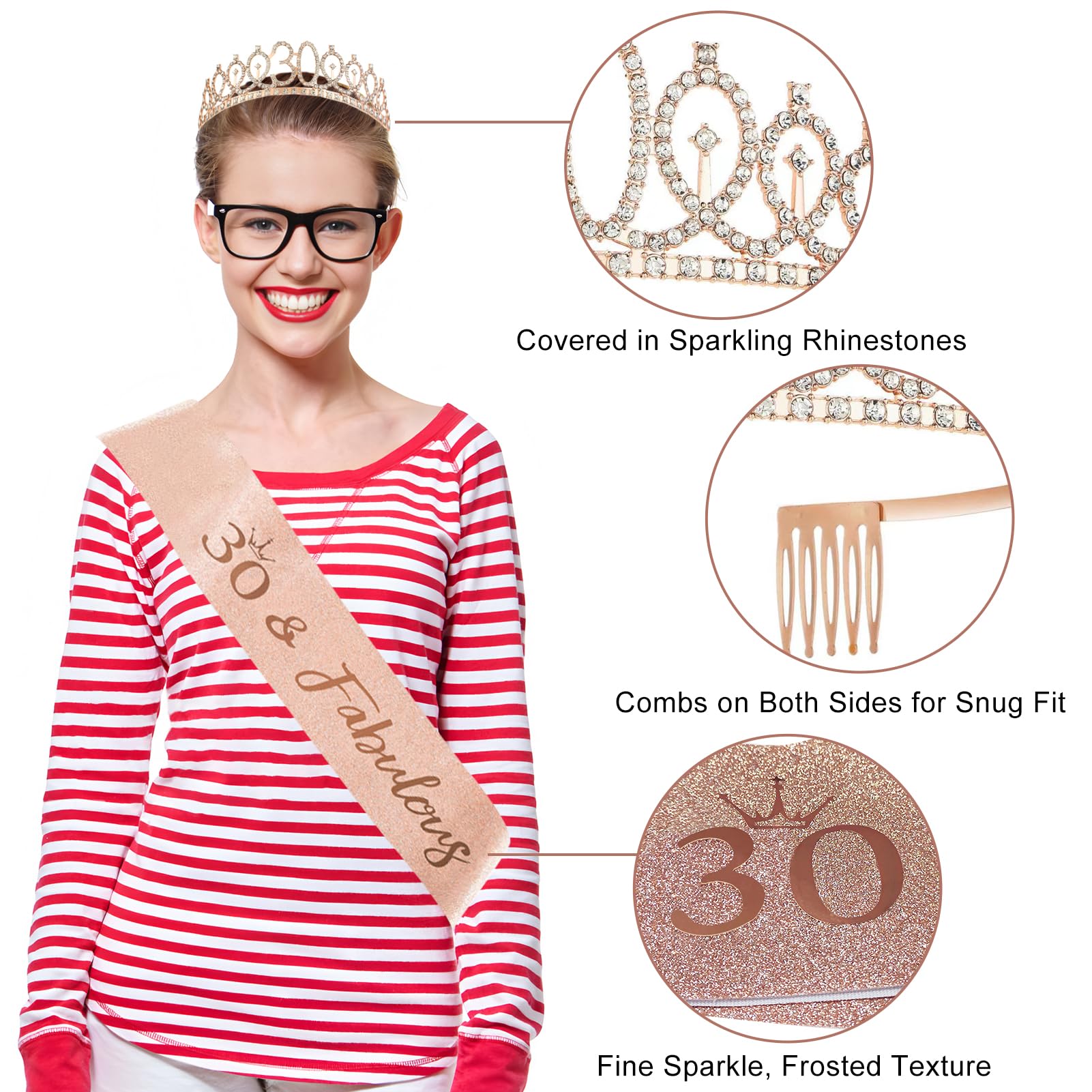 Happy 30th birthday decorations kit: The sparkling design of 30th birthday crown and sash suits women of all body shapes, makes the thirty birthday protagonist shine in the party