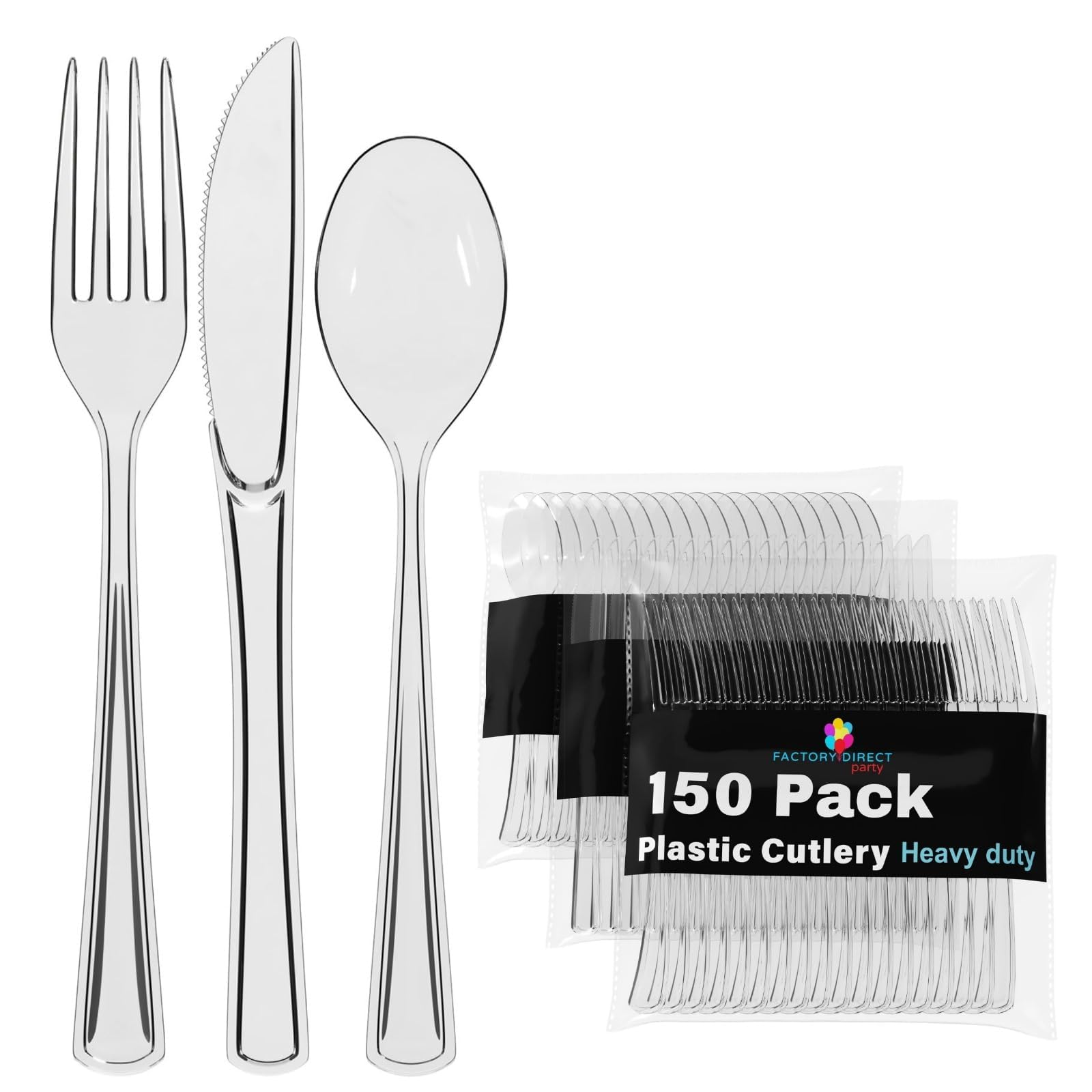 Includes: Each plastic silverware set contains 50 clear forks, 50 clear spoons, and 50 clear knives each measuring 7.5 inches, making it the ideal purchase for your upcoming party needs. A super convenient plastic cutlery set with all your plastic silverware in it. Offering multiple different color options, they are sure to match your decor.