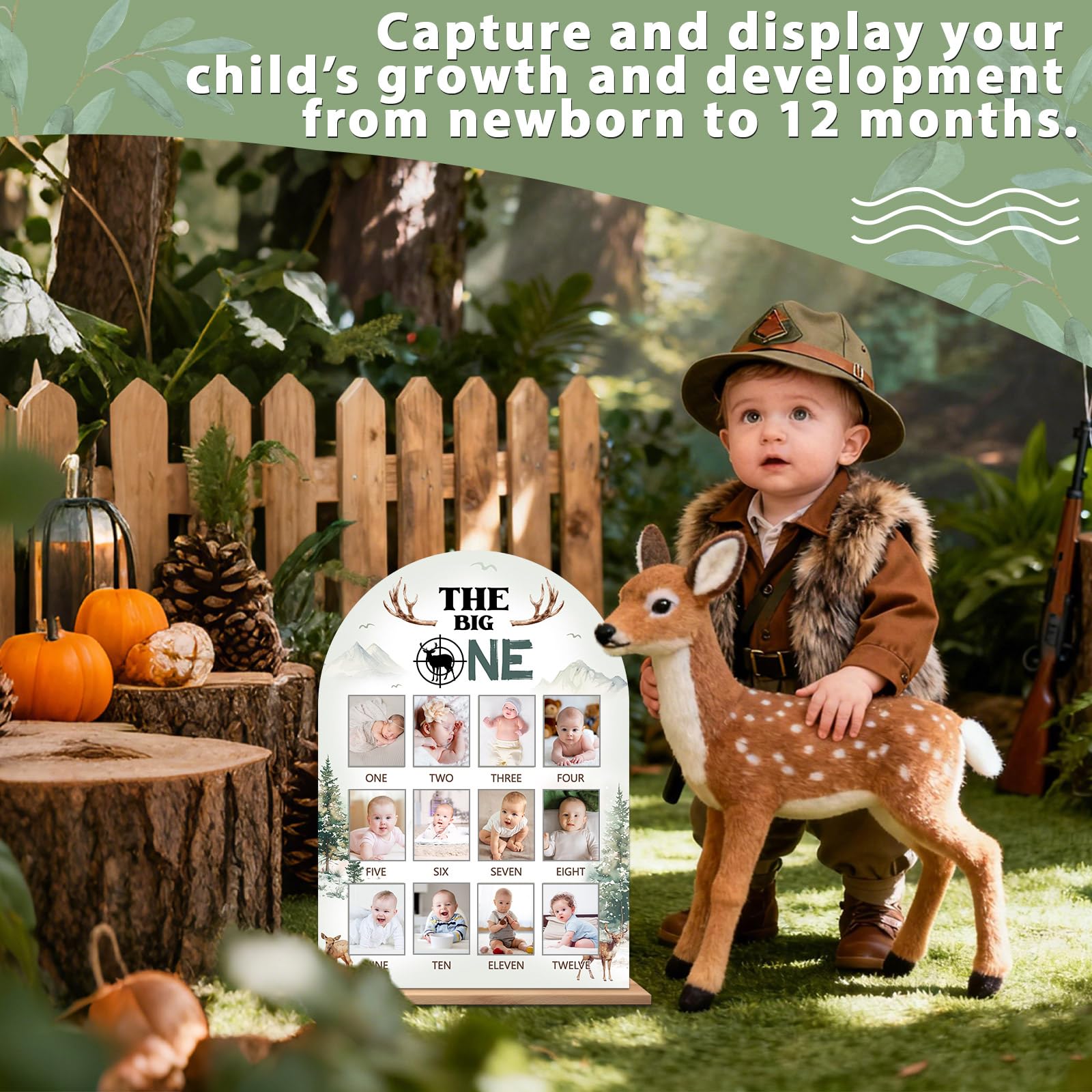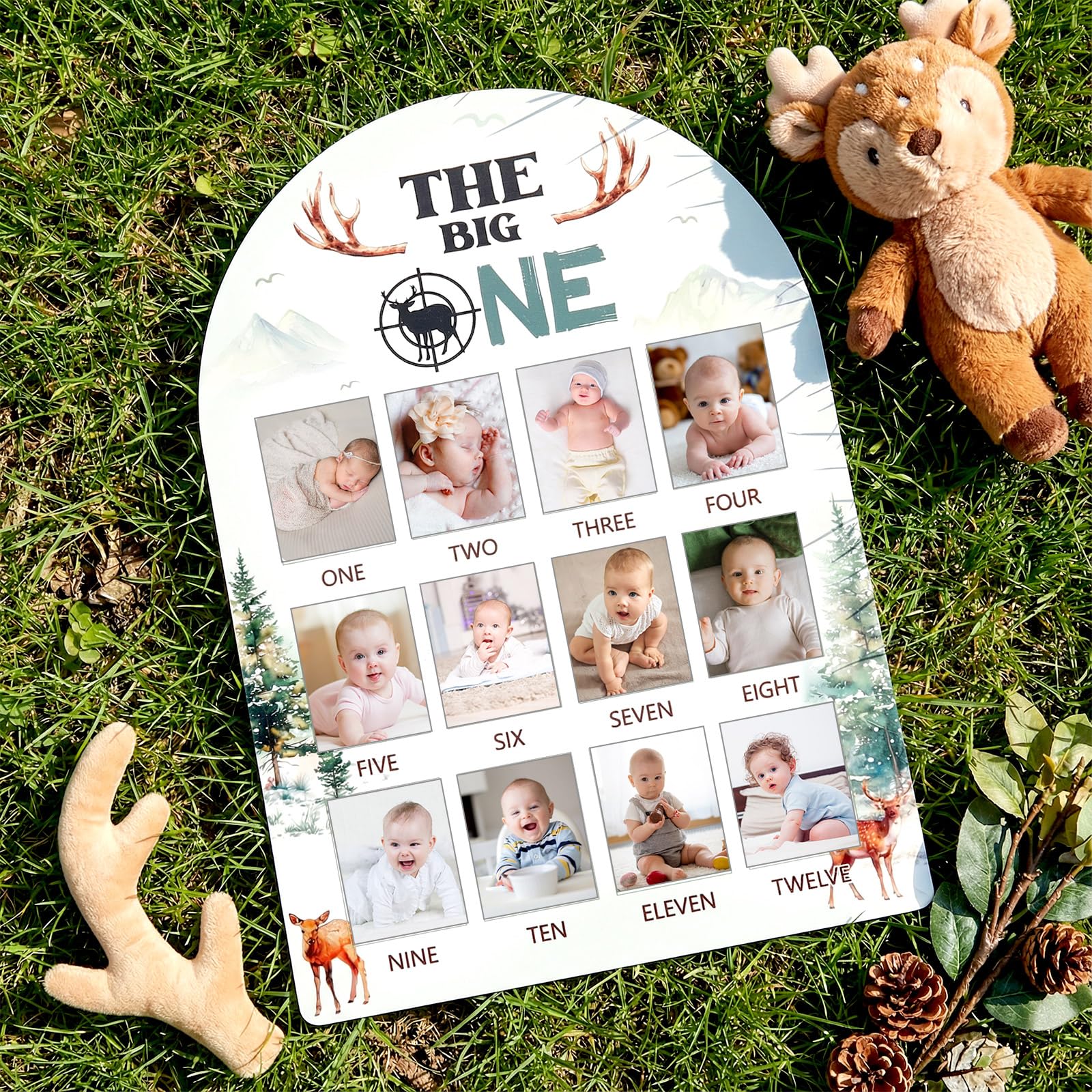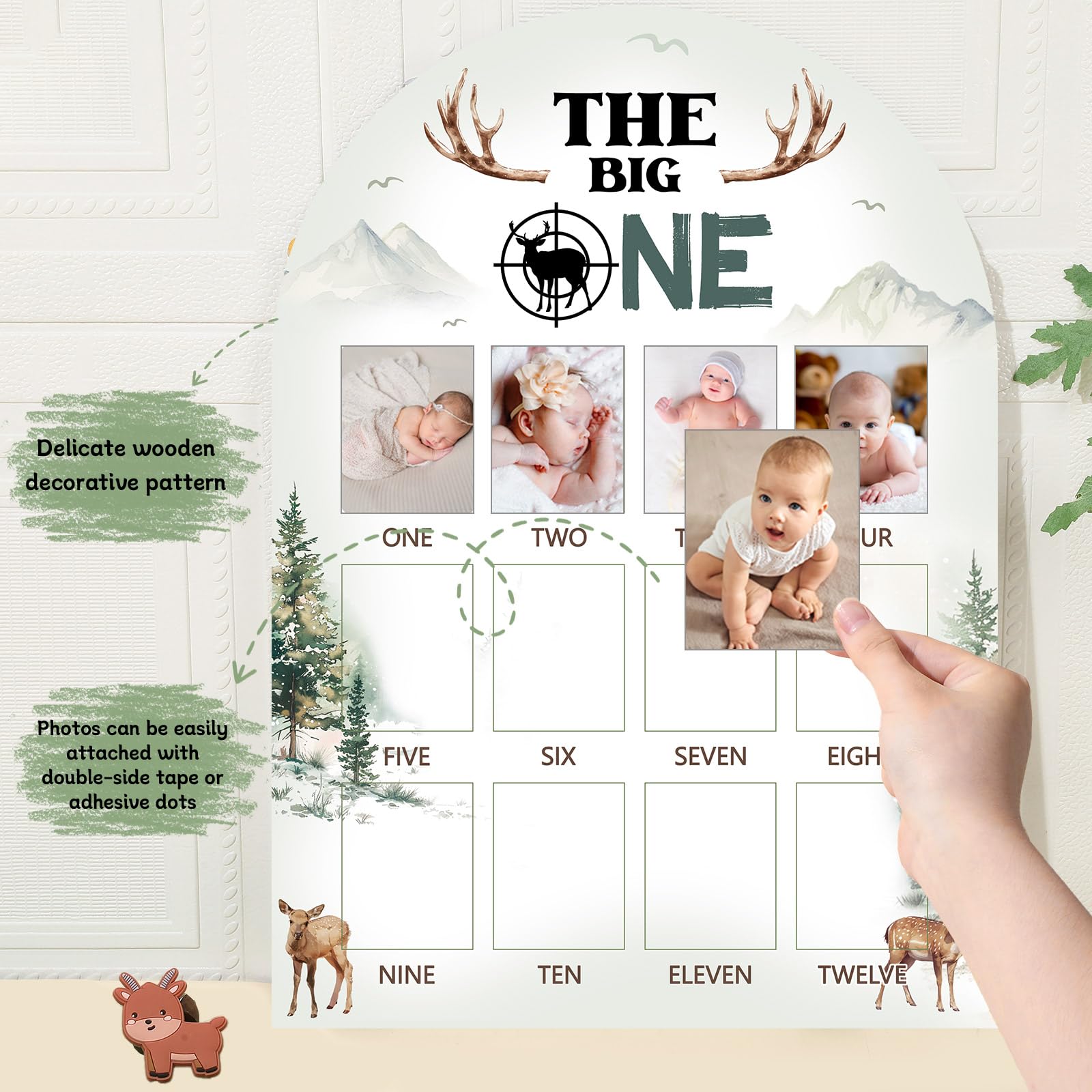 The Big One Photo Board Deer Hunting First Birthday Party Decorations Wooden Board 12 Monthly Milestone Picture Frame One Year Old Wood Sign 1st Birthday Photo Banner for Baby Keepsake Gift Supplies This deer-themed milestone display offers a warm, rustic way to celebrate your baby’s first year, blending woodland charm with a sturdy wooden design. It pairs well with gender neutral first birthday sign themes and adds a sweet touch to nursery décor or party tables for a memorable celebration. Specifications: Material: wood Size: 16.9 x 12 x 0.4 inches Color: colorful Package Includes: 1 x deer-themed milestone board 2 sheets of adhesive dots Ideal for photo walls, birthday setups, and keepsake gifts, this board creates a meaningful visual timeline of your child’s growth. Its versatile style complements first birthday photo banner wooden displays and brings a nature-inspired accent to outdoor, hunting-style, or cabin-themed events.