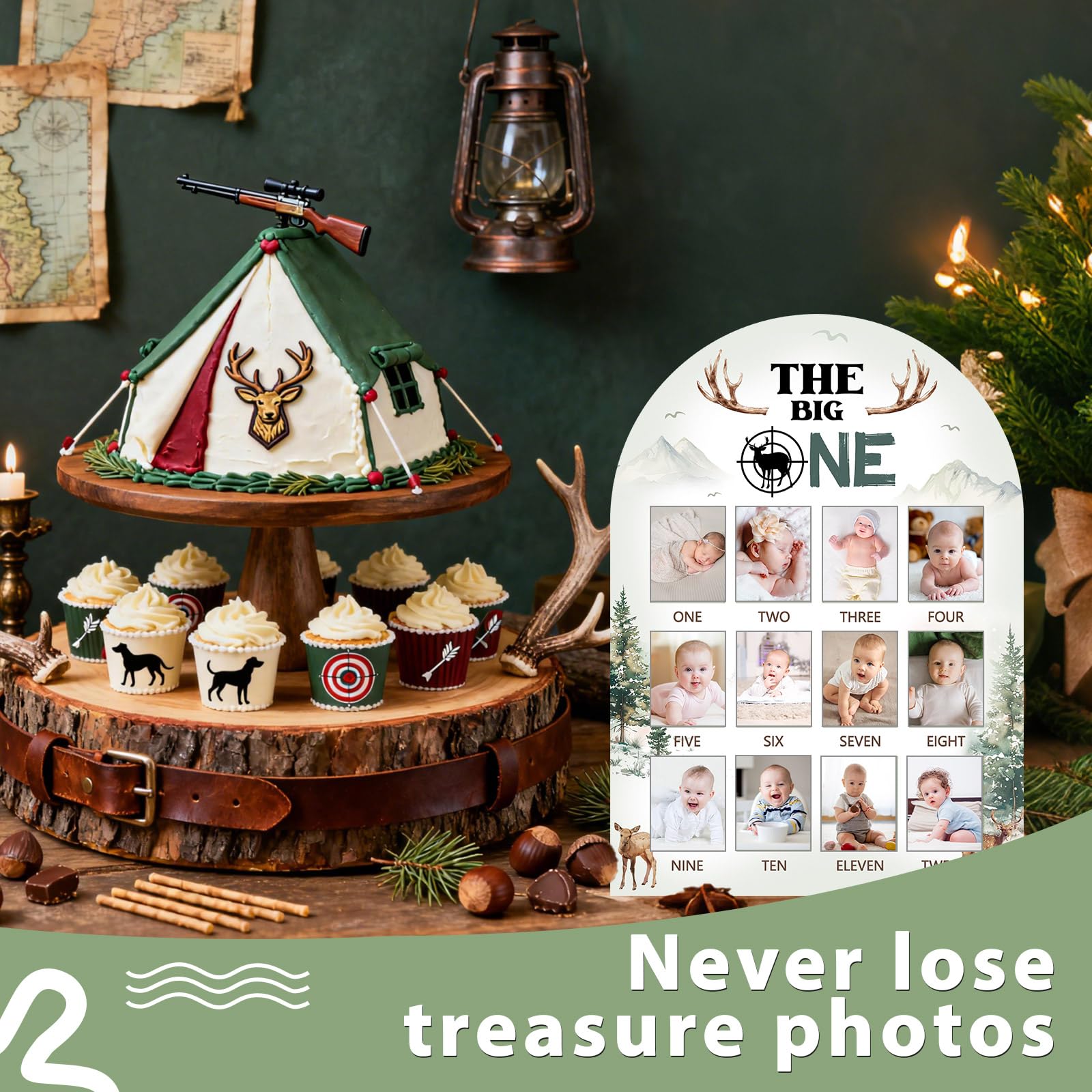 Deer Hunting Themed Photo Frame Decor: Featuring a rustic deer, antler, and forest-inspired layout, this board brings charming deer hunting birthday decor to your celebration. Its warm wood-style design blends well with wilderness birthday decorations, woodland theme party sign setups, outdoor hunting baby decor, nature-themed baby party board ideas, and even cozy farm or cabin birthday prop scenes.