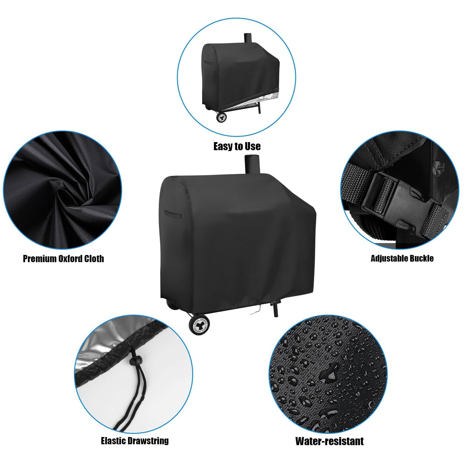 DRAWSTRINGS AND BUCKLE: Elastic cord allows the cover to fit better with the grill. Adjustable buckle on the grill for better extra stability, so you don't have to worry about the impact of windy weather.