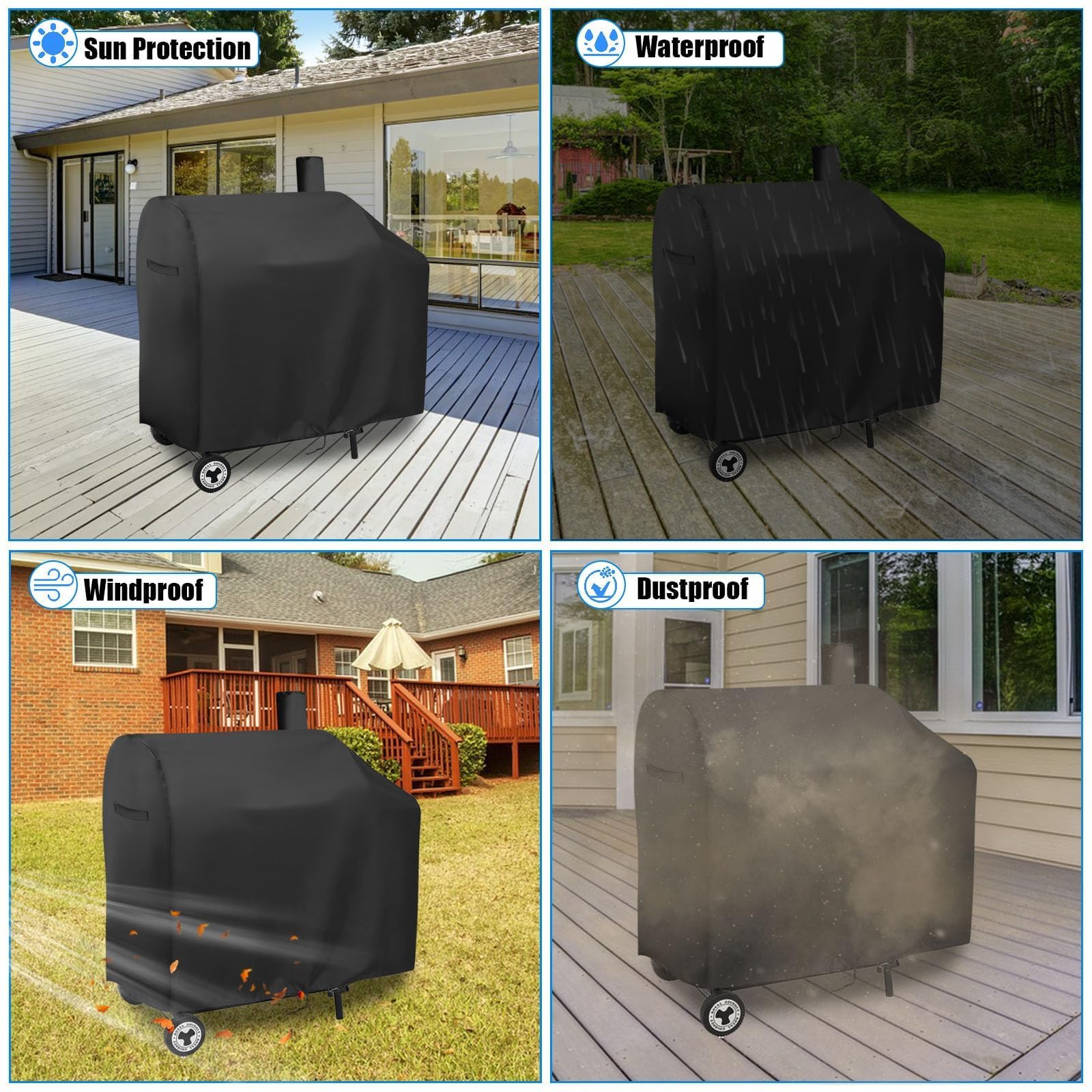Product Description Our premium outdoor grill covers provide complete weather protection for various gas, electric, and charcoal grills. Designed with precision sizing and durable materials, these covers ensure your grilling equipment remains clean, dry, and ready for use in all seasons. Product Features PRECISION SIZING OPTIONS: Available in multiple dimensions to perfectly fit popular grill models. HEAVY-DUTY CONSTRUCTION: Crafted from durable Oxford fabric with waterproof PU/PVC coating for superior resistance against UV rays, tearing, cold cracking, and weather damage. SECURE FIT SYSTEM: Features adjustable drawstrings, elastic cords, and reinforced buckles to prevent displacement during windy conditions while ensuring snug coverage. USER-FRIENDLY DESIGN: Equipped with dual handles for easy installation/removal and ventilation features to reduce condensation buildup under the cover. COMPREHENSIVE PROTECTION: Shields grills from rain, snow, dust, pet hair, and sun exposure, significantly extending equipment lifespan and maintaining pristine condition. ♥ Warm Tips ♥ ✓ Always measure your grill’s dimensions before selecting a cover size ✓ Ensure the grill is completely cool before applying the cover ✓ Secure all buckles and drawstrings tightly in windy conditions ✓ Clean with water and air dry thoroughly before long-term storage Product Specification ✓ Material: Oxford Fabric with PU/PVC Coating ✓ Features: Waterproof, UV Resistant, Adjustable Drawstring, Multi-Size Compatibility Package Include 1 × Andacar Outdoor Grill Protective Cover