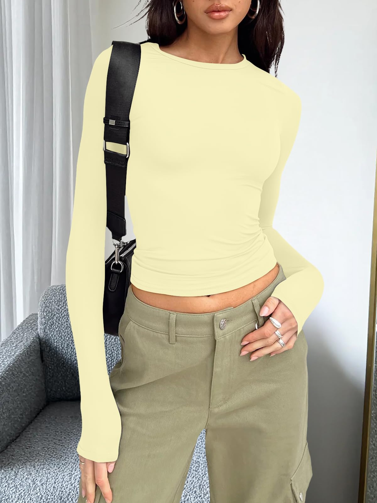 Design: Cropped and stretch fitted style,crew neck, tight underscrubs layer,you can wear it regularly or fold it up like a crop top,cute,slim fit,casual y2k style fashion