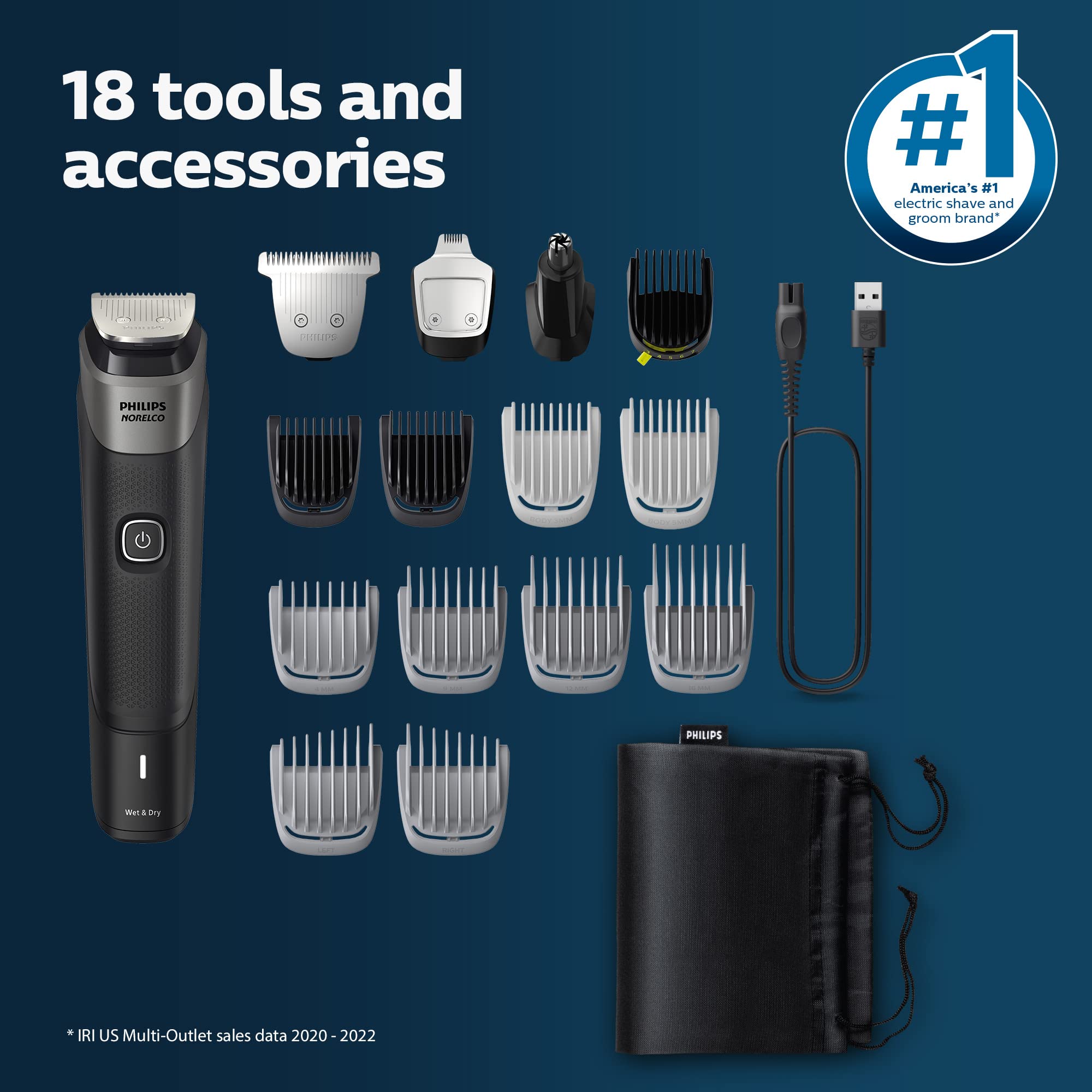 The Philips Norelco Multigroom 5000 Series is the all-in-one trimmer for maximum versatility. It boasts titanium-coated self-sharpening steel blades that never need blade oil, stay as sharp as day 1, and don't rust. Create clean, straight lines for a perfect finish and craft your own personal look with a durable hair trimmer for men with 18 quality tools for styling your face, hair, head and body, including below-the-belt grooming. The Multigroom 5000 also features the extra-wide hair trimmer for easy body grooming across large areas, as well as the adjustable 3-7mm comb for a personalized look. With the nose and ear hair trimmer attachment, you can easily remove unwanted nose and ear hair. The long-lasting lithium-ion battery provides up to 3 hours of runtime for long life and maximum power. The no-slip rubber grip improves comfort and control. For easy cleaning, remove the heads from the handle and rinse them under the tap. USB-A charging cable included (wall power adapter not included).