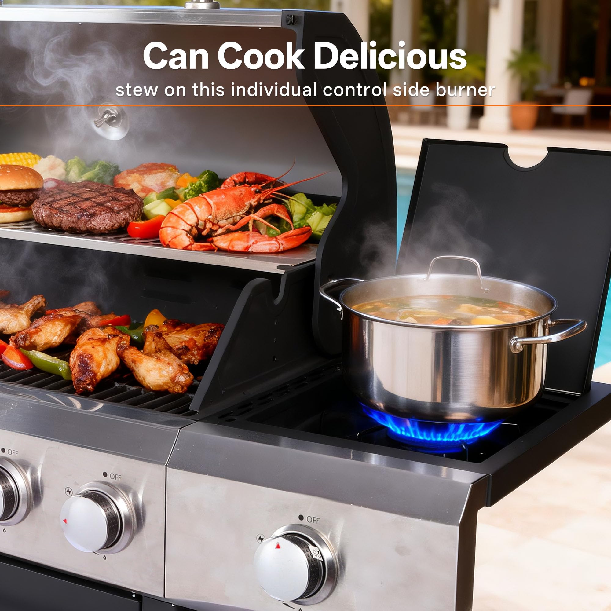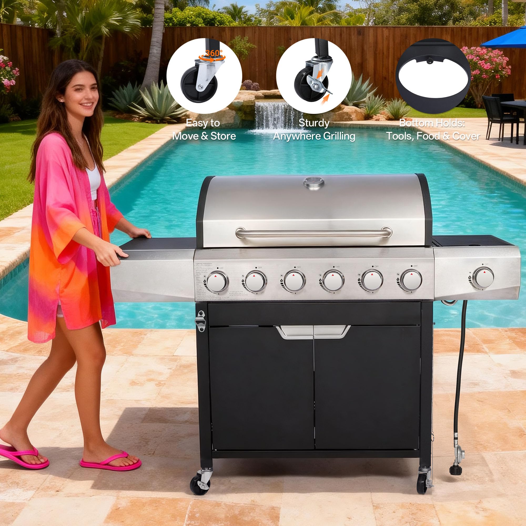 Powerful Burners: Engineered for robust performance, this Gas Grill delivers 68,500 BTUs across six stainless steel burners for uniform searing, plus an 8,500 BTU side stove burner—making it a true gas grill with side burner for sauces or boiling water. With piezoelectric ignition and precision knobs, this propane grill excels in outdoor cooking, ensuring flawless flame control every time